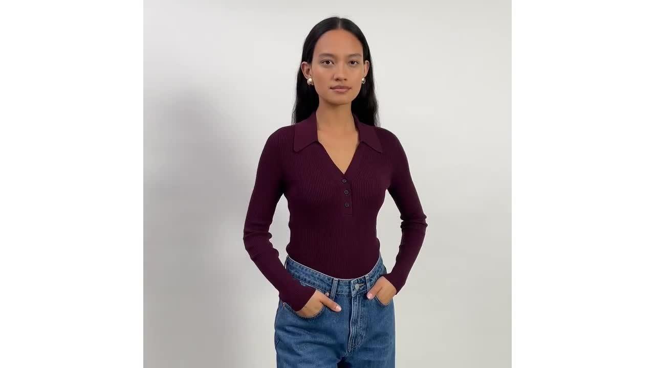 This ribbed V neck Button Top is knitted with bamboo thread, it's cut in a slim-fitting shape, and designed with a pointed collar and tonal buttons.