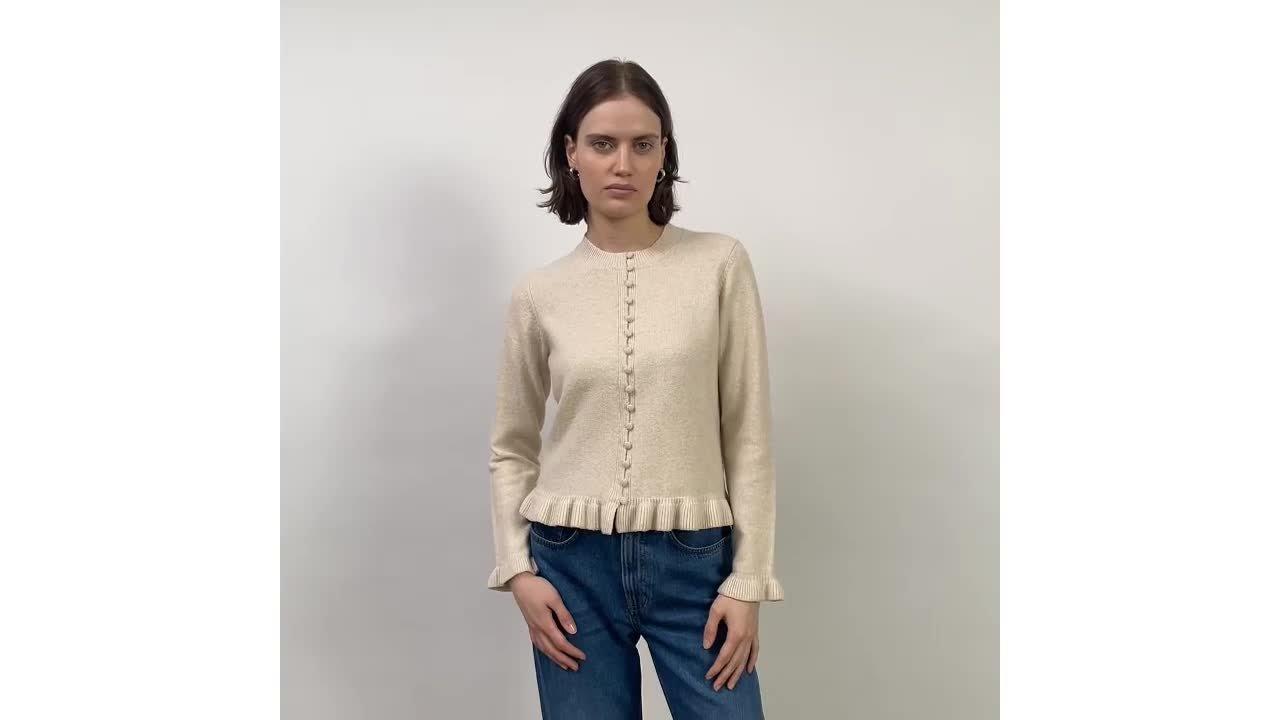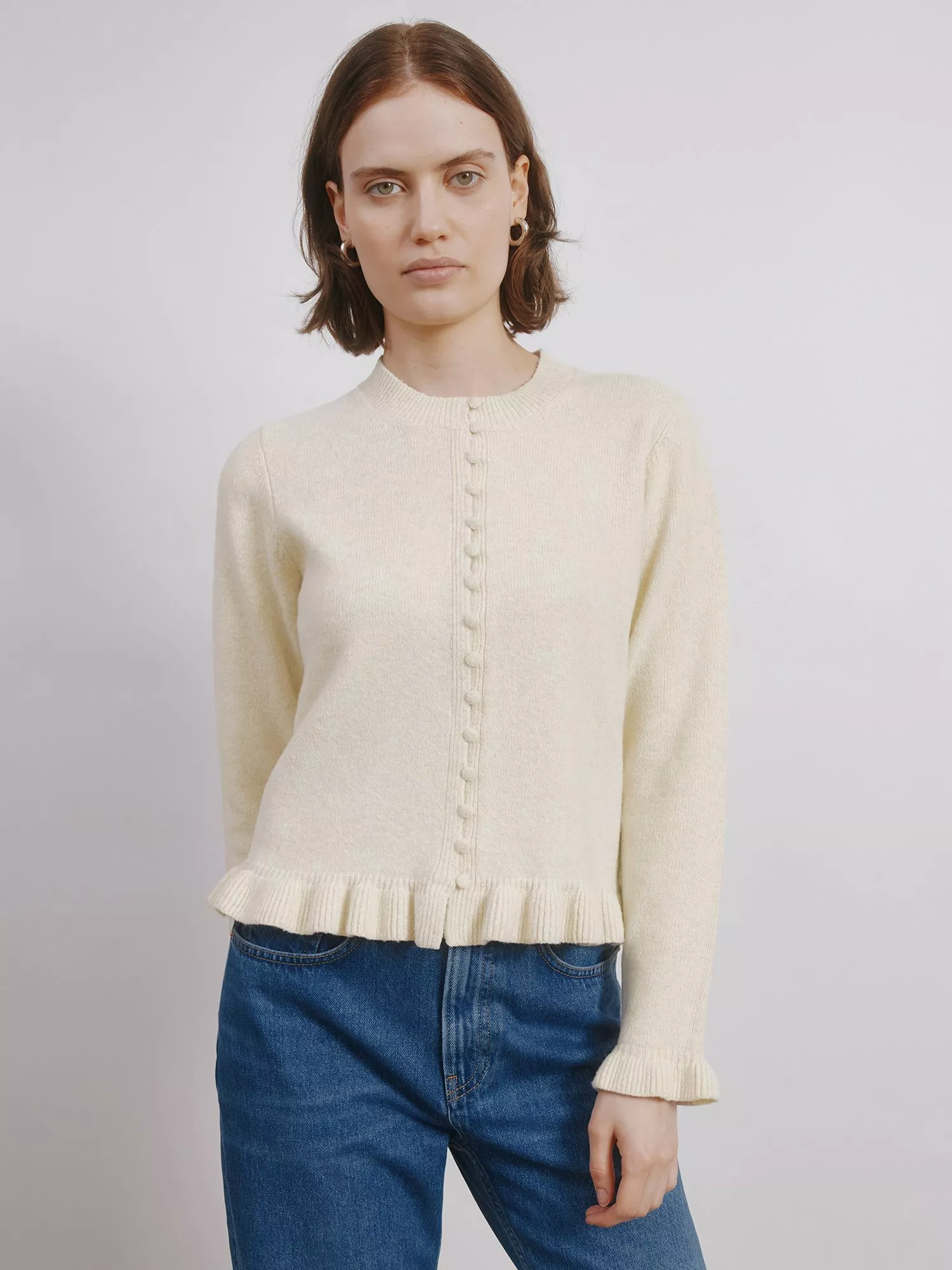 A soft knit cardigan with a round neck and long sleeves in a soft wool blend. This cardigan has a ruffle trim detailing at the hem and cuff and a multi-button front fastening.