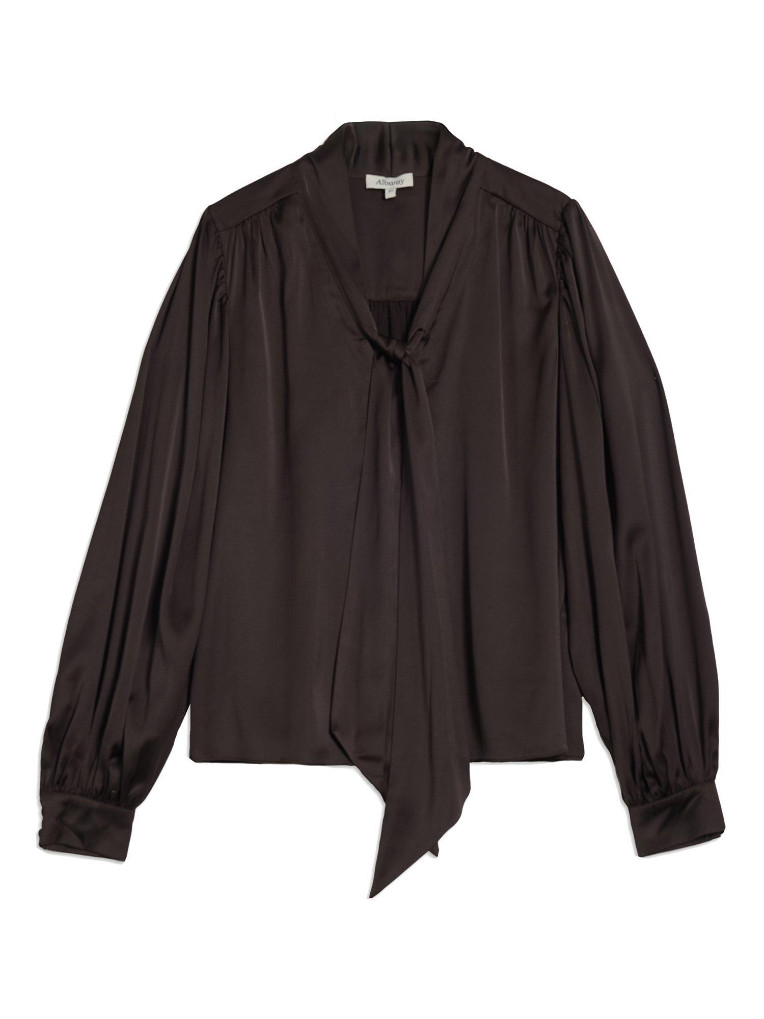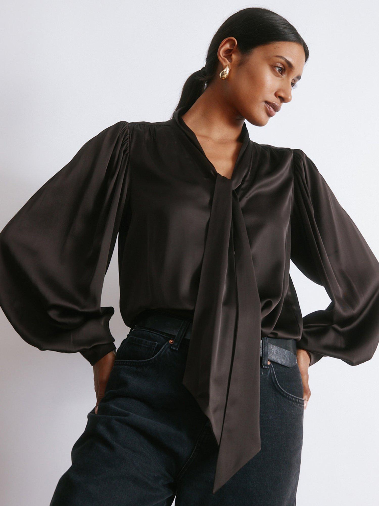 This stylish blouse is crafted from a rich satin. The blouson sleeves provide a soft, flowing silhouette, while the V-neck flatters the neckline. An adjustable tie neck detail makes it versatile for both professional and casual occasions. Comfortable and stylish, this blouse is designed to complement your wardrobe with ease and confidence.