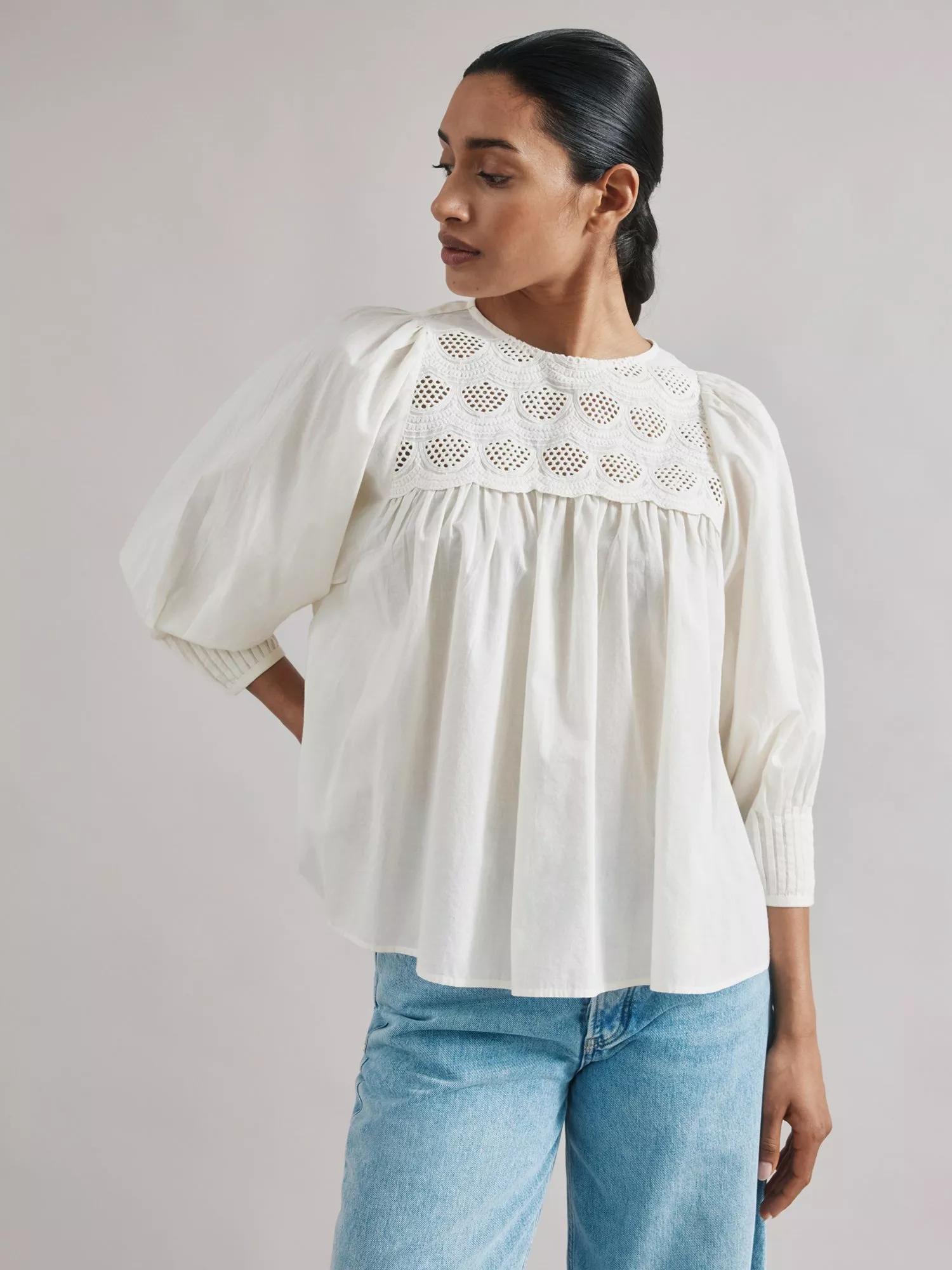 Featuring a round neck with a scallop embroidered panel at the front. This top is 3/4 sleeved with a gentle blouson and pin tuck detail on sleeve opening. A perfect summer top to be styled with jeans or shorts.