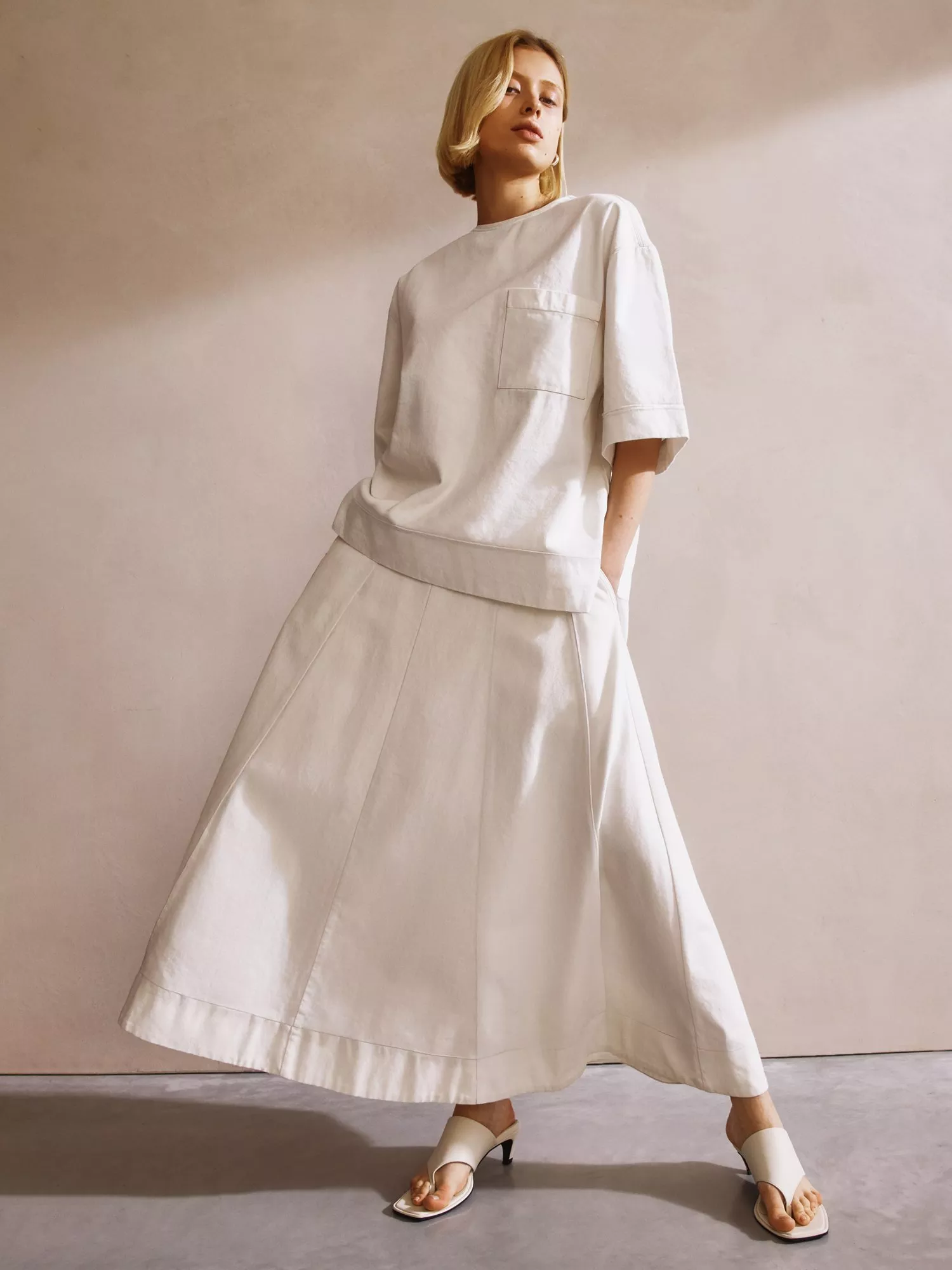 An expertly crafted denim midi skirt. Designed with a seam detail, this A-line skirt exudes contemporary elegance. Worn with casual summer basics, this skirt will elevate your wardrobe.
