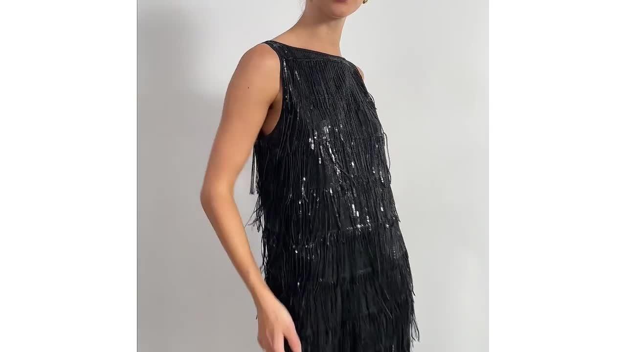 This elegant column shift dress features fringe sequins that shimmer and move beautifully with every step. A simple design but maximum impact.