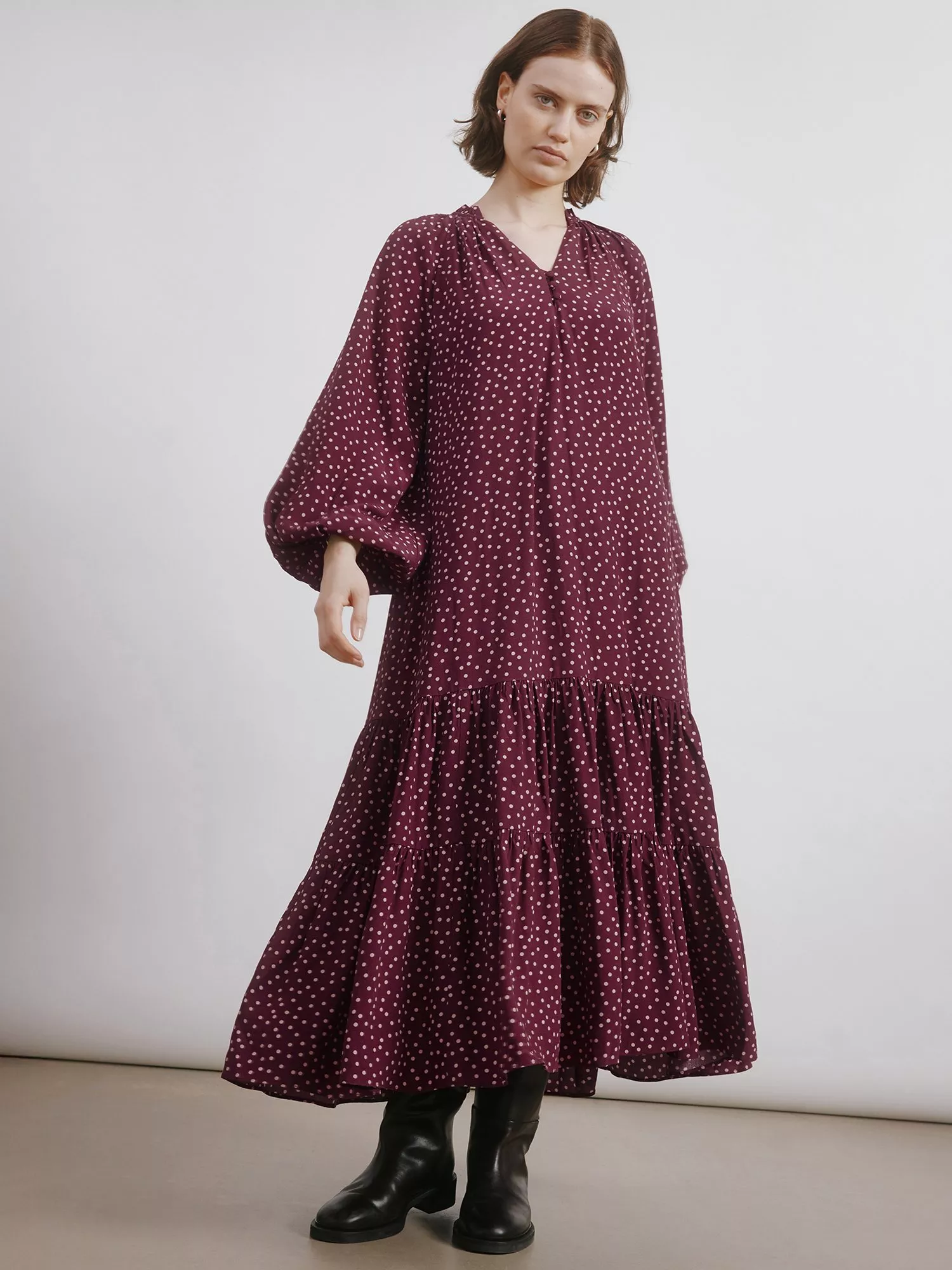 This spot volume maxi dress provides both comfort and style. Featuring a V-neck with button front detail and blouson sleeves. The soft tiers through the body make this dress the perfect transitional style, ensuring optimal wearability year-round.
