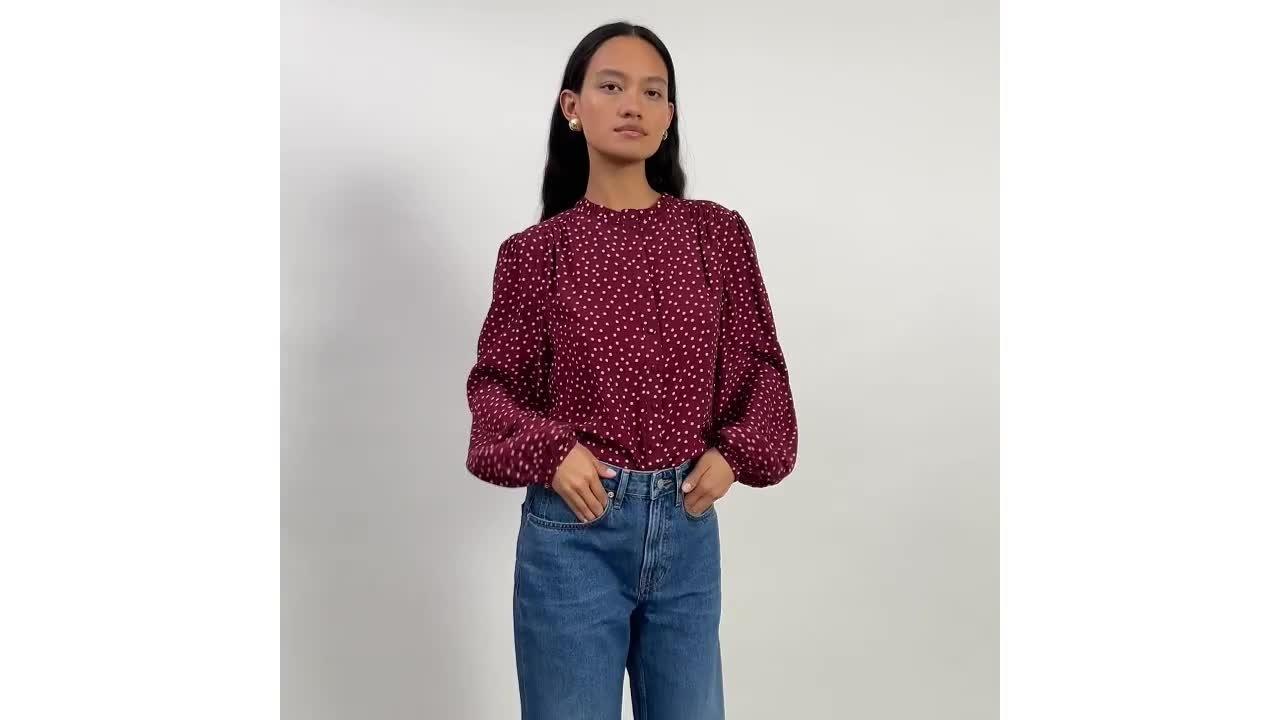 A long-sleeved blouse designed with a frill stand collar and button front. The sleeves gently bloused to the cuff with a button fastening. In a modern spot print, wear tucked in to accentuate the waist or loose for a relaxed look.