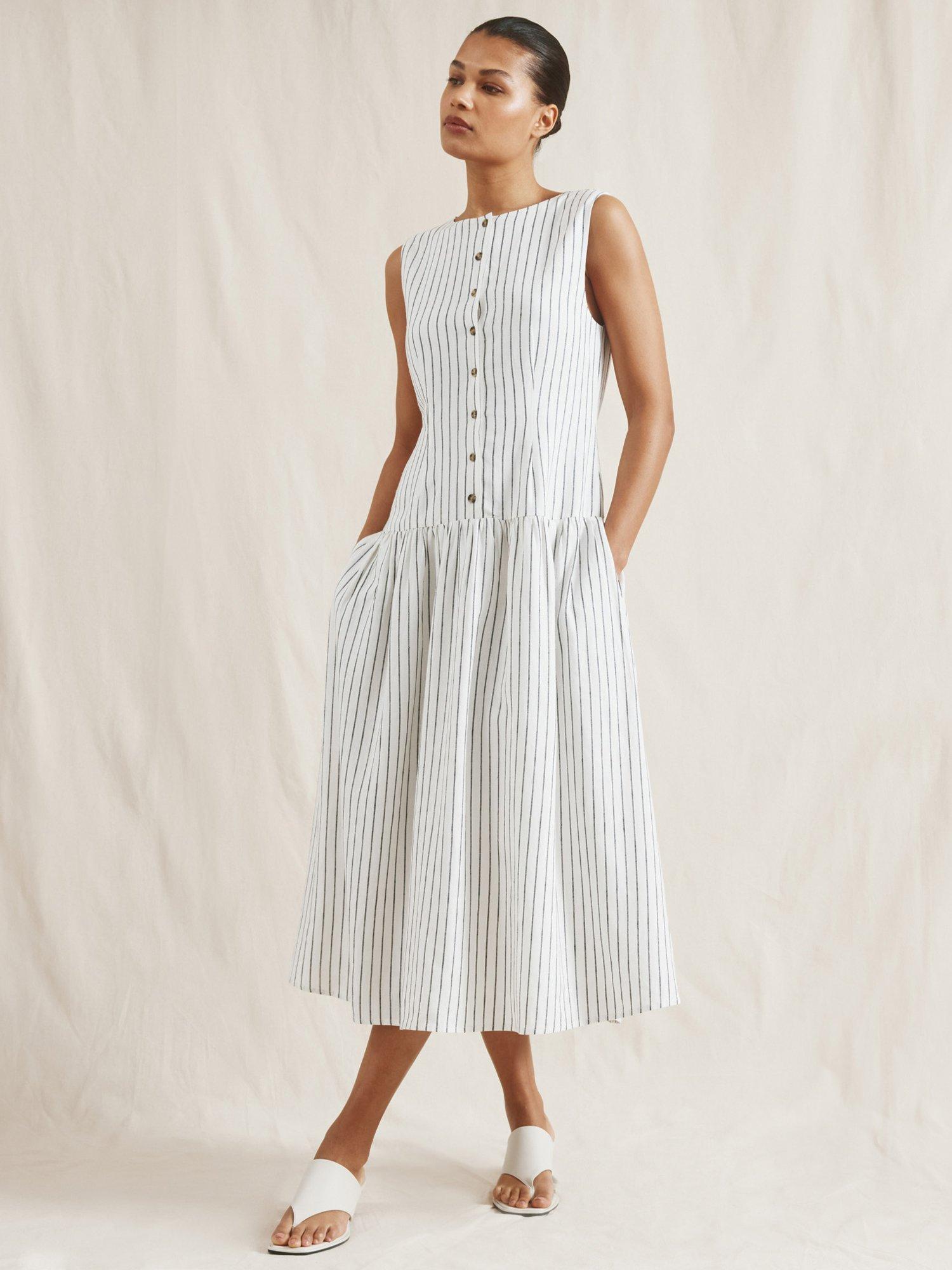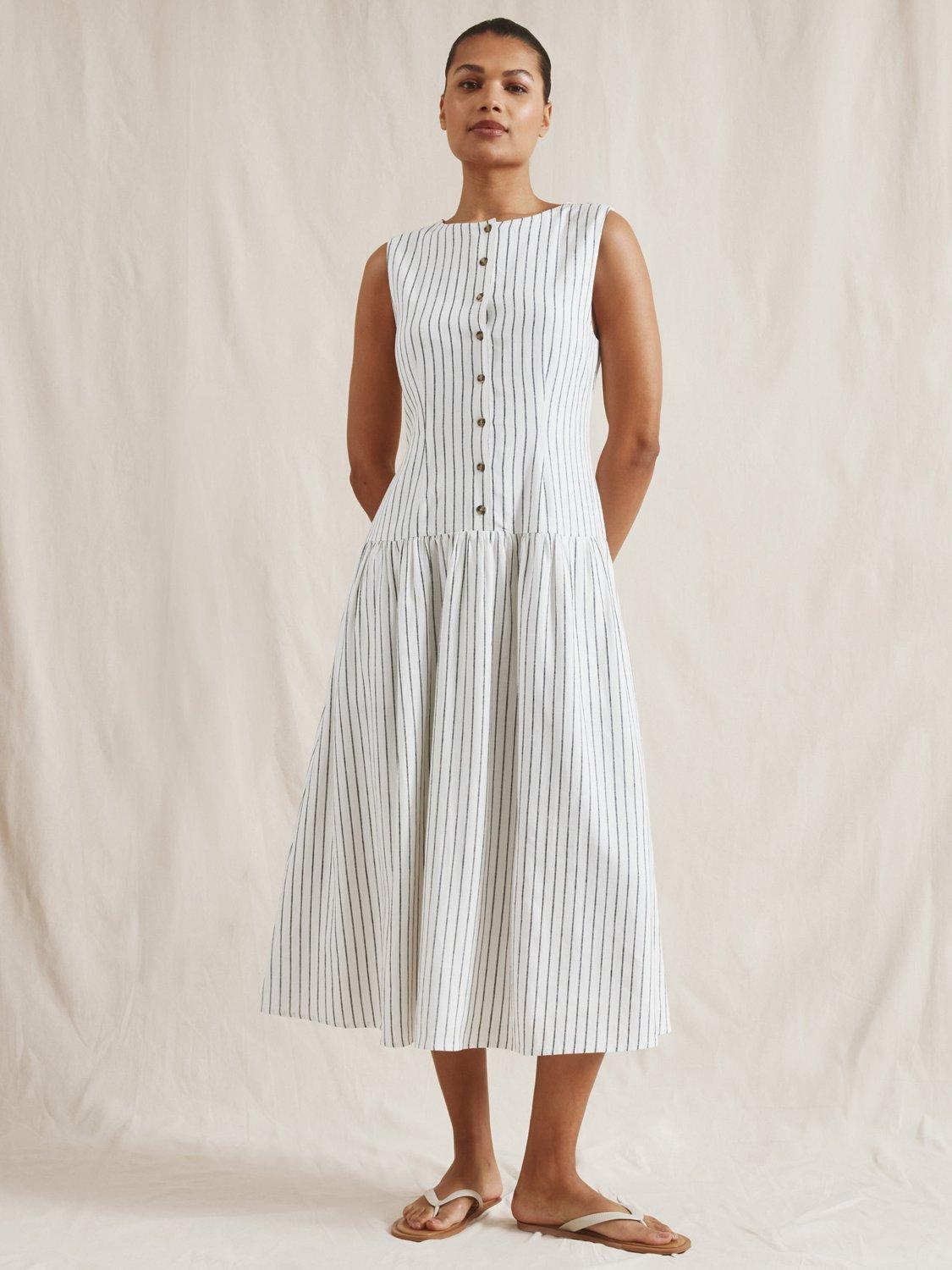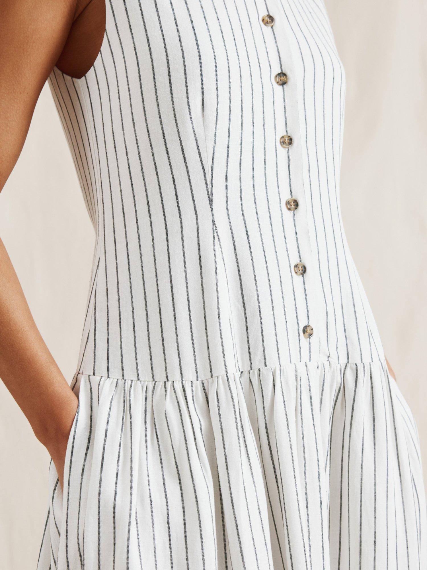 The Stripe Drop Waist Button Dress showcases a delicate stripe pattern and a dropped waistline, complemented by button front detailing and convenient side pockets.