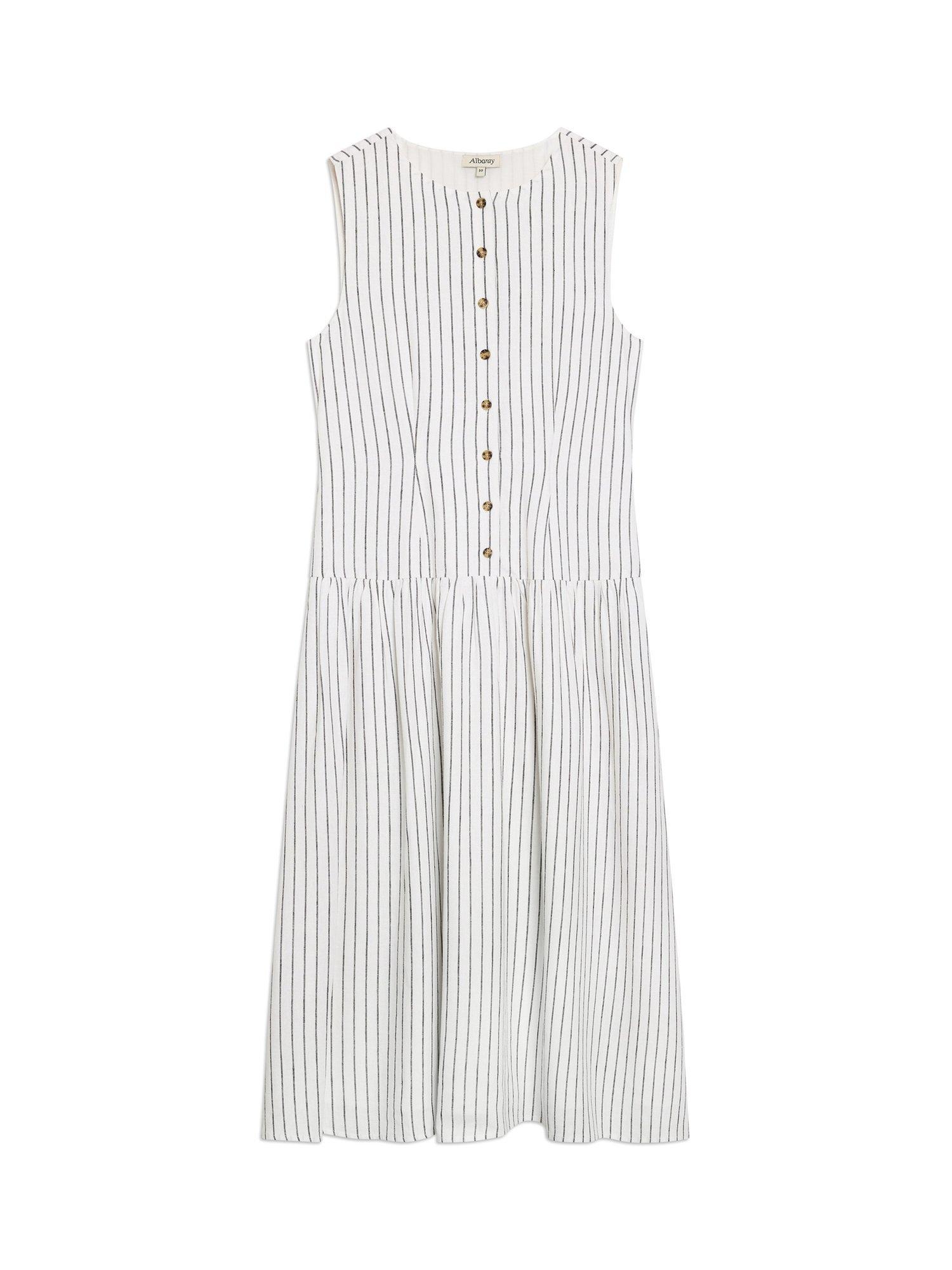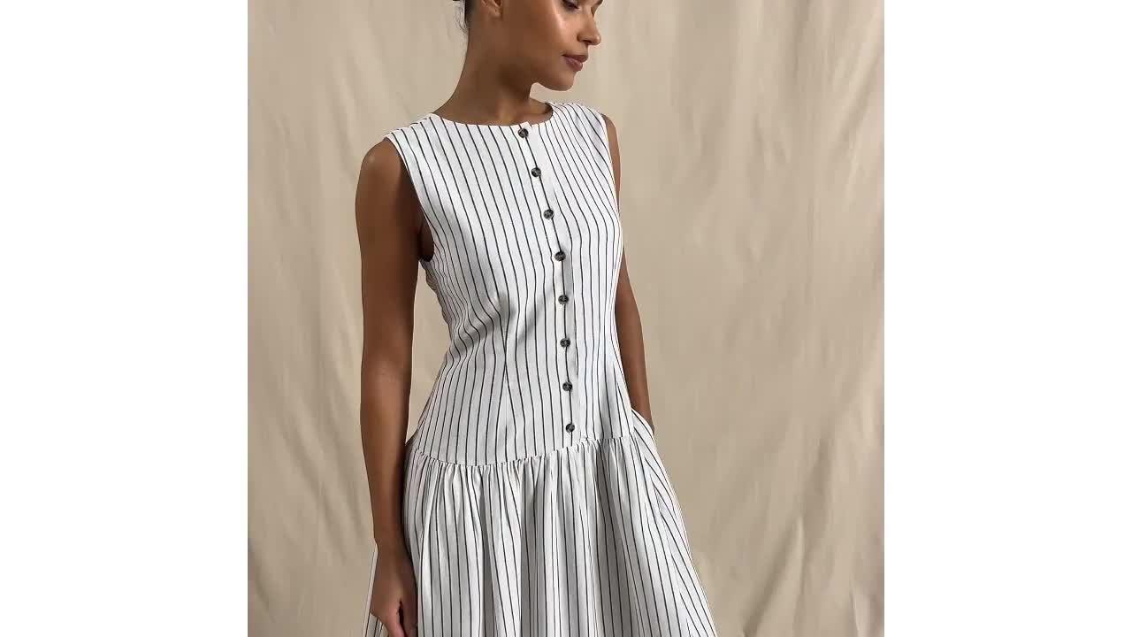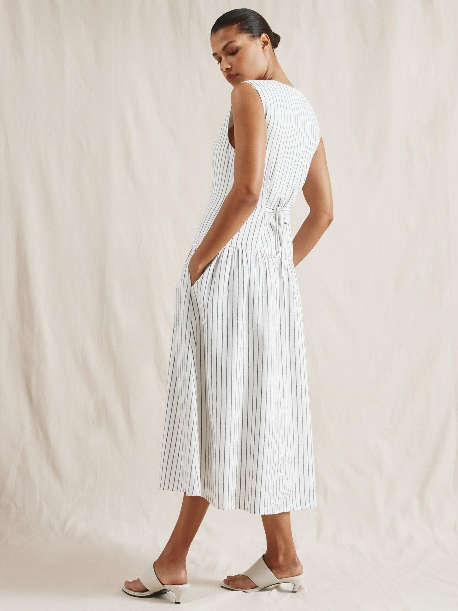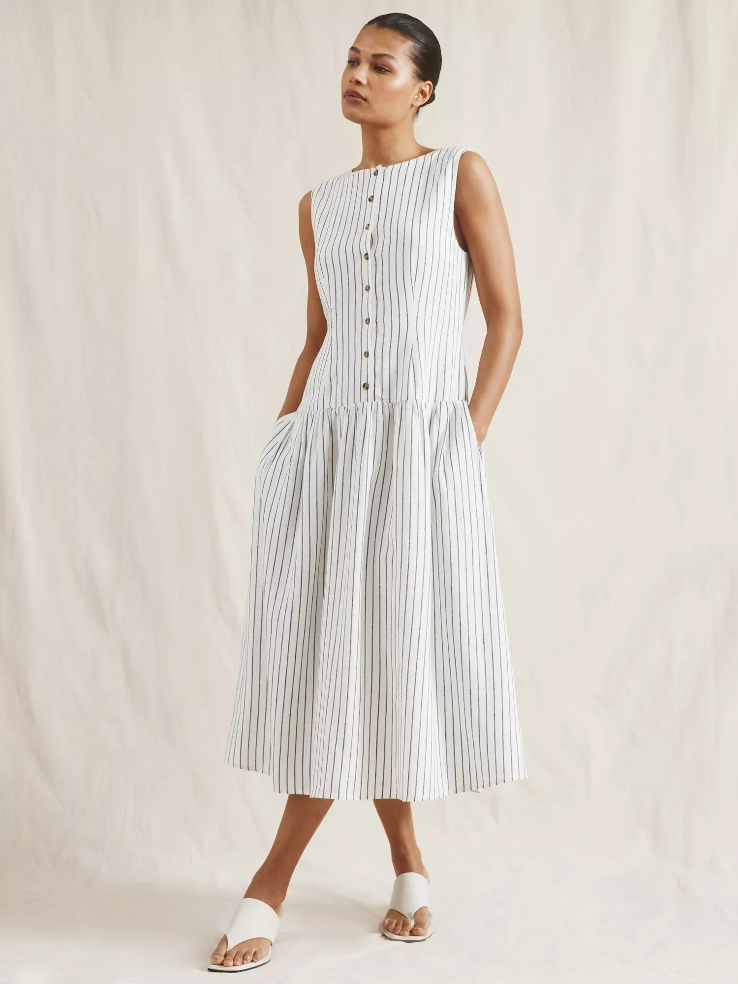 The Stripe Drop Waist Button Dress showcases a delicate stripe pattern and a dropped waistline, complemented by button front detailing and convenient side pockets.