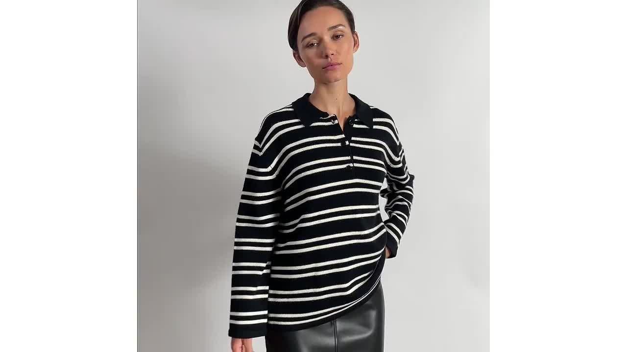 This top offers a relaxed twist on the traditional polo, featuring contrasting stripes, a contrasting collar, long sleeves, and a subtle concealed placket for a clean finish.