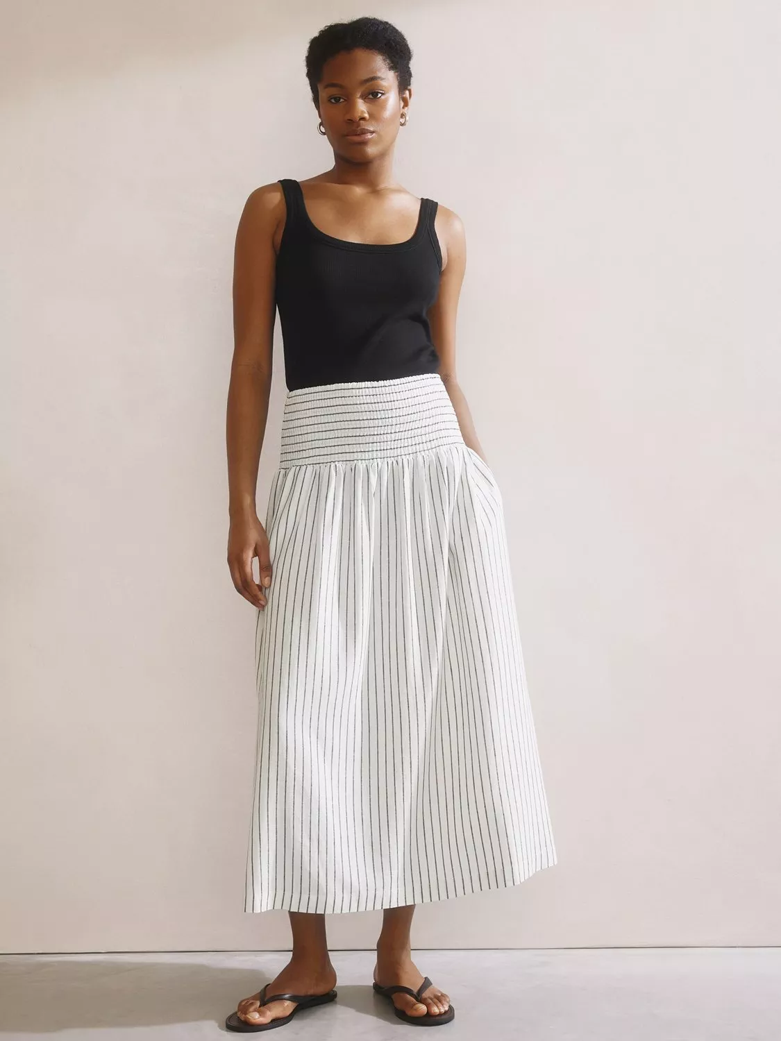 A cool summer midi skirt with smocked waistband and side pockets in a soft linen mix in a classic summer stripe. This skirt works as well with Jersey tops.