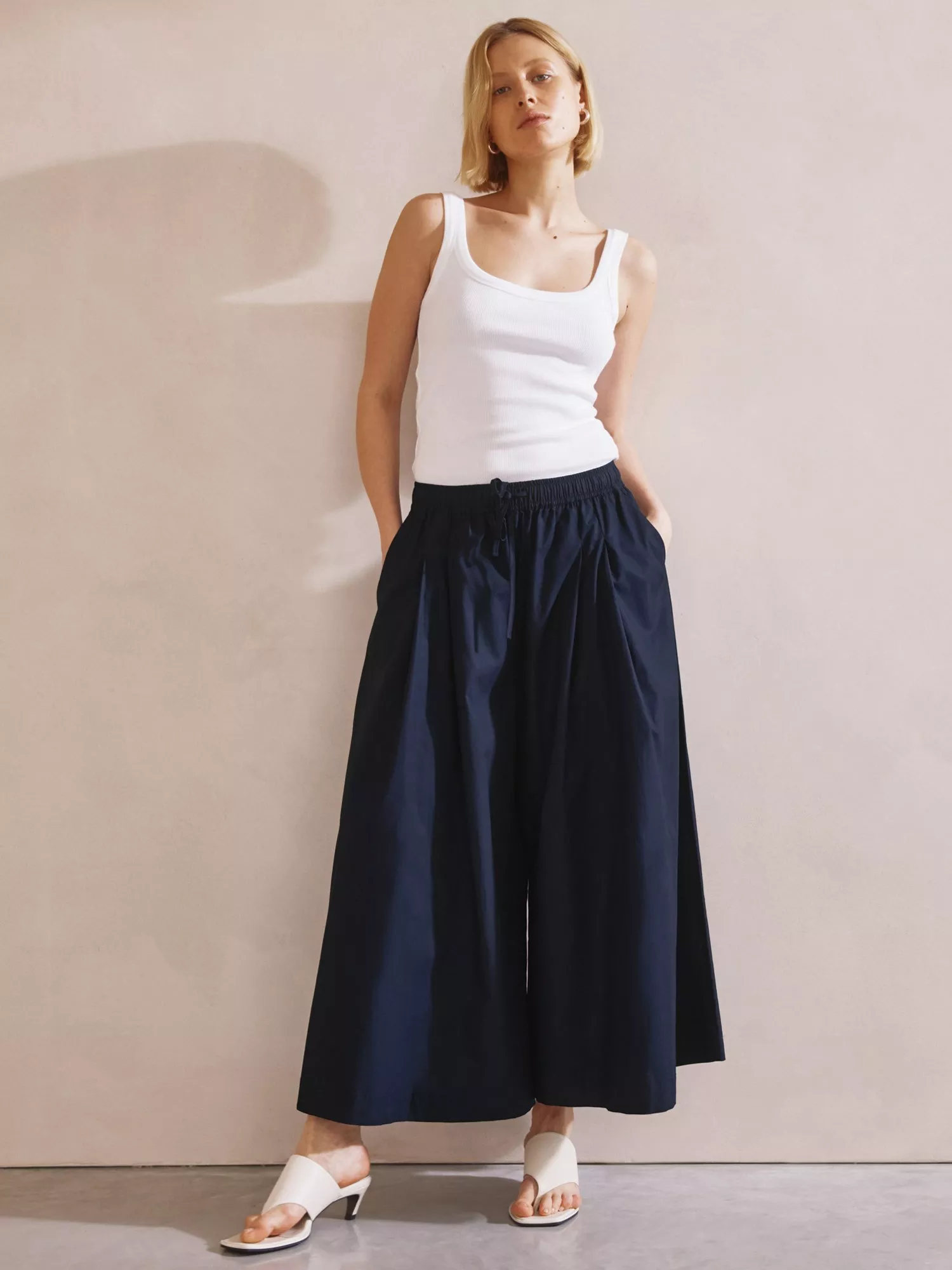 Upgrade your wardrobe with these Super Wide Leg Culottes, crafted from high-quality organic cotton. Designed with a comfortable elastic back waistband and tie detail. Featuring front pleats and side pockets. These culottes will elevate any outfit while offering optimal comfort and functionality.
