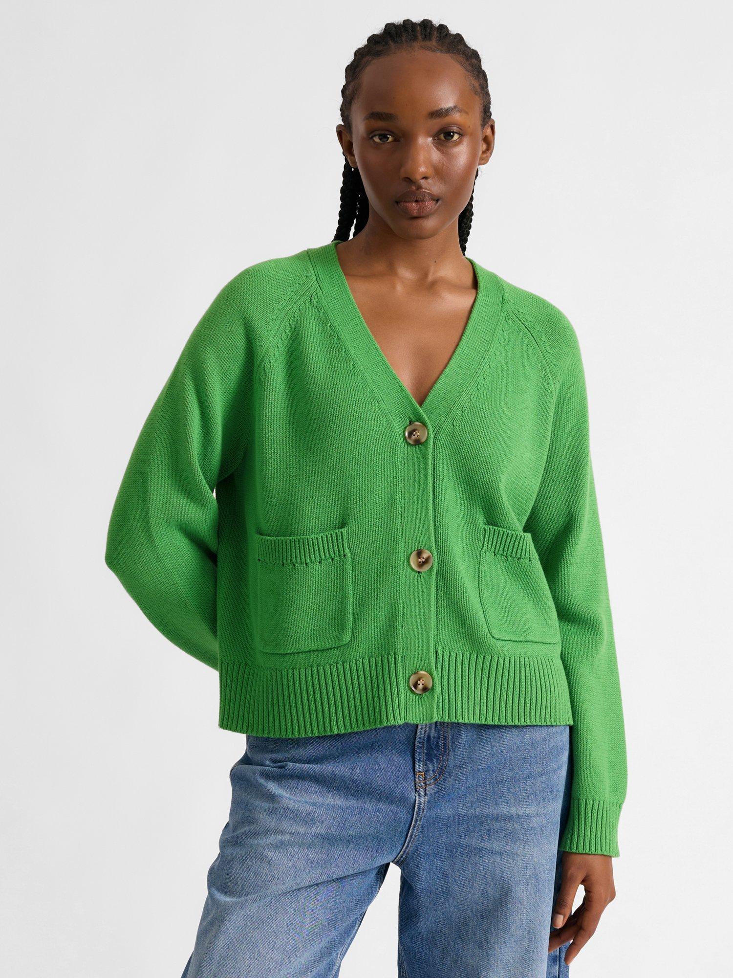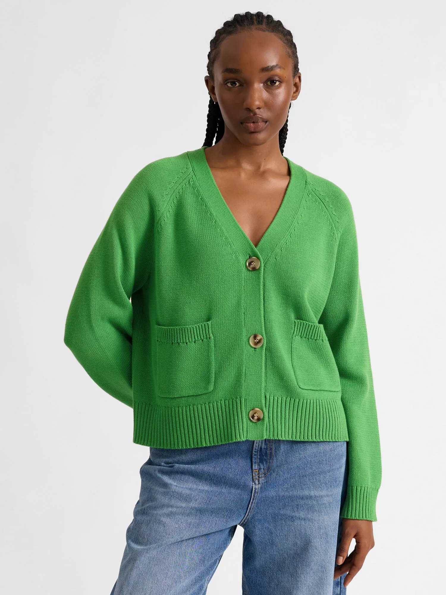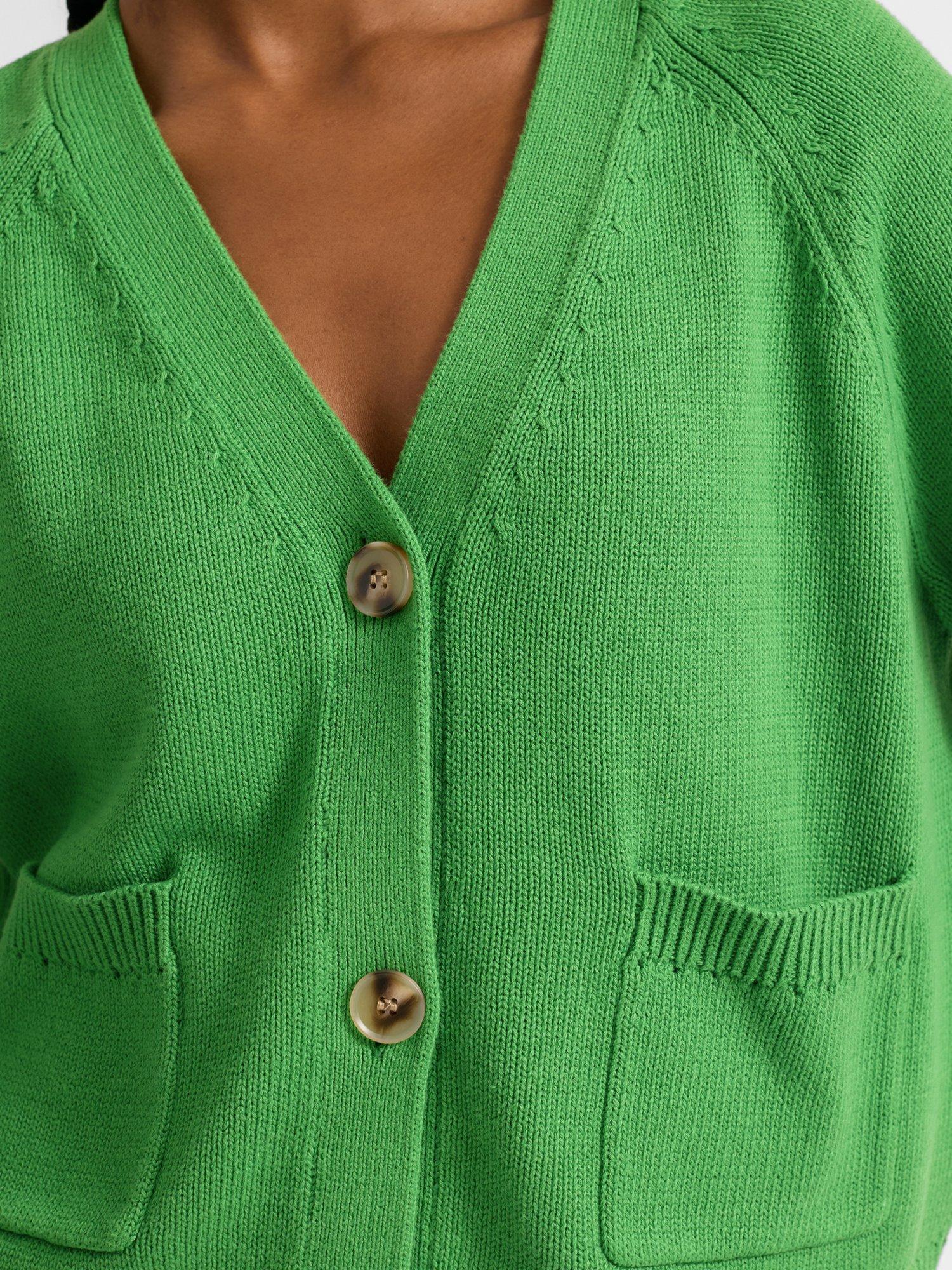 This cardigan is designed with a versatile V-neck for standalone or layered wear. Its patch pockets feature delicate pointelle detailing. Whether worn alone or as a stylish layer, this cardigan effortlessly blends fashion-forward design with practical elegance.