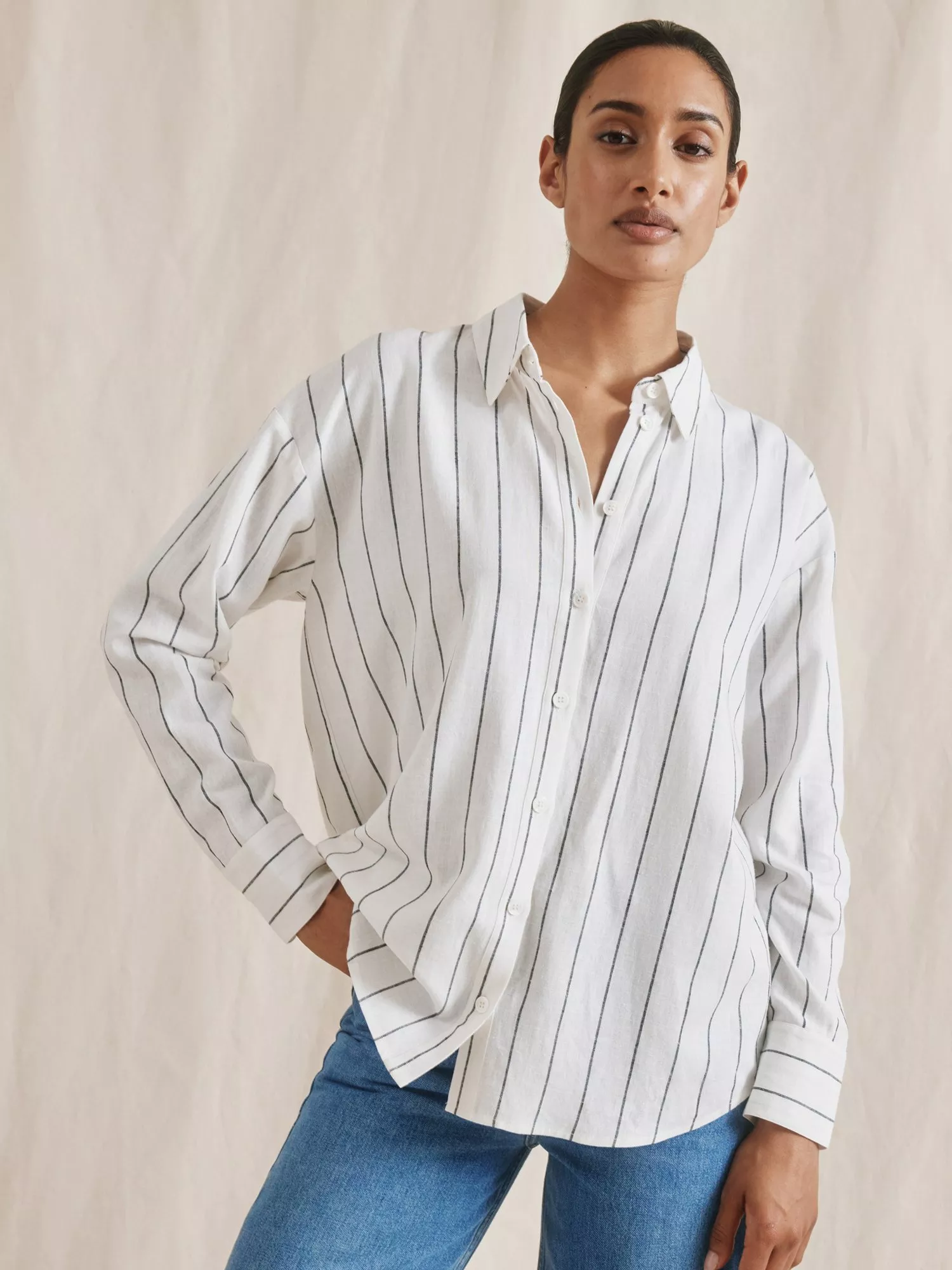 A relaxed, over sized shirt featuring a curved hem, and deep cuffs. Crafted from a linen mix in classic stripe, this shirt is the perfect addition to any summer wardrobe.