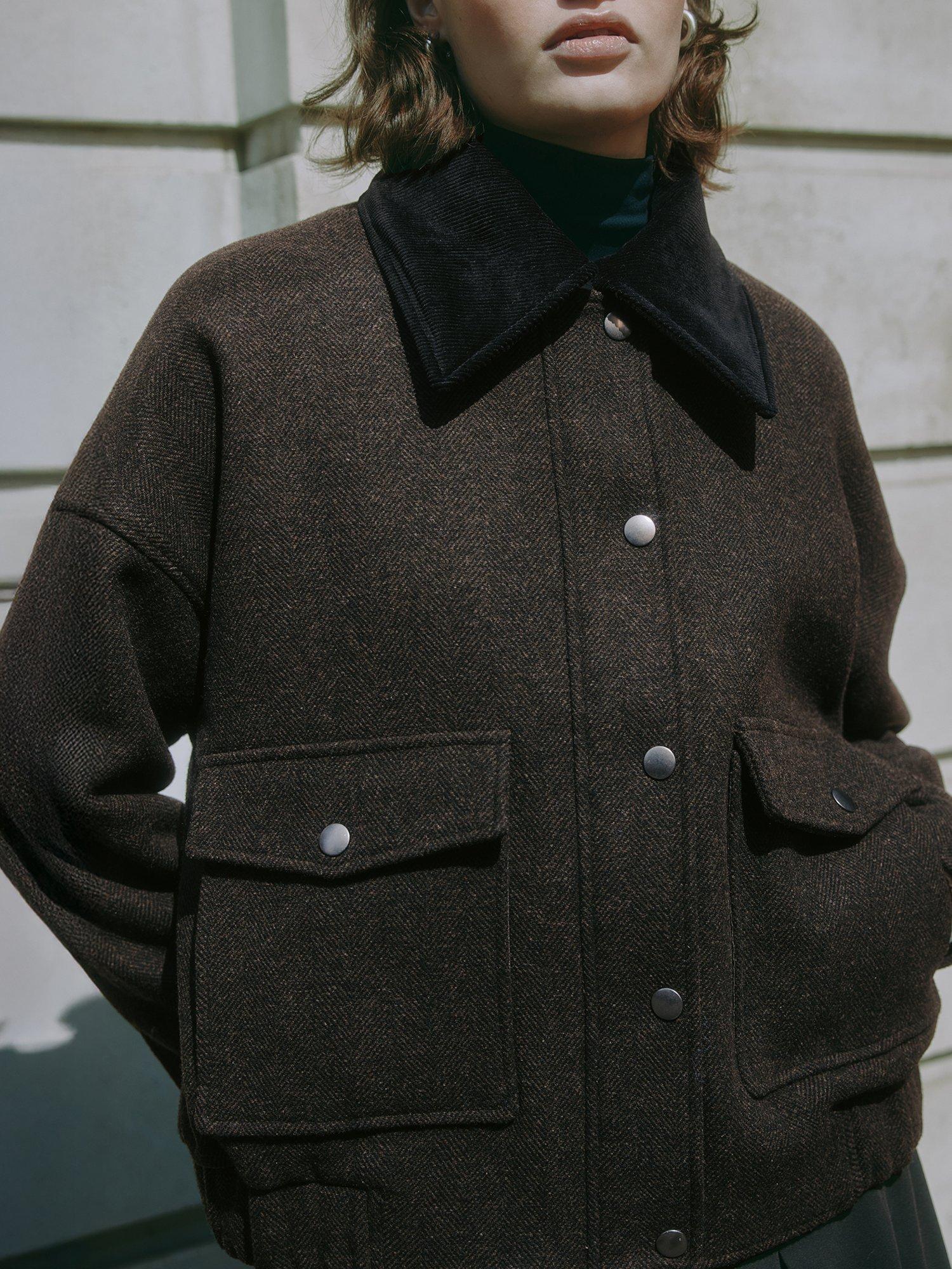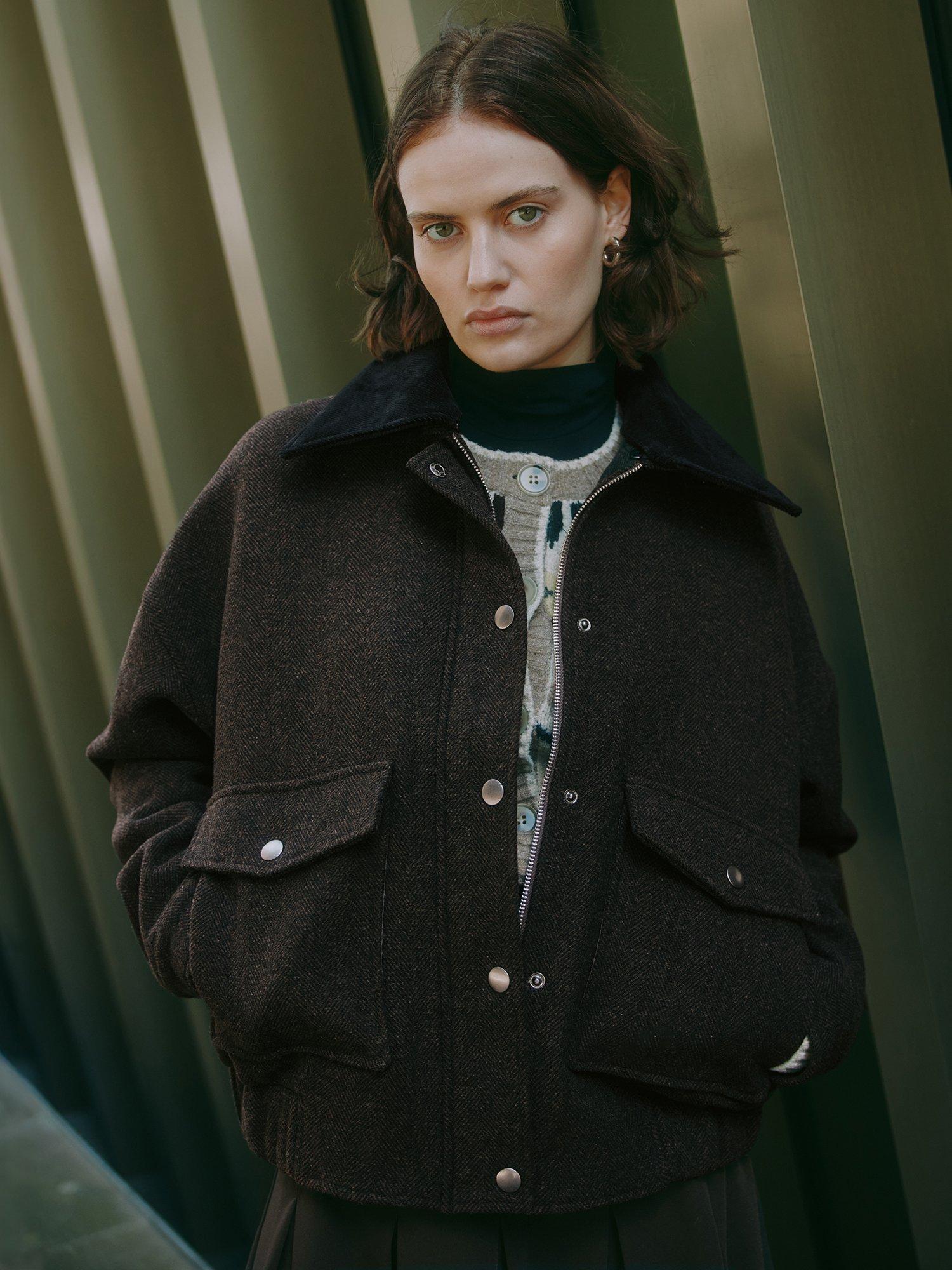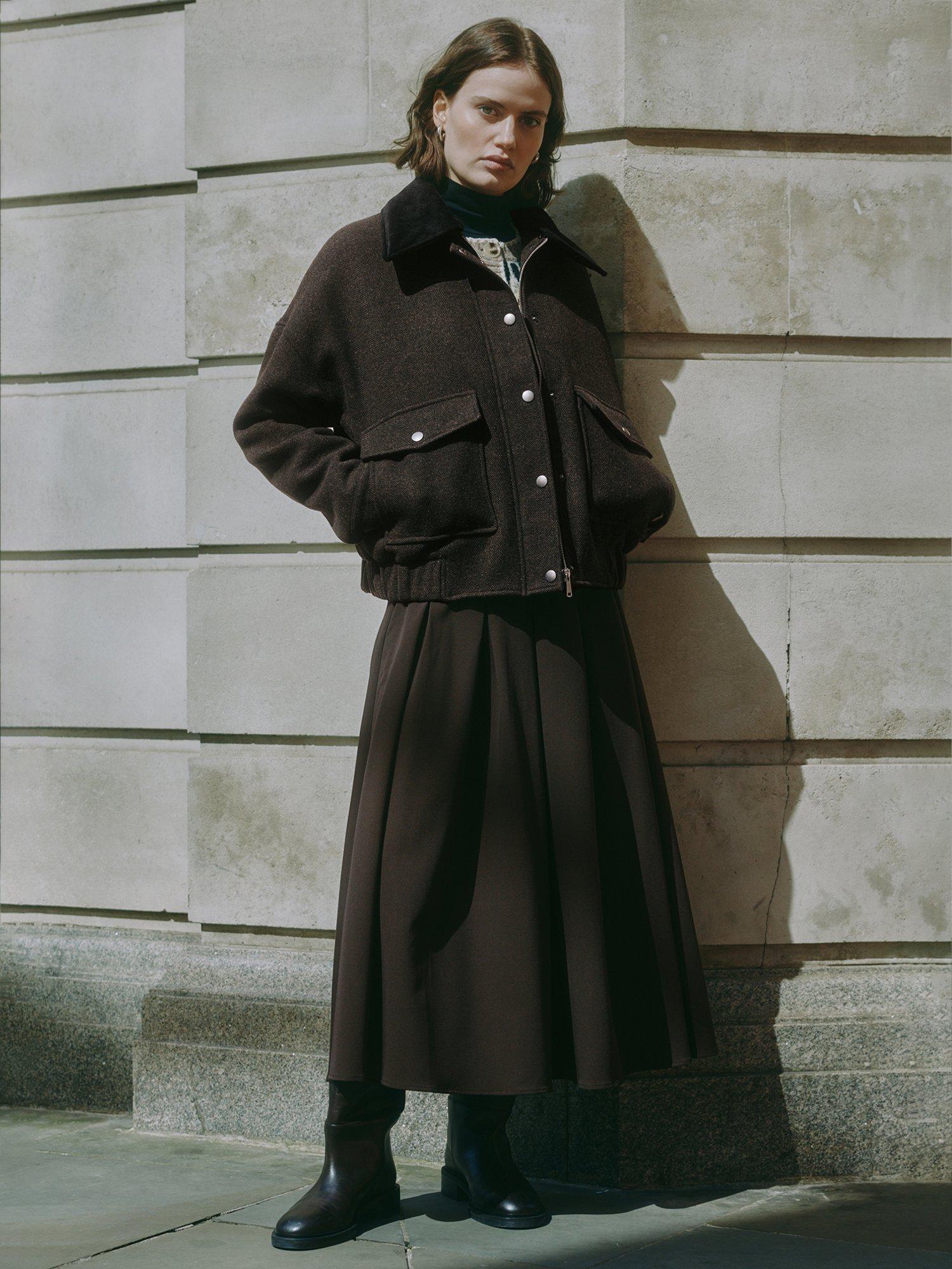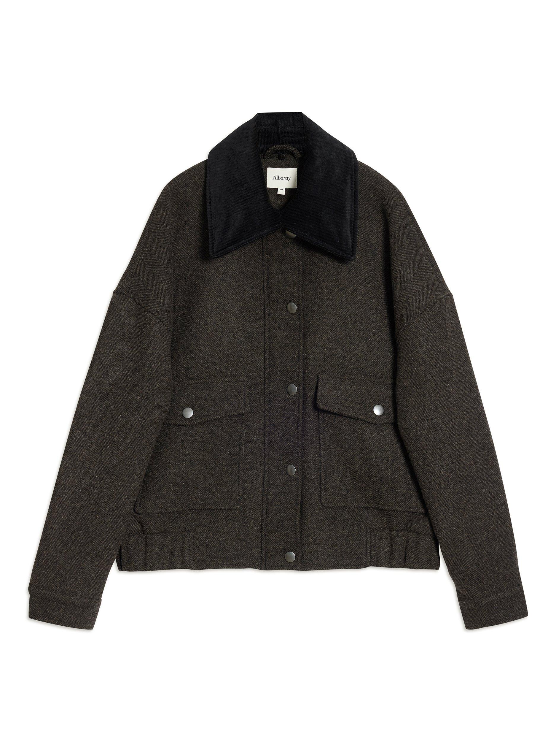 The standout style of the season, this classic relaxed-fitting bomber jacket is crafted in chocolate flannel. Boasting the signature boxy look, this jacket features a removable collar, patch pockets, and convenient popper fastening. The self-covered elastic cuffs and hem add a touch of comfort and style, making it a versatile choice. Fully lined for extra warmth and sophistication as the seasons change.