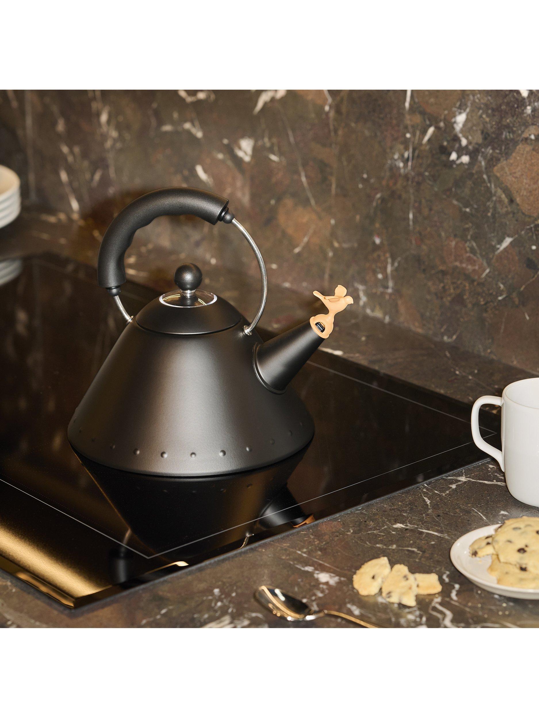 In celebration of the 40th anniversary of the Michael Graves 9093 kettle, Alessi has launched an elegant all-black version. Made of stainless steel, the kettle's signature is its small bird-shaped whistle perched on the spout. The kettle features a magnetic steel bottom, making it compatible with all stovetops, including induction cooking.