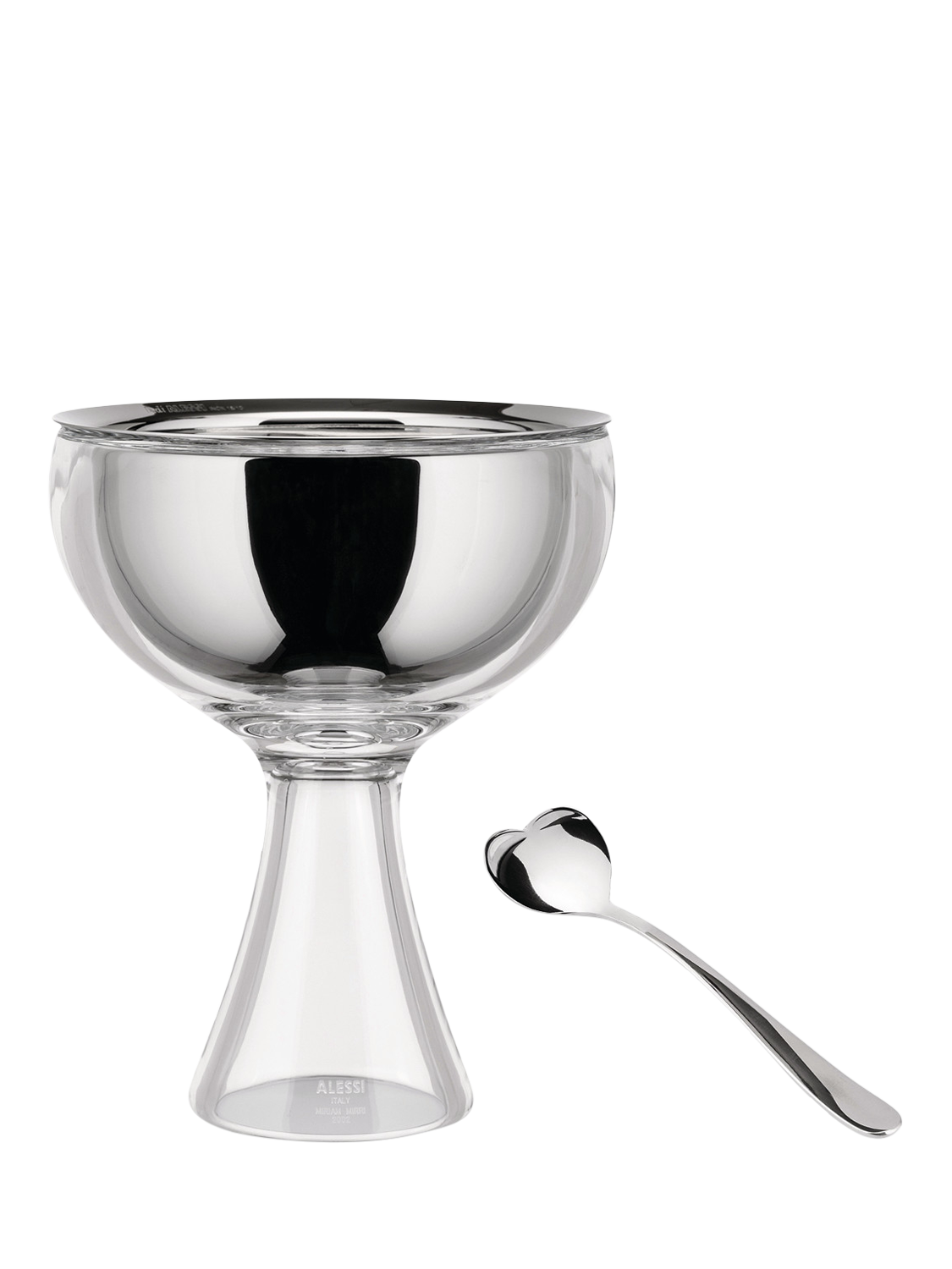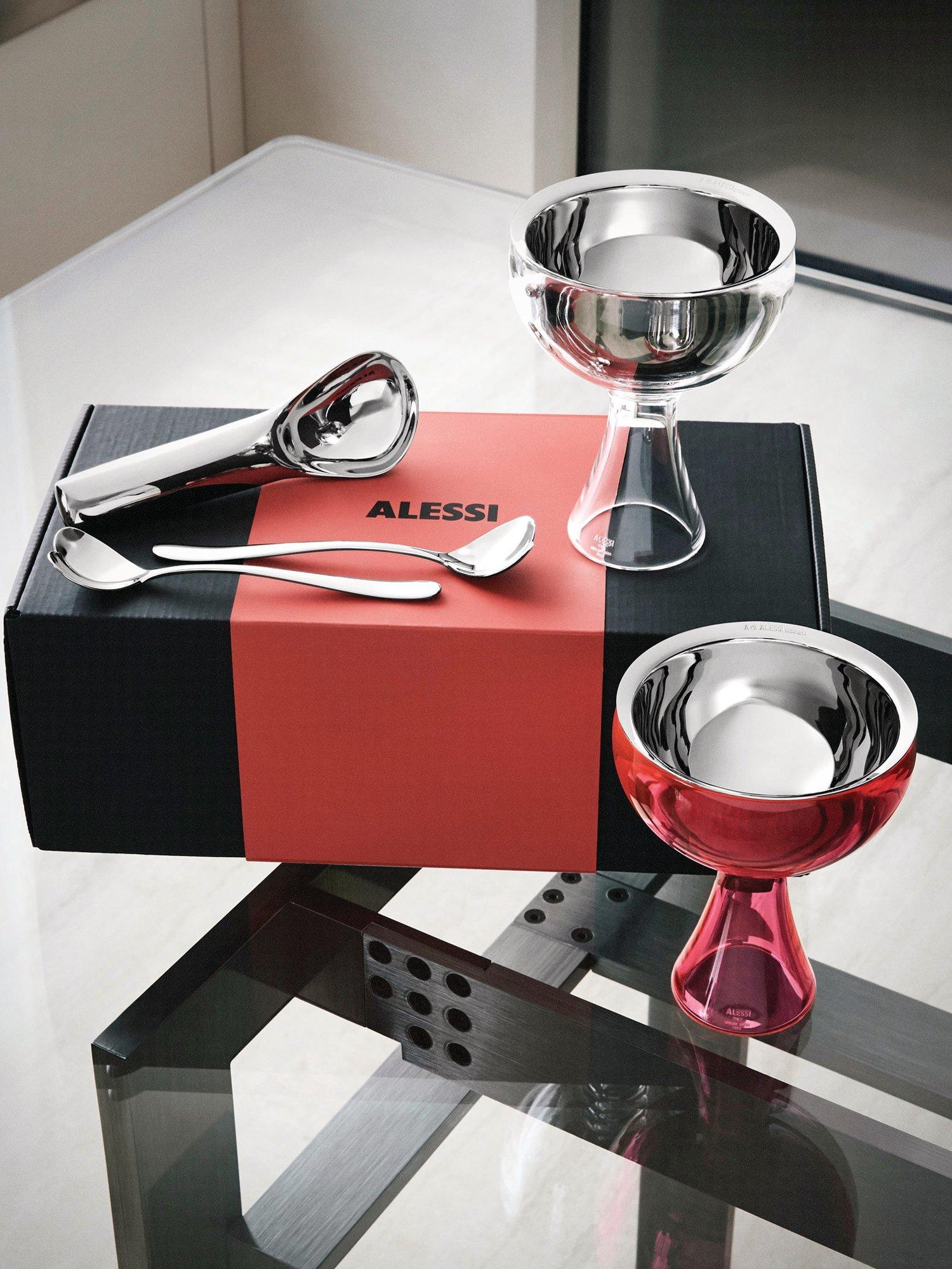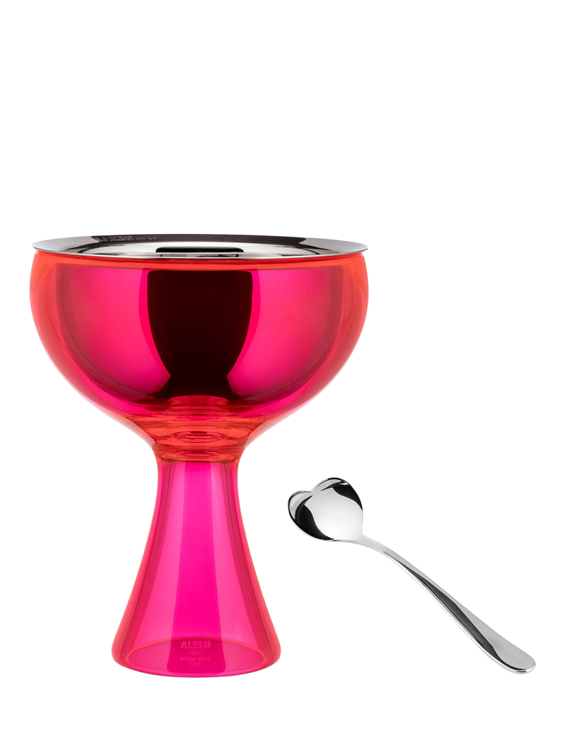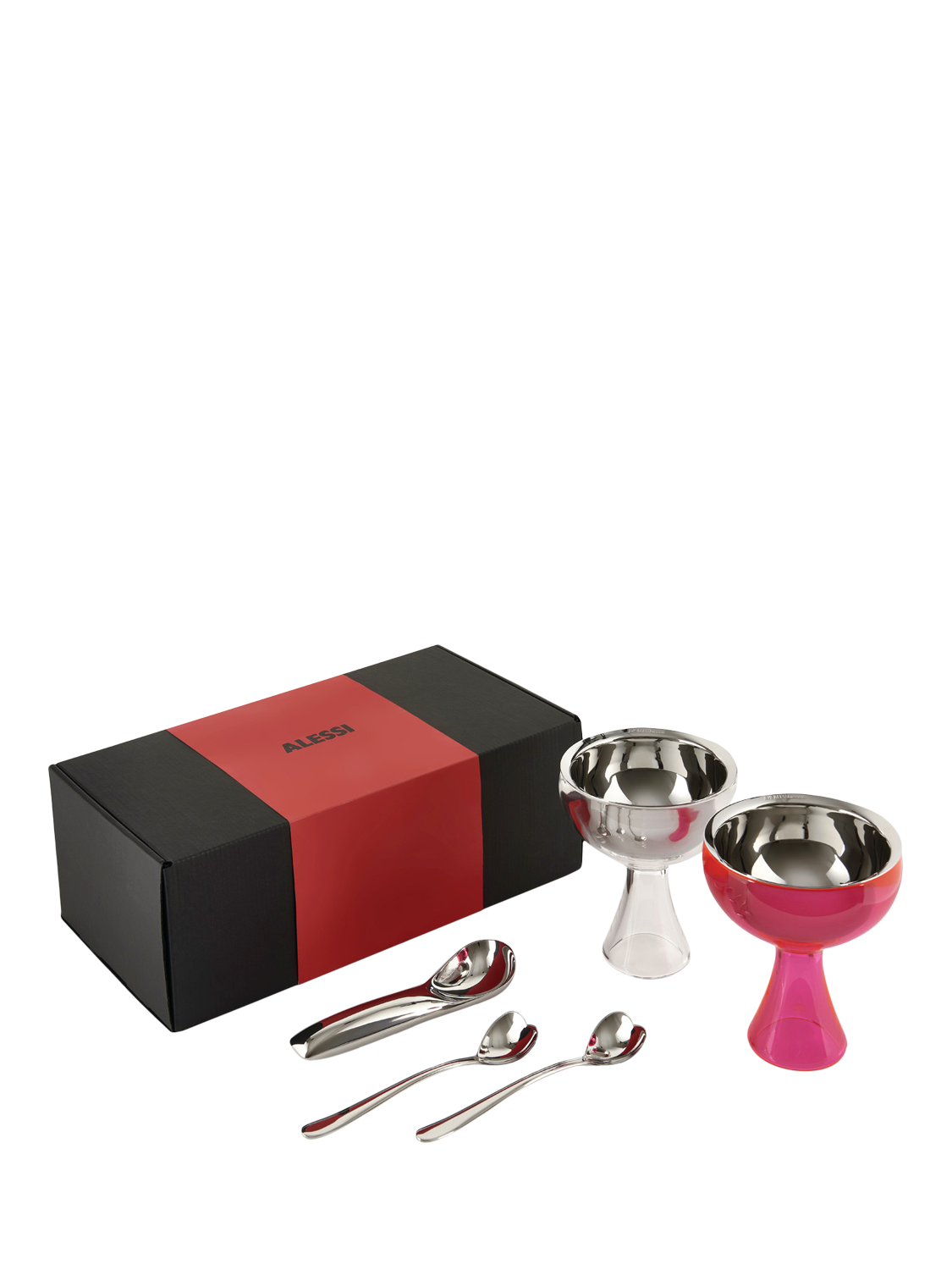 This Alessi & Ice Cream gift set features two ice cream bowls, one fuchsia and one ice colour. Made in 18/10-grade stainless steel, this gift-boxed set also includes a 'Koki' ice cream scoop and two 'Big Love' ice cream spoons. The ultimate gift for ice cream fans.