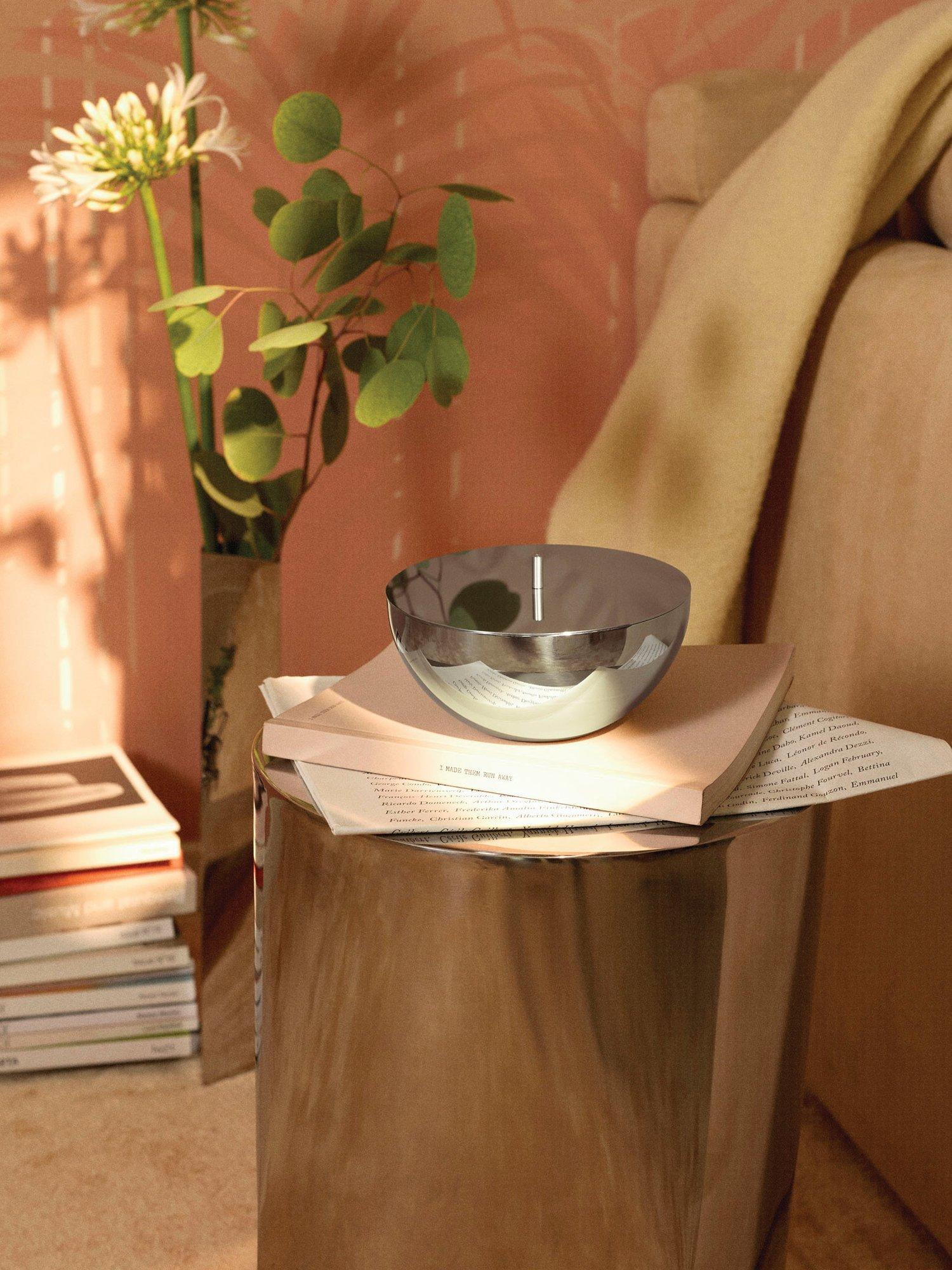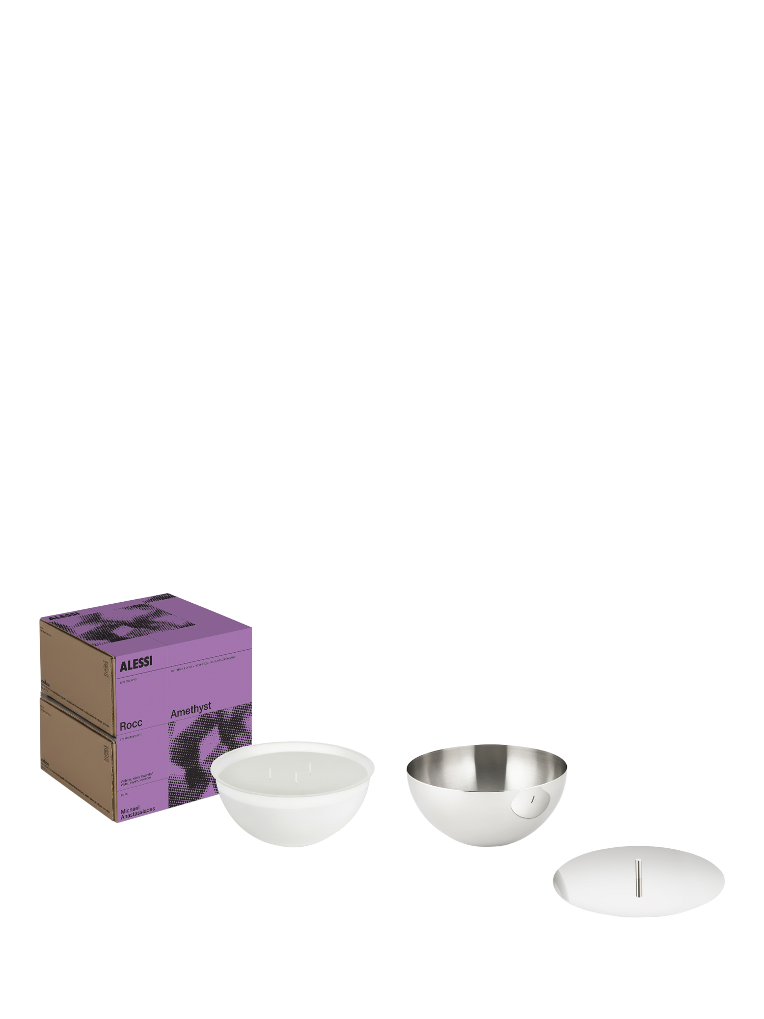 Rocc is a home‑fragrance line inspired by the mineral world. Each scent comes as a three‑wick candle designed to fit in an elegant, reusable stainless‑steel container designed by Michael Anastassiades for Alessi and made in Italy. This small container has a stainless‑steel lid, and the candle can be removed easily after use.