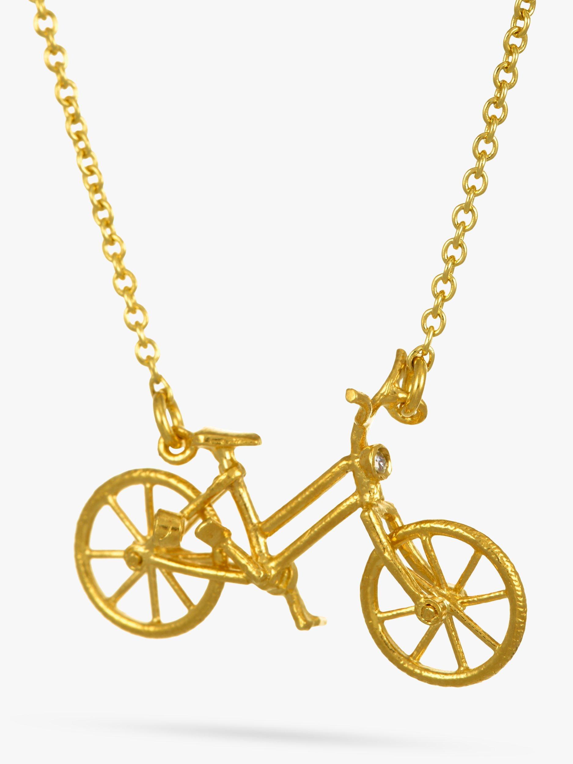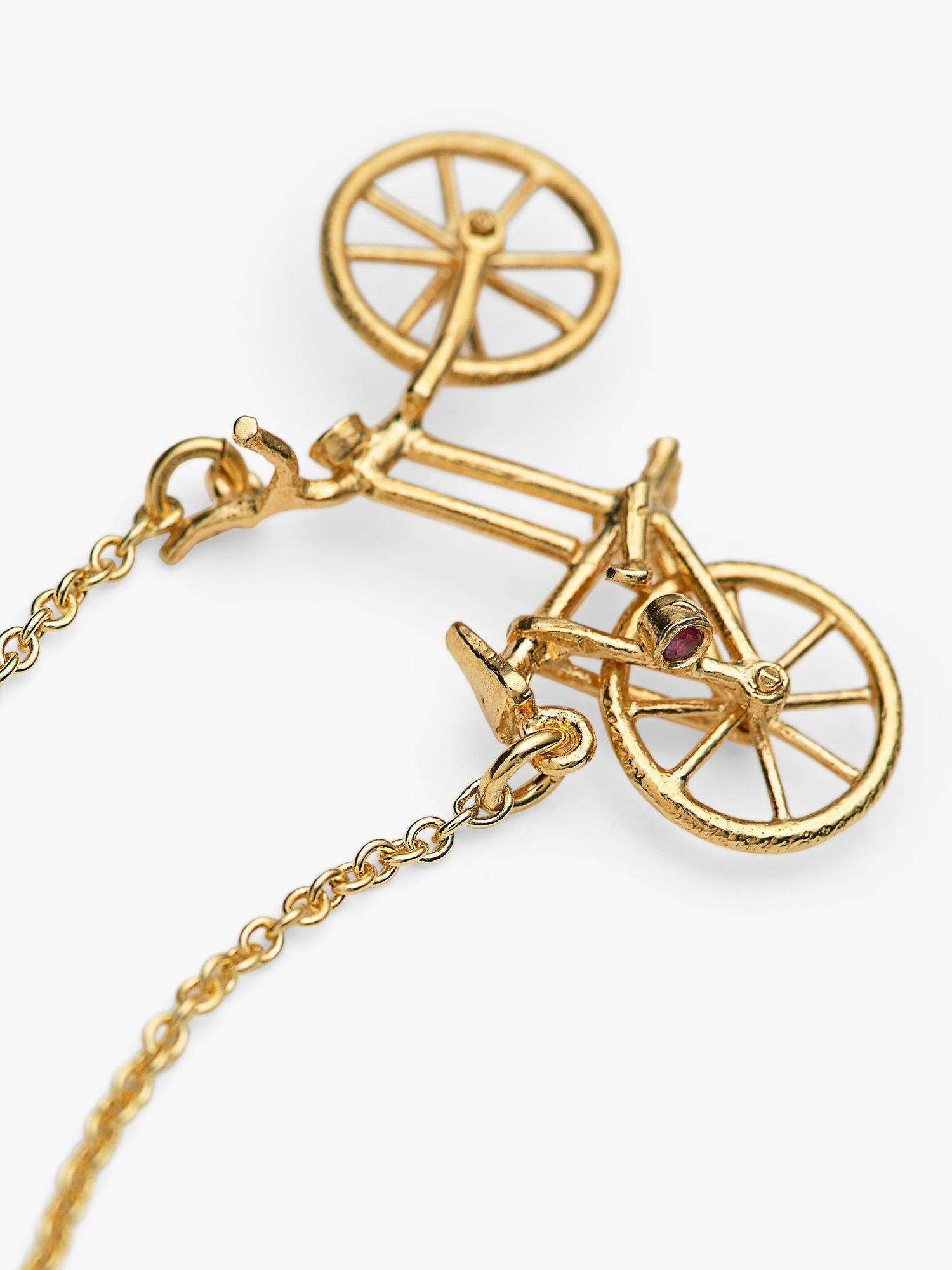 Great for wearing on its own or layered with other necklaces, this vintage bicycle necklace from Alex Monroe brings something new to your accessories edit. A diamond and ruby form the head and tail lights and it's finished with spinning wheels for full effect.