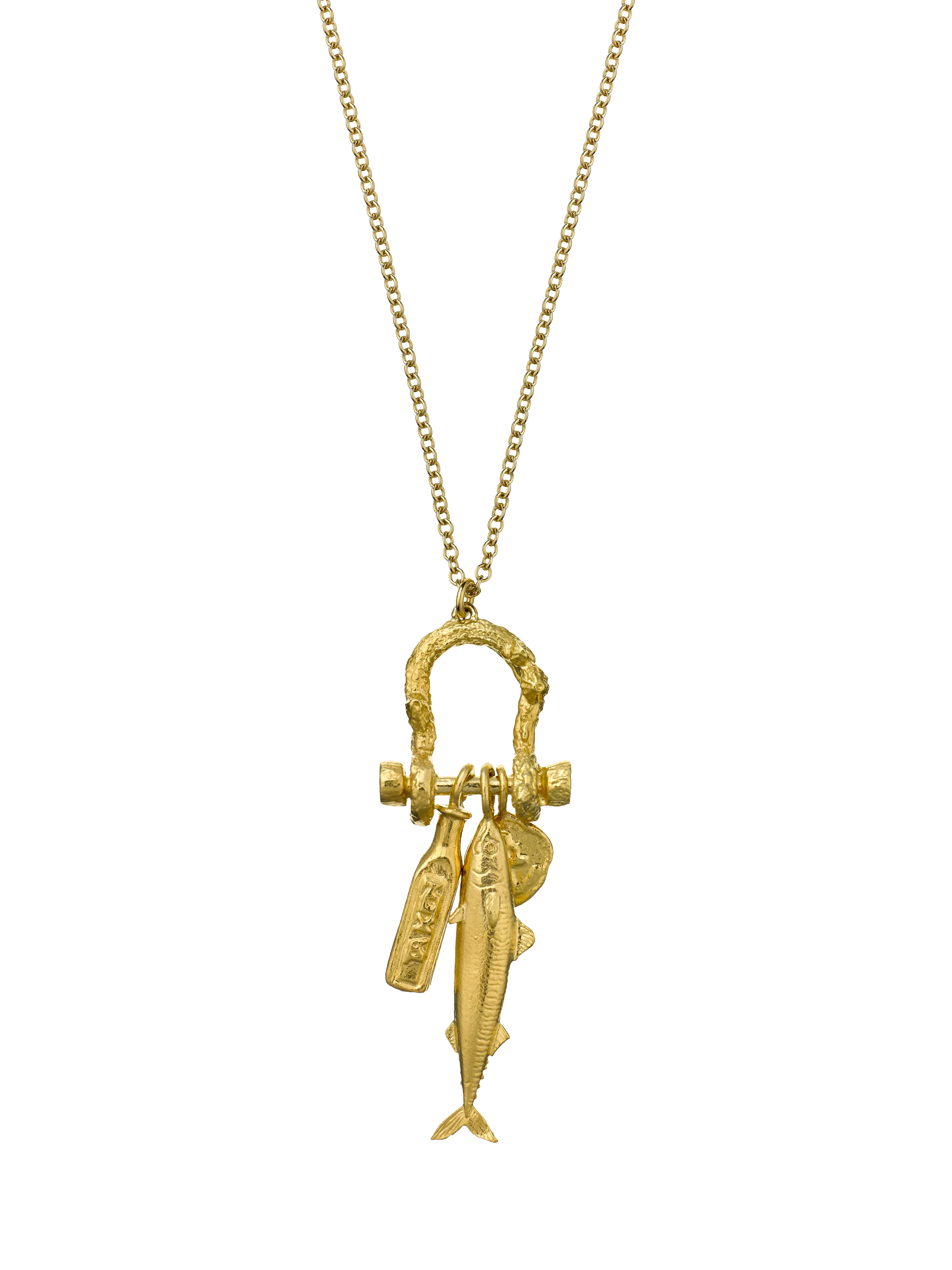 This playful necklace is inspired by exploring docklands and harbours when mudlarking on the shores. An array of charms hang from a textured chain link - a quirky fish, miniature poison bottle and a weathered anchor token. Inspired by nature and handmade in Alex Monroe's London Workshop.
