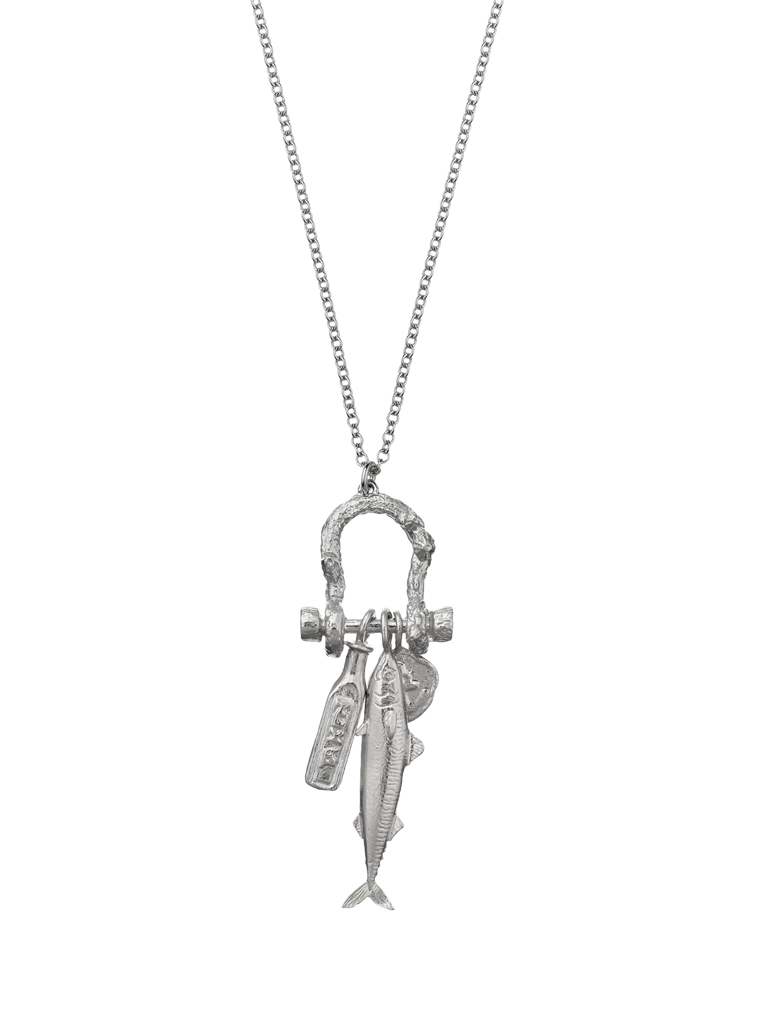 This playful necklace is inspired by exploring docklands and harbours when mudlarking on the shores. An array of charms hang from a textured chain link, offering a quirky fish, miniature poison bottle and a weathered anchor token. Inspired by nature and handmade in Alex Monroe's London Workshop. Crafted in solid sterling silver.