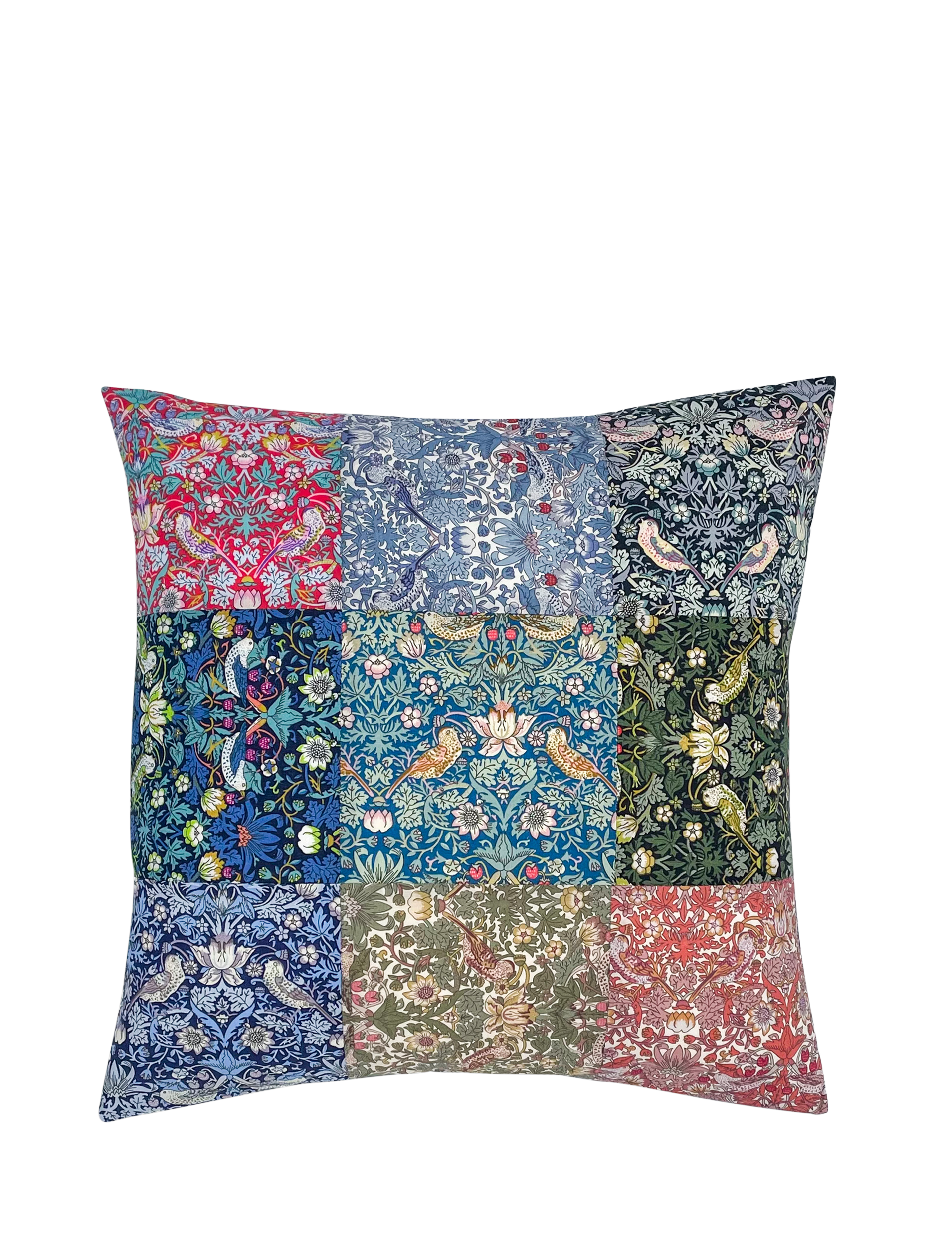 Strawberry Thief fabric was first designed by Arts & Crafts Movement master William Morris in 1883 and has since been re-drawn for Liberty on a smaller scale. Here, you will find nine different and stunning colourways to enjoy on this easy patchwork cushion which will add a delightful pop of colour to any bed, sofa or chair!The construction is fast and simple, using only straight line sewing using the sewing machine or by hand sewing, if you prefer. A perfect project for a beginner sewer.