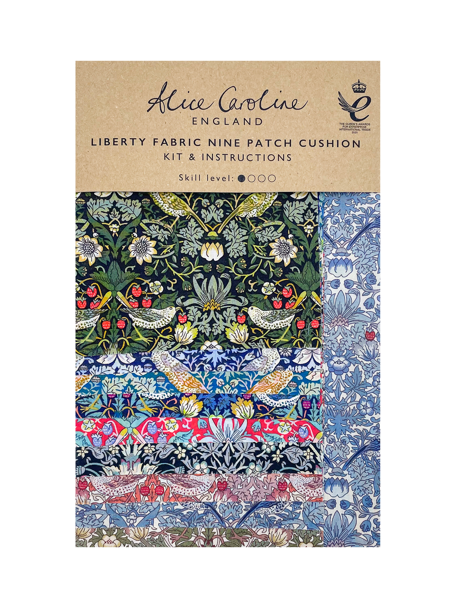 Contains nine different Liberty Tana Lawn® Strawberry Thief fabrics for the cushion front and back and fully illustrated instructions.