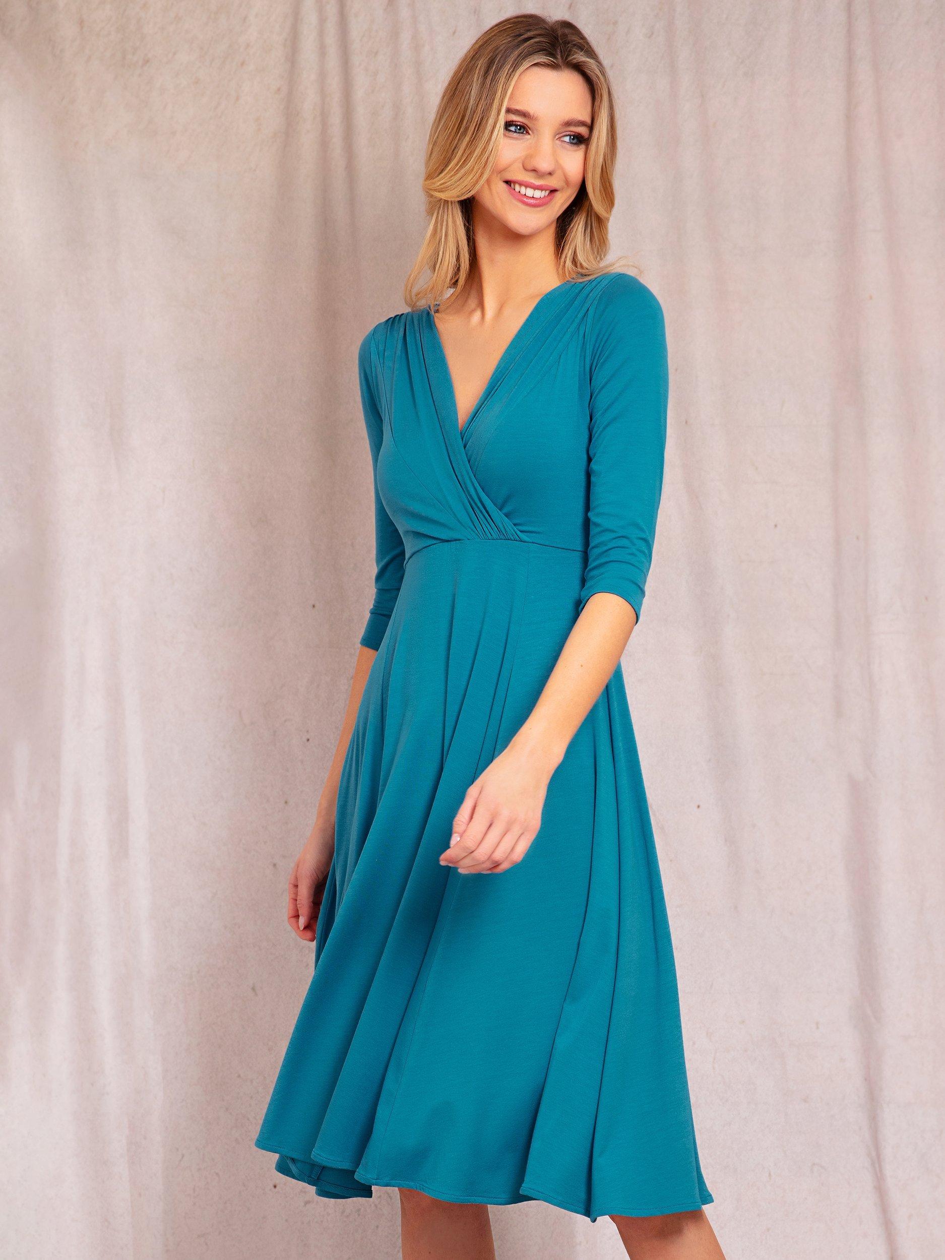 Designed to flatter at the waist with a gathered crossover-neckline and fit-and-flare skirt in soft-stretch jersey, our Annie Dress in deep Eclipse Blue is a versatile essential for every wardrobe. 3/4 length sleeves provide extra arm coverage to this midi dress.