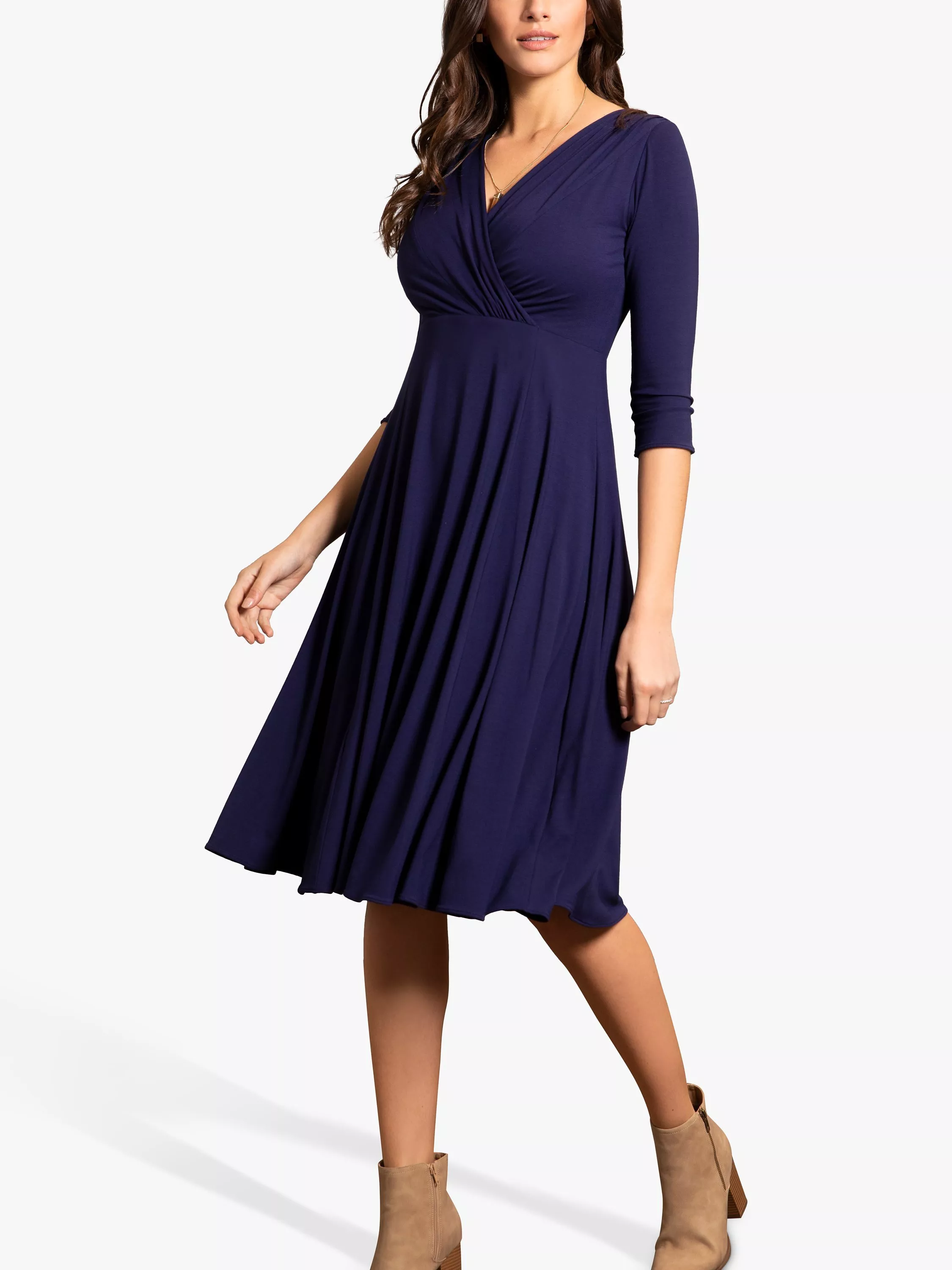 Designed to flatter at the waist with a gathered crossover-neckline and fit-and-flare skirt in soft-stretch jersey, our Annie Dress in deep Eclipse Blue is a versatile essential for every wardrobe. 3/4 length sleeves provide extra arm coverage to this midi dress.