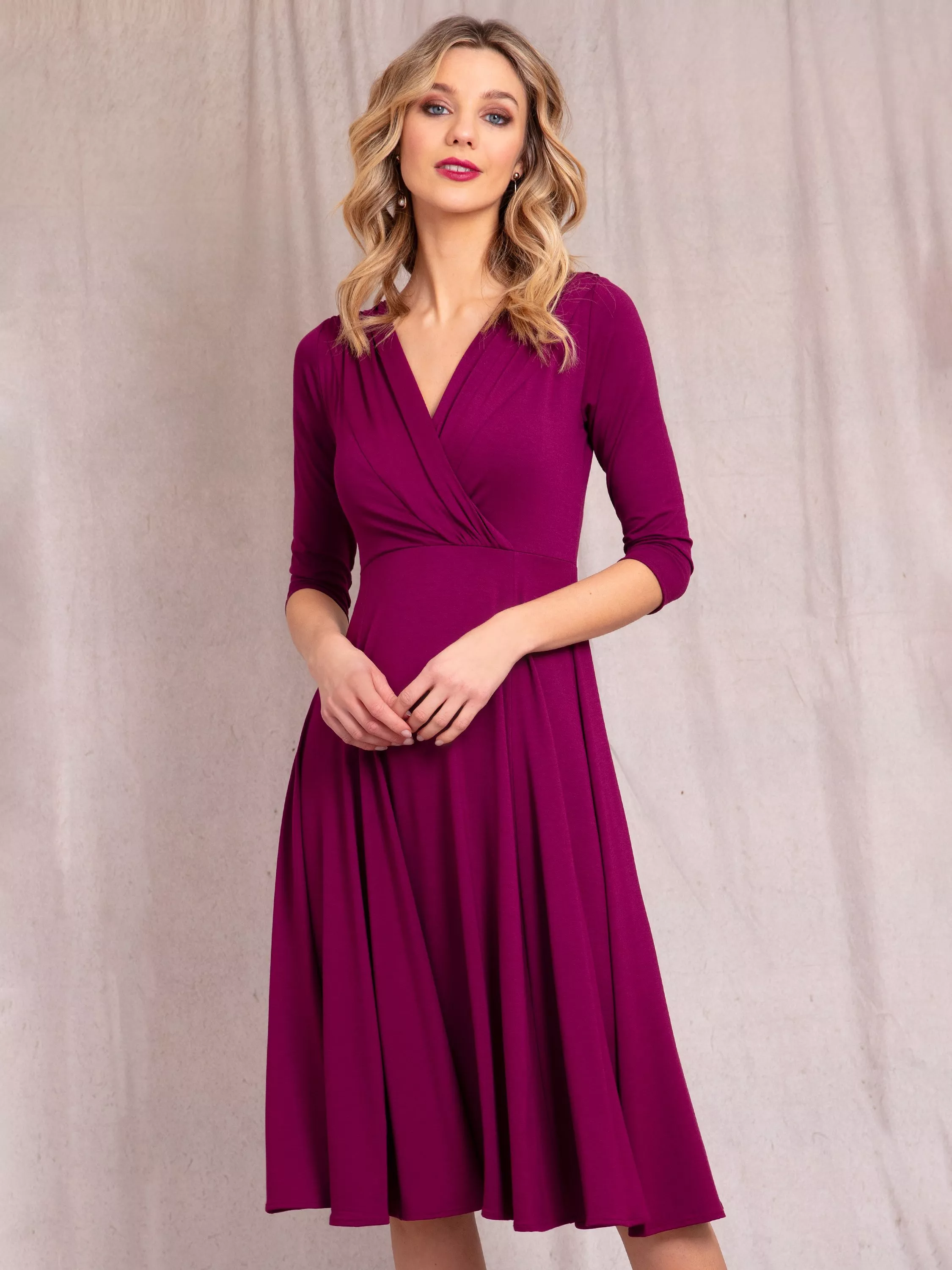 Designed to flatter at the waist with a gathered crossover-neckline and fit-and-flare skirt in soft-stretch jersey, our Annie Dress in deep Eclipse Blue is a versatile essential for every wardrobe. 3/4 length sleeves provide extra arm coverage to this midi dress.