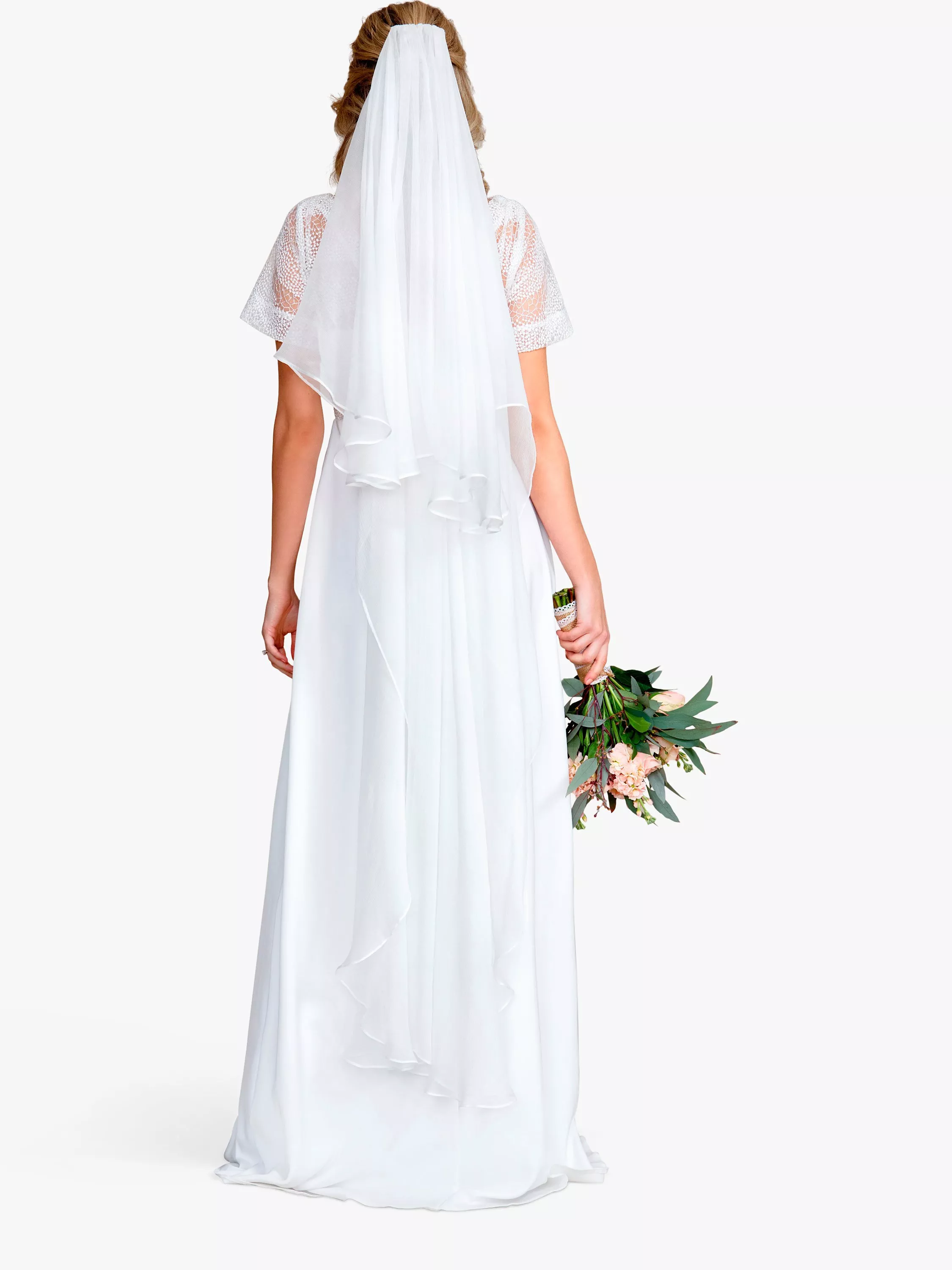 Perfect for the bride who just wants a hint of veil, this barely there pure silk chiffon design is luxuriously lightweight. Designed with a soft ivory white silk crinkle chiffon, this longer length veil is the classic Waltz length created to finish around or above the ankle.
