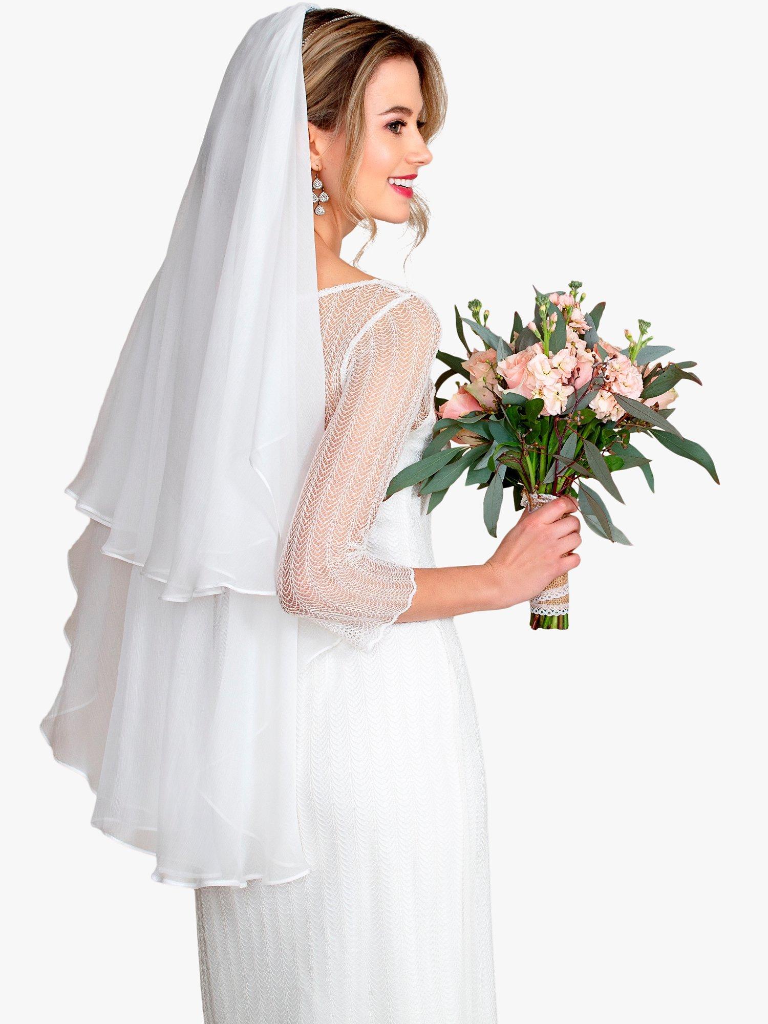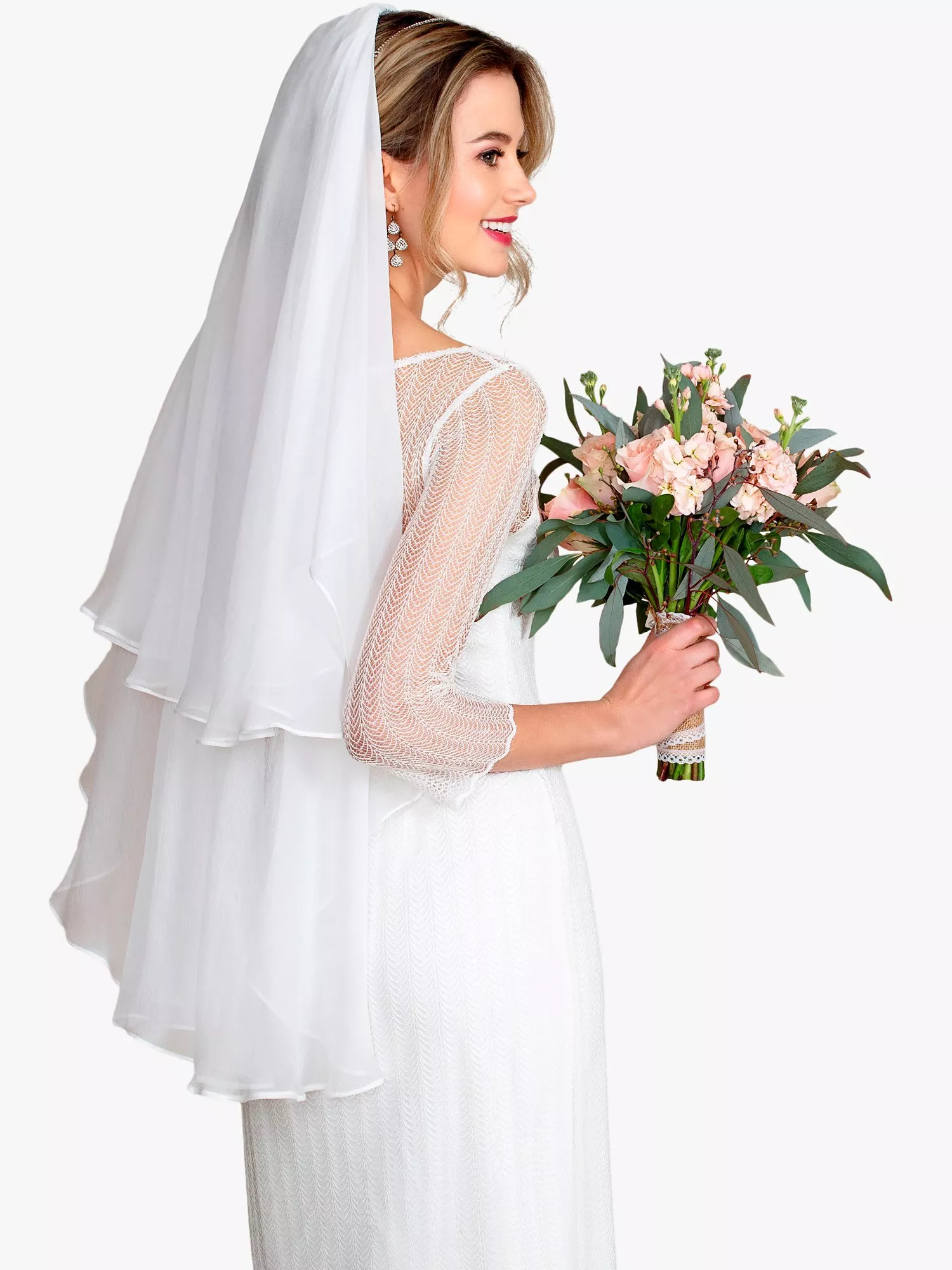 Perfect for the bride who just wants a hint of veil, our barely there pure silk chiffon design is luxuriously lightweight. Designed with a soft ivory white silk crinkle chiffon, this shorter classic veil is described as 'fingertip' length due to the hem extending to the bride's fingertips.