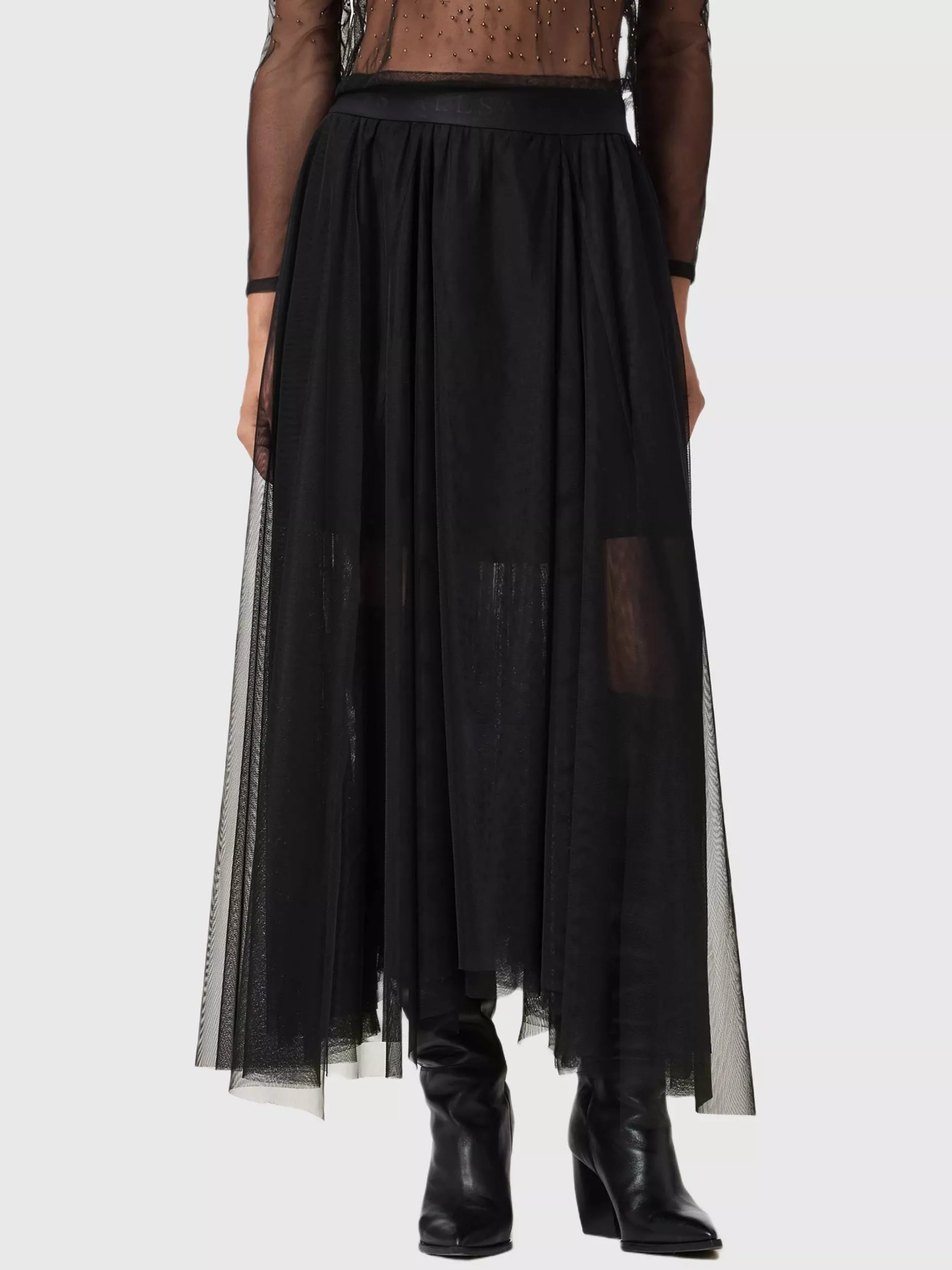 A tulle midi skirt by AllSaints featuring an A-line cut and subtle asymmetry, adding a distinct edge to any look. Fastens with a zip.