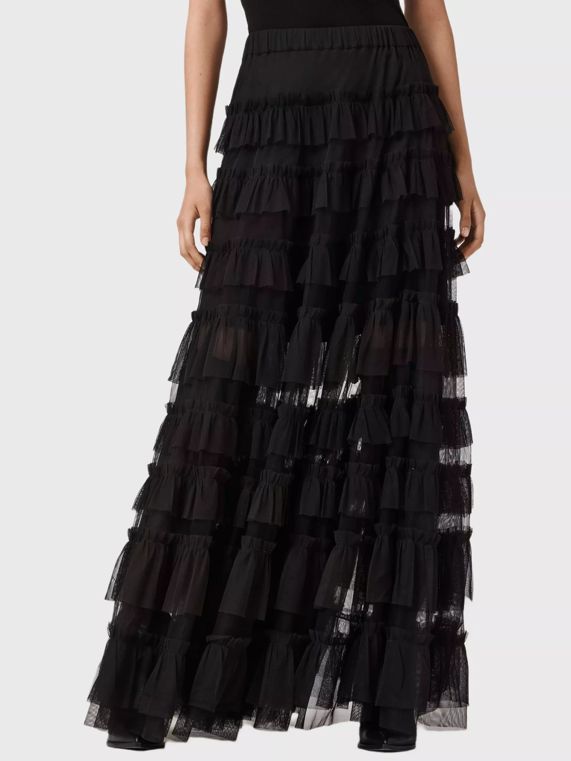 A clean fall to the floor - this skirt's by AllSaints. With shape shifting ruffles, it's equipped with a zip closure.