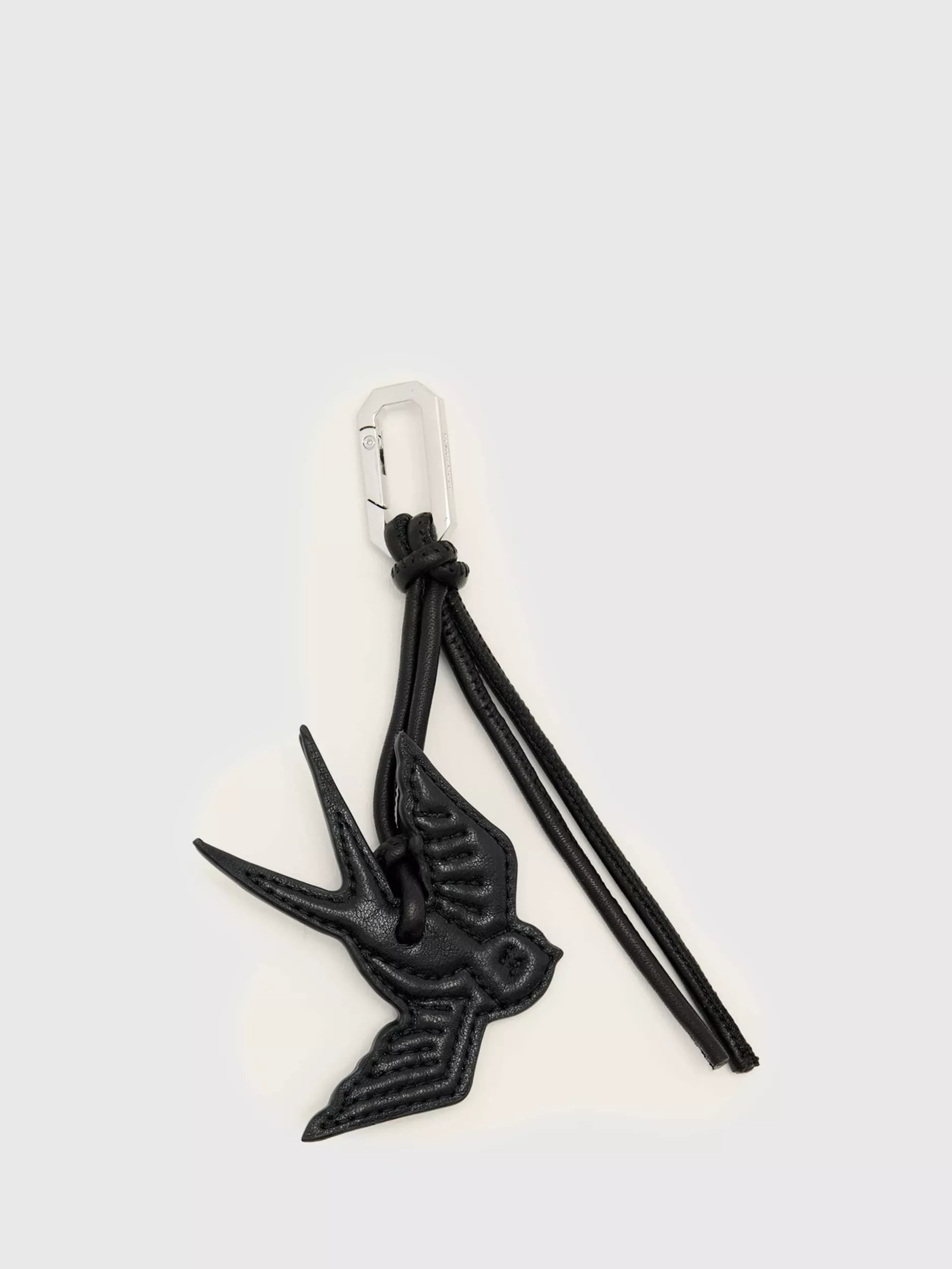 Swallow bird-shaped leather keyring by AllSaints. Clip to bags or accessories with a hex clip on a leather cord.