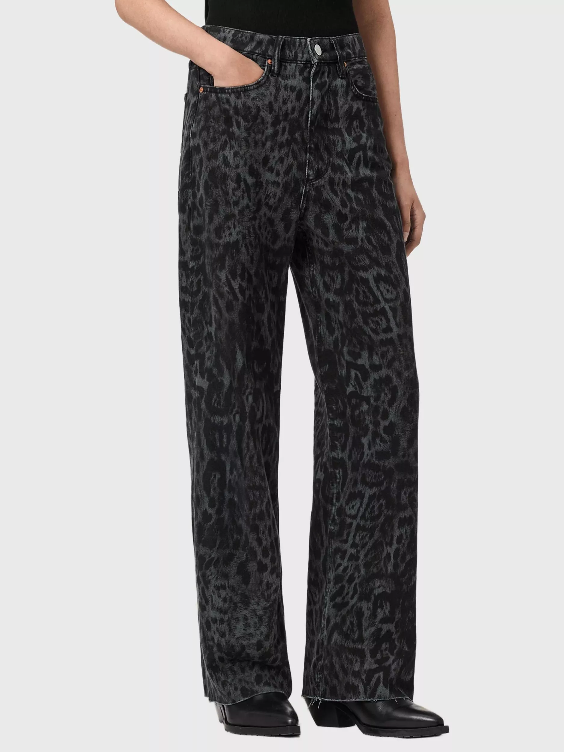 A pair of wide-leg jeans by AllSaints with an all-over grey leopard print. Made from a cotton blend with a comfortable high rise and a button and zip fastening, they fall to a full-length.