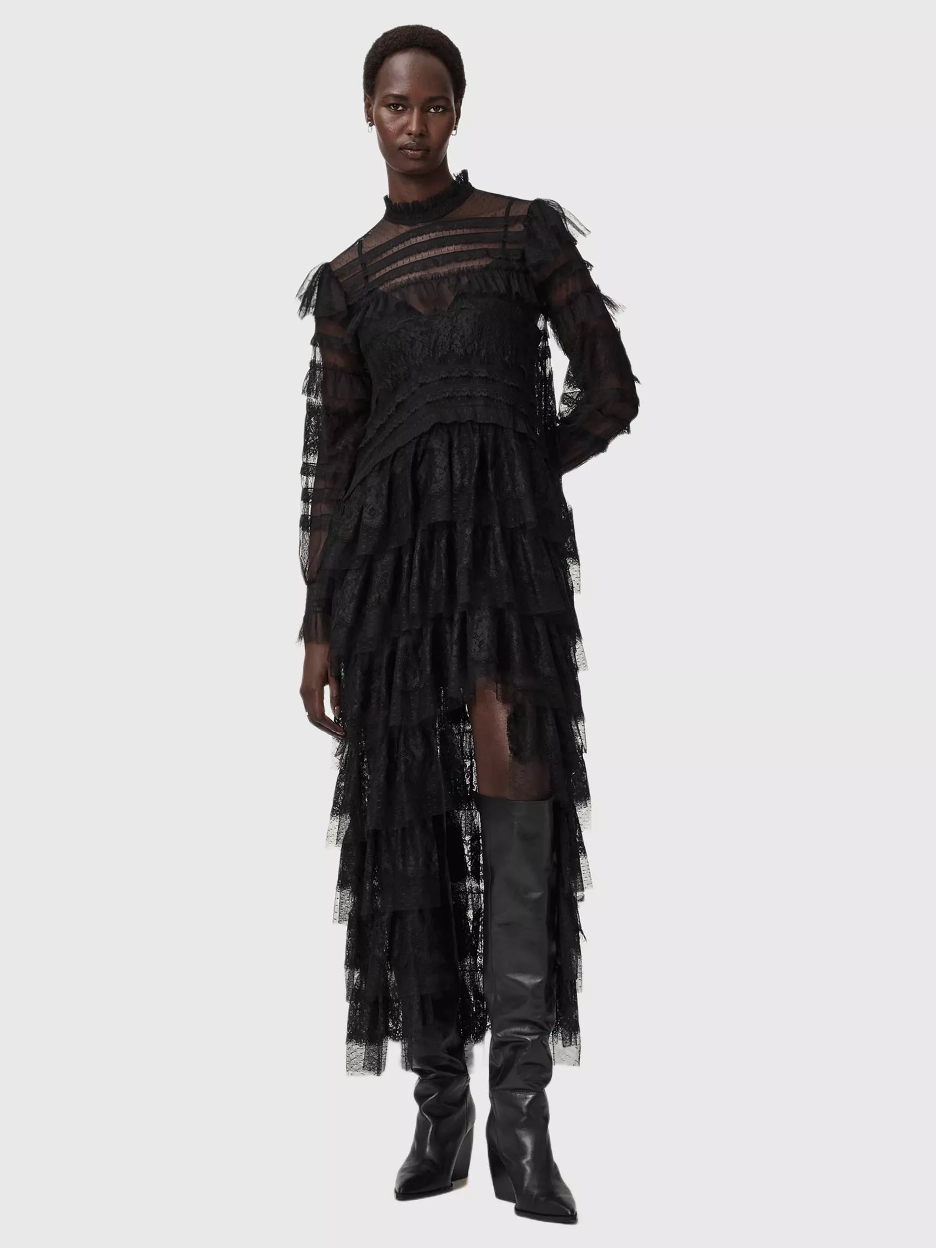Effortlessly get noticed at any event in this layered maxi dress. Featuring textured lace, a high neck and an asymmetric high-low hem, it's ideal for your more elevated evening or party plans, while helping you express your style with ease.