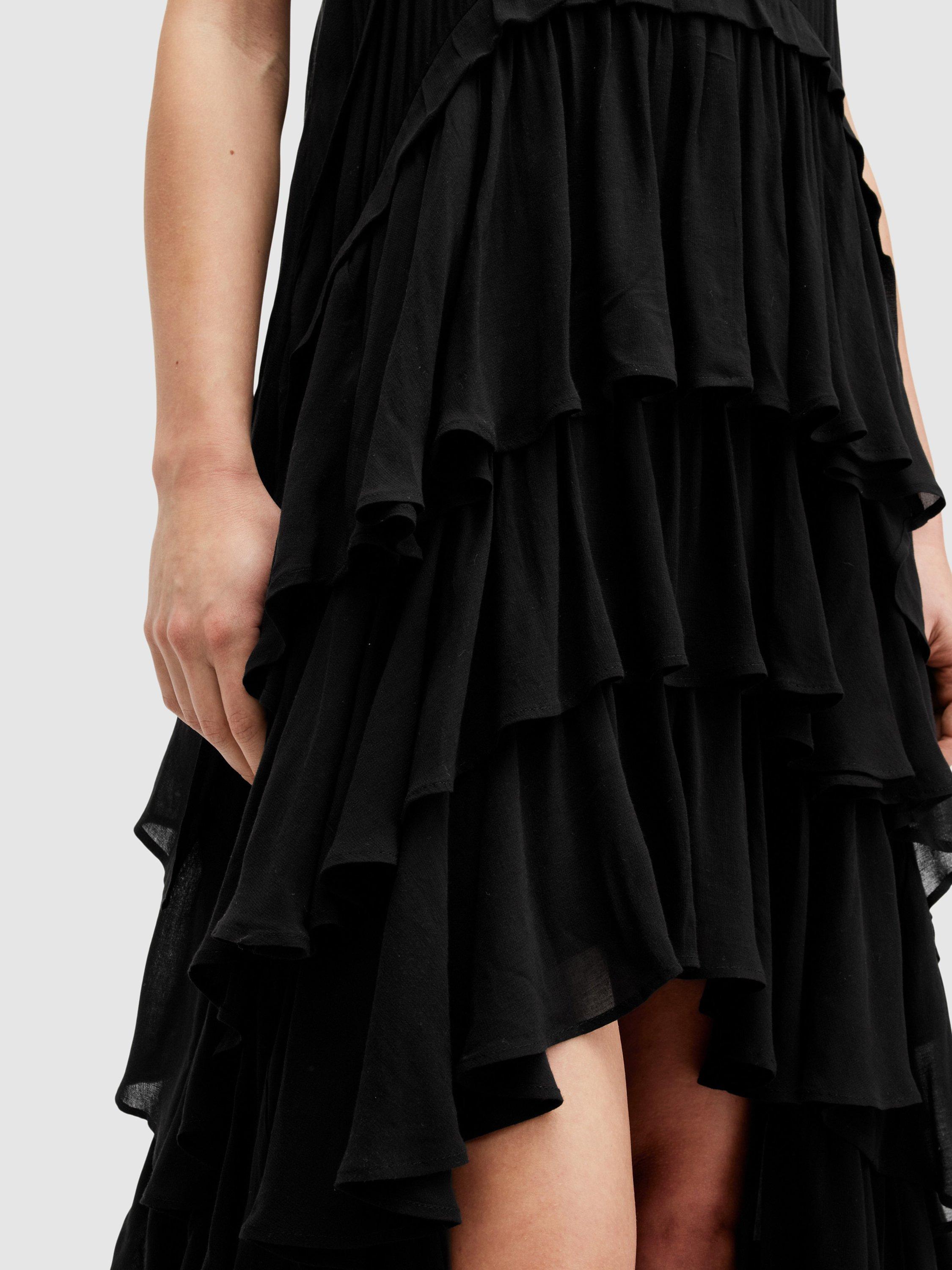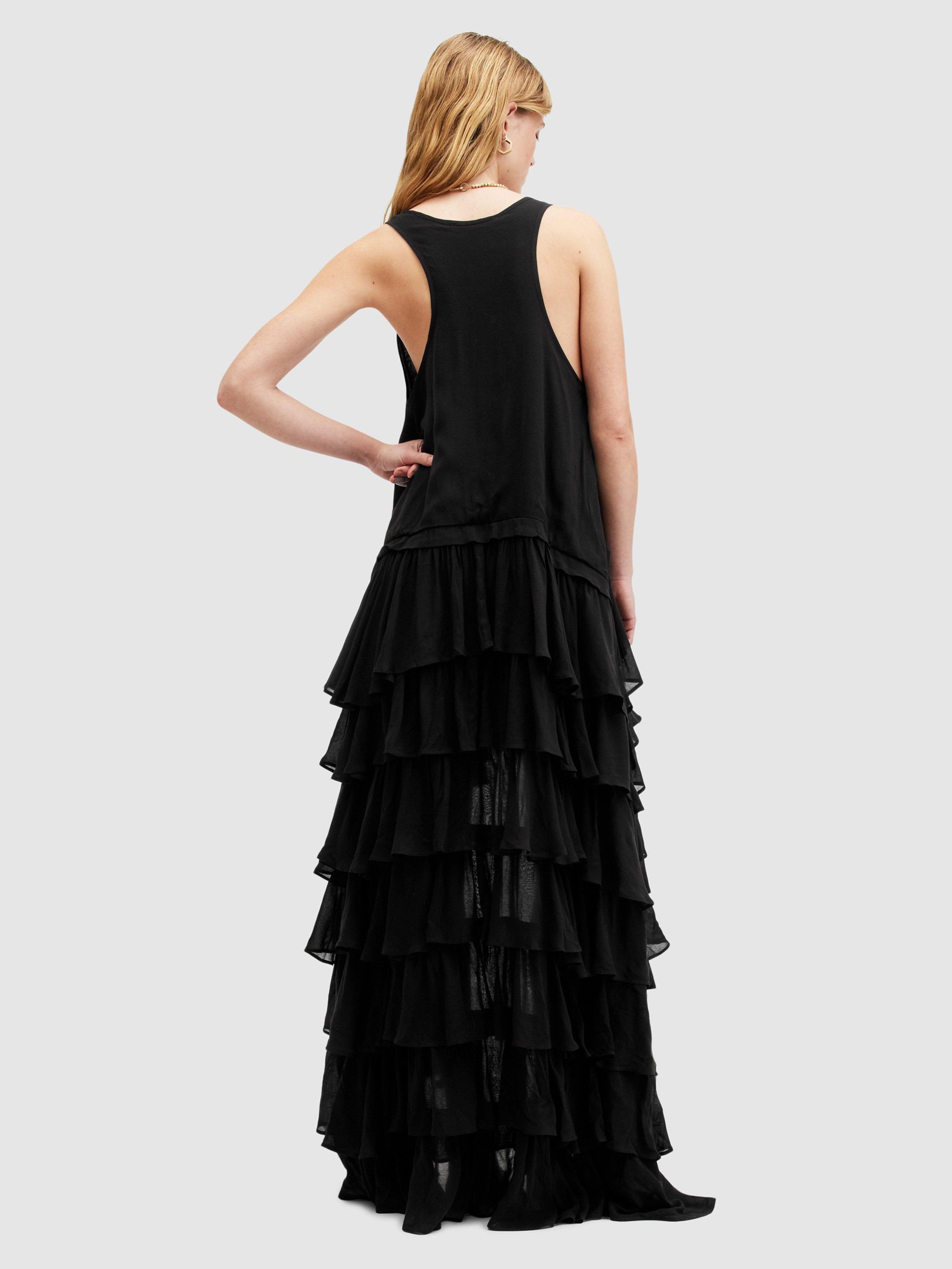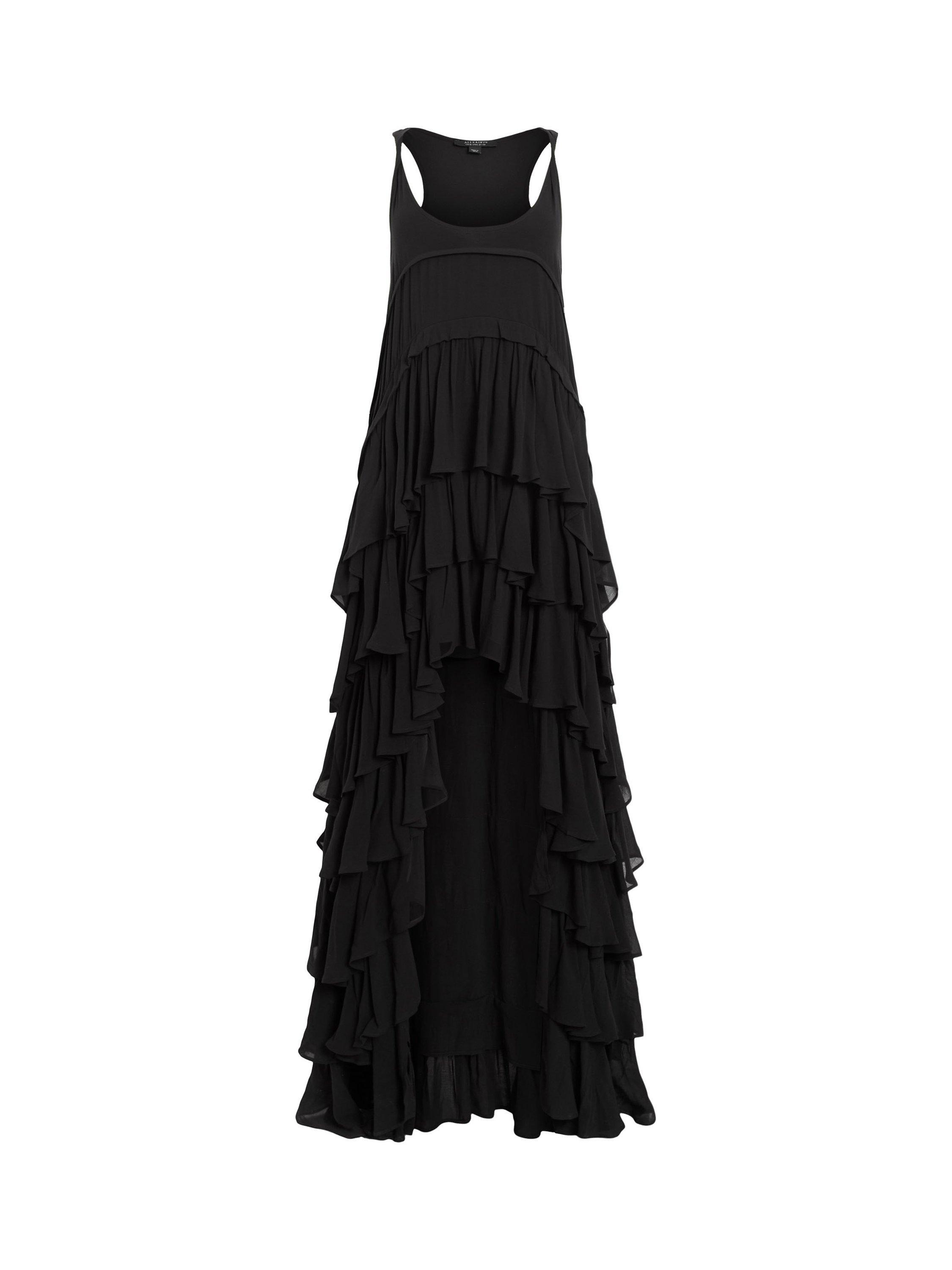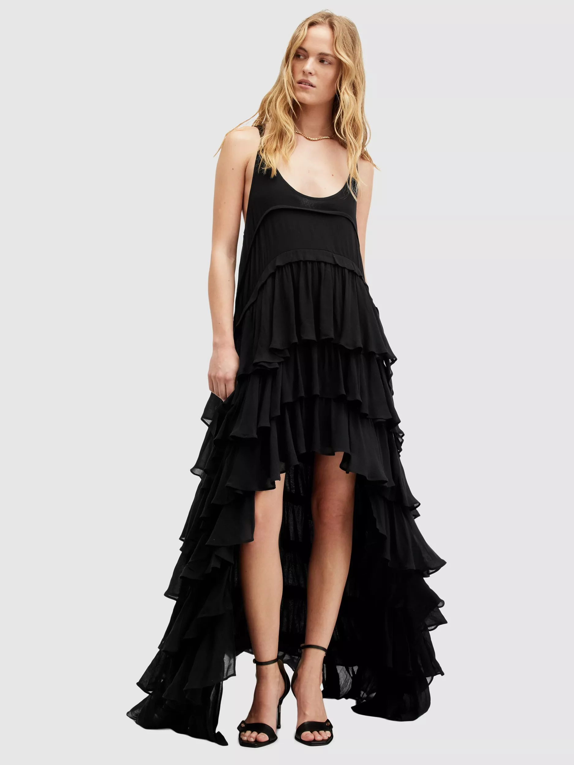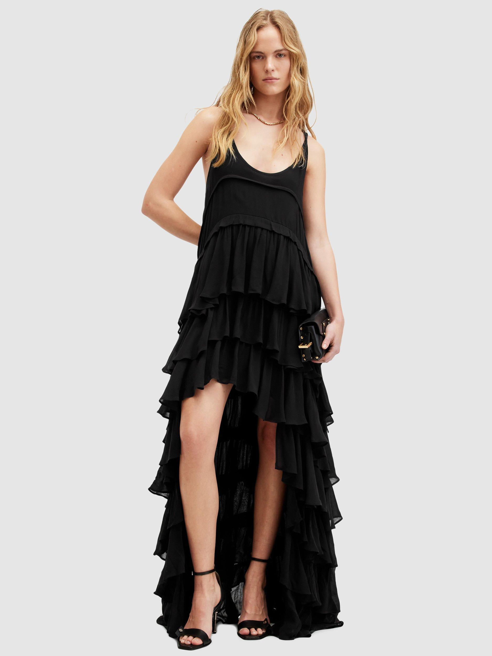 With tiers down its profile, this maxi dress from AllSaints is crafted from an airy viscose fabric and falls to a dramatic hi-low hem. With a traditional scoop neckline, this style is the epitome of sheer minimalism. Style with boots and an oversized biker or elevate with heeled sandals and chunky accessories.