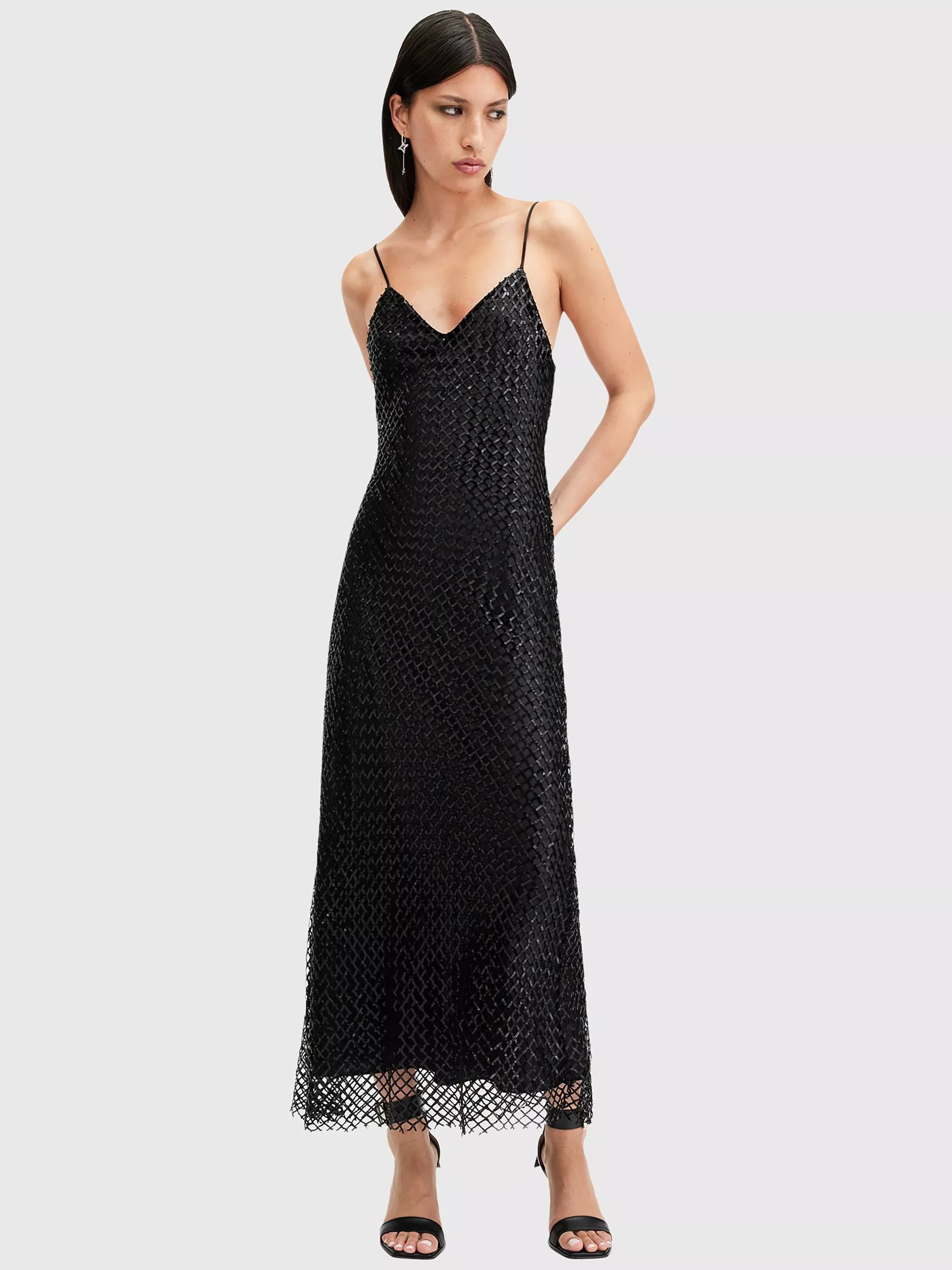 Cut to a classic slip shape, this mid-length dress from AllSaints is made from a lightweight fabric. Effortlessly flattering thanks to a fuss-free v-neckline, this strappy style needs no prints or accents to hold the spotlight.