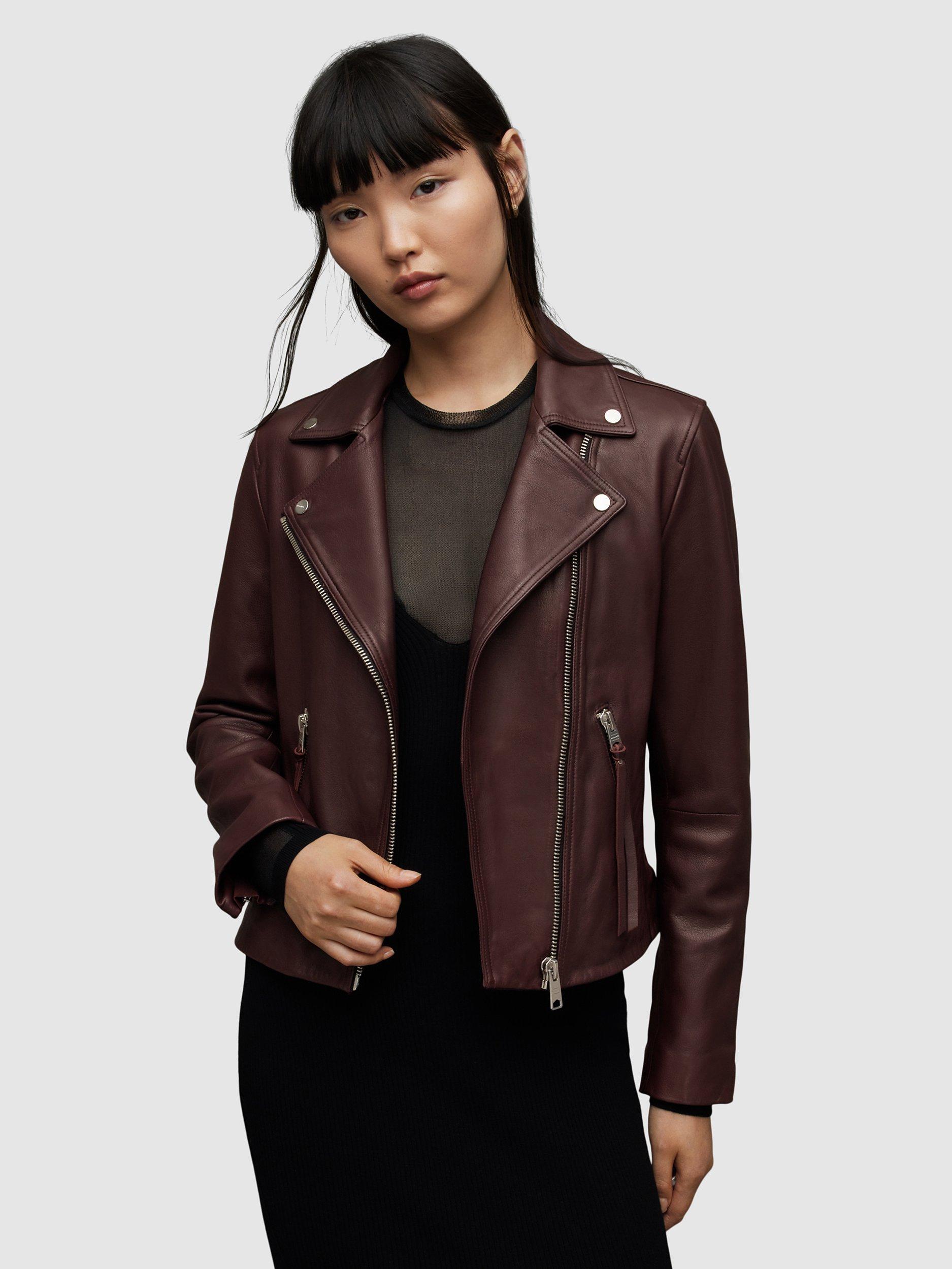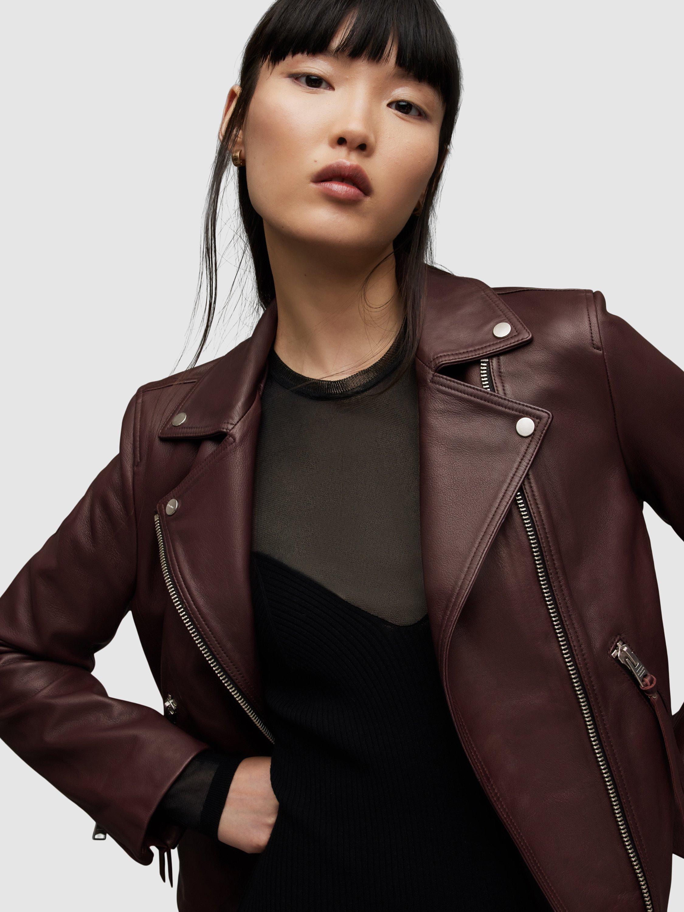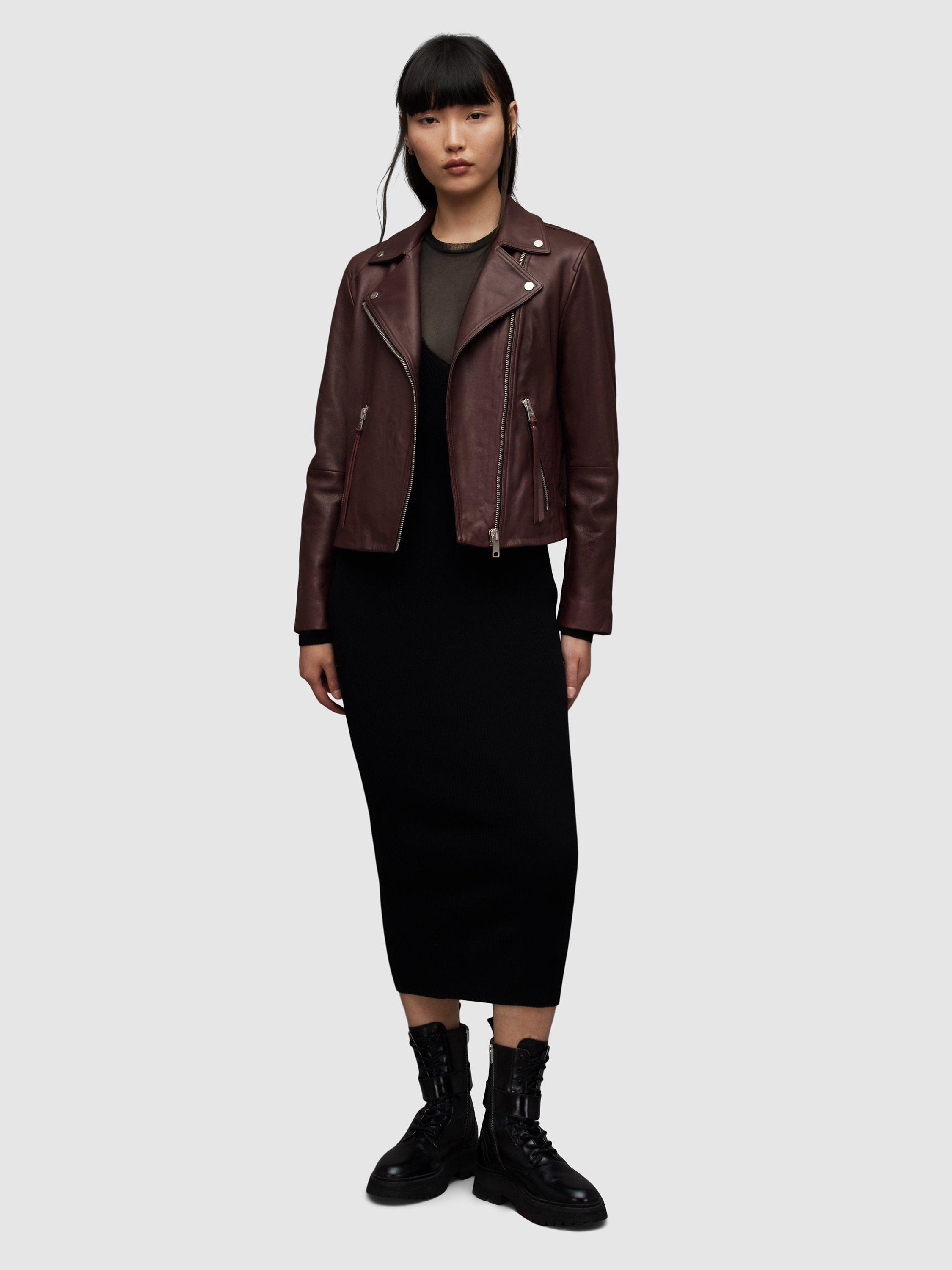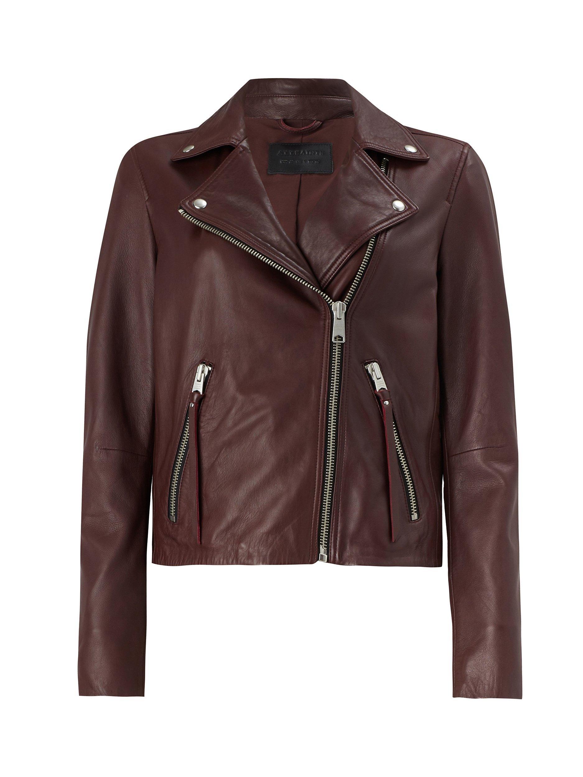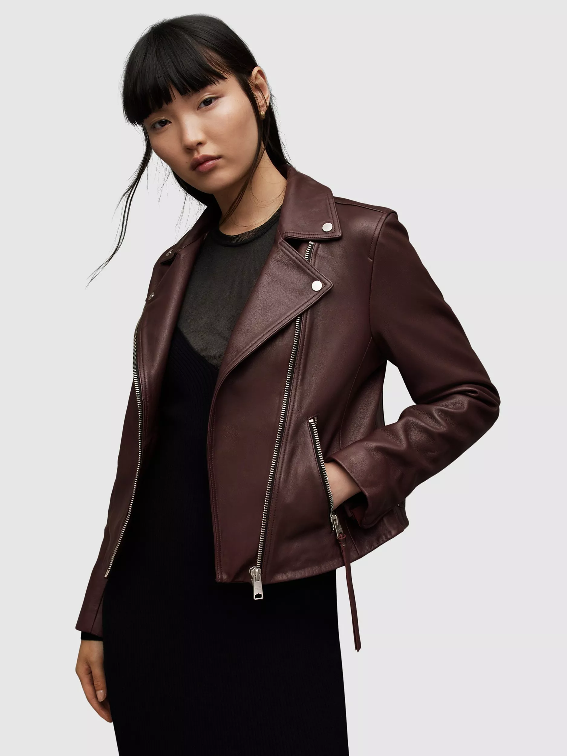 In a perennially sleek biker design, the Dalby jacket from AllSaints is crafted from pure leather and boasts full lining for optimum comfort. With a feminine, slim-fitting shape, it features a notched collar, zipped cuffs and tassel detailing on the zipped pockets. Layer over a fit and flare dress and team with ankle boots for an edgy daytime ensemble.