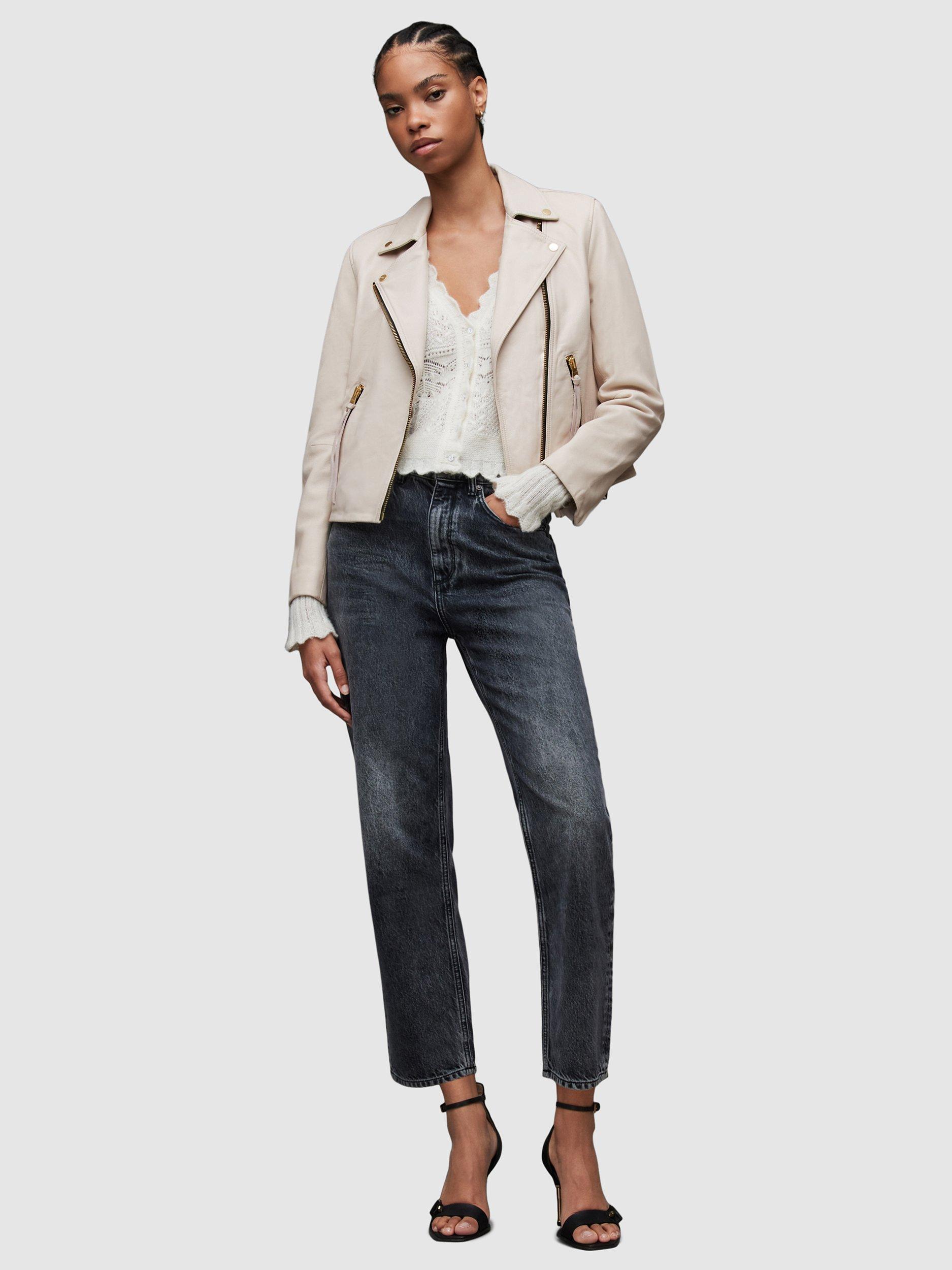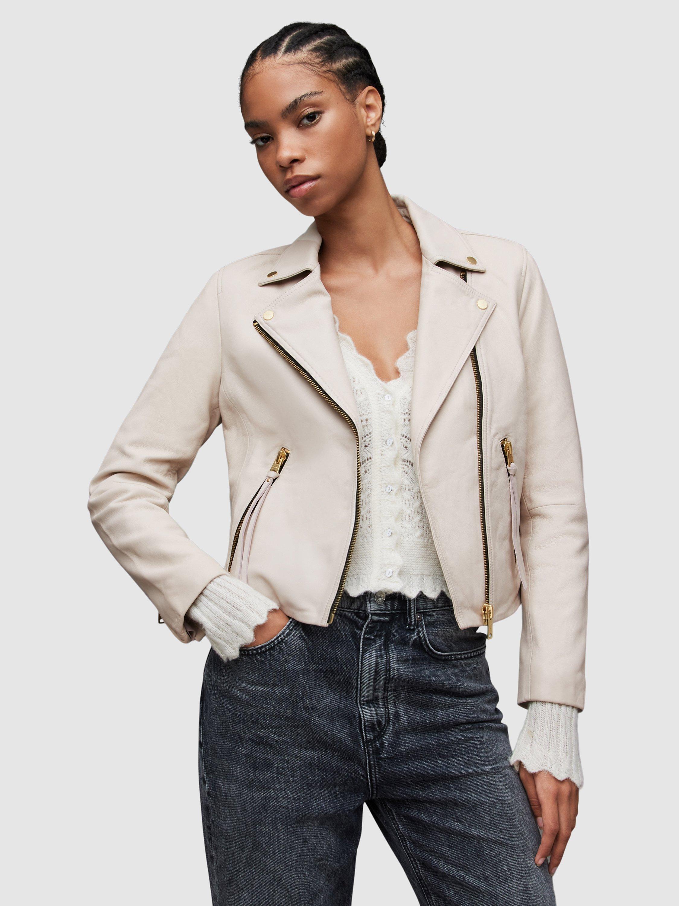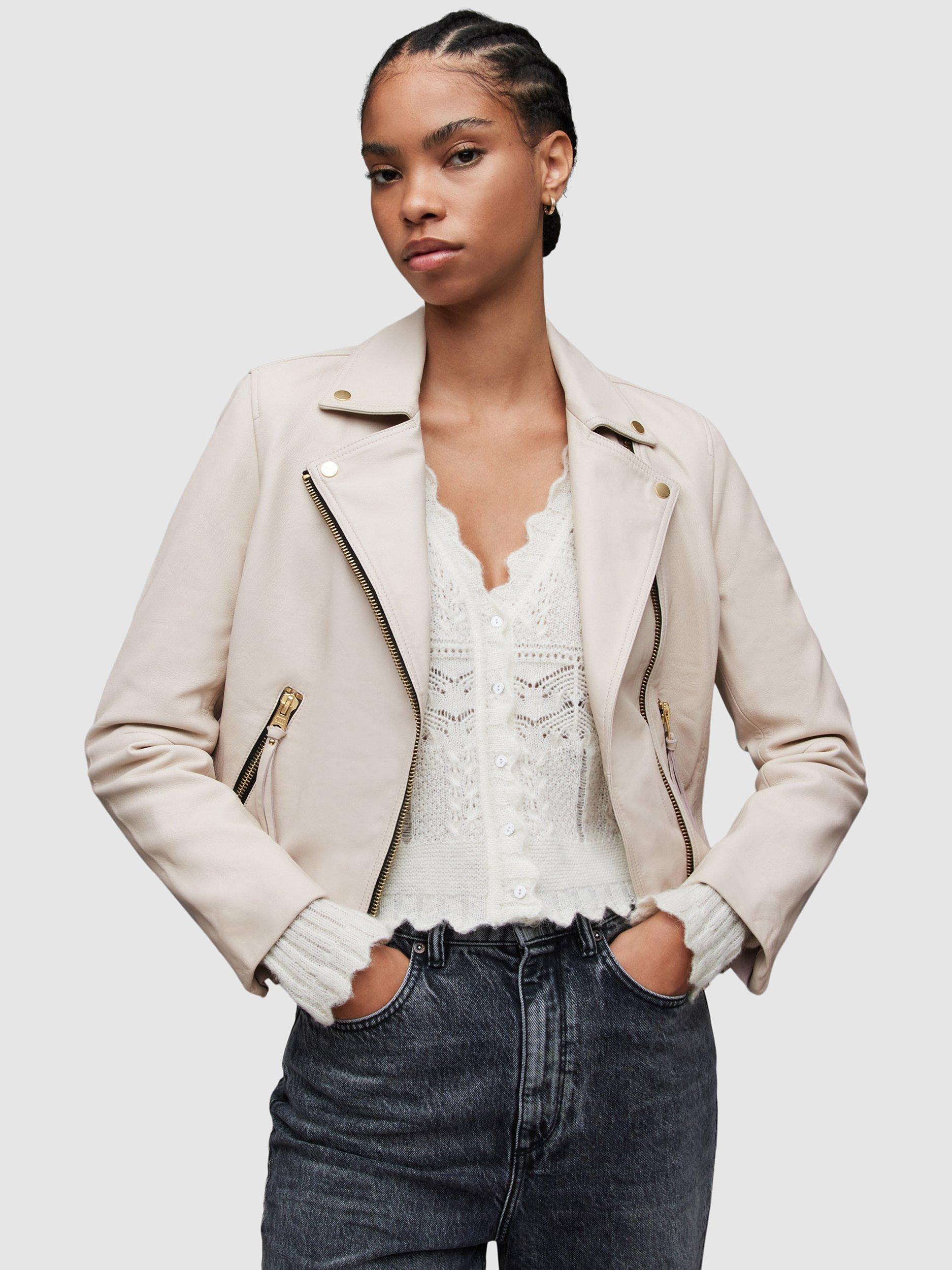 In a perennially sleek biker design, the Dalby jacket from AllSaints is crafted from pure leather and boasts full lining for optimum comfort. With a feminine, slim-fitting shape, it features a notched collar, zipped cuffs and tassel detailing on the zipped pockets. Layer over a fit and flare dress and team with ankle boots for an edgy daytime ensemble.