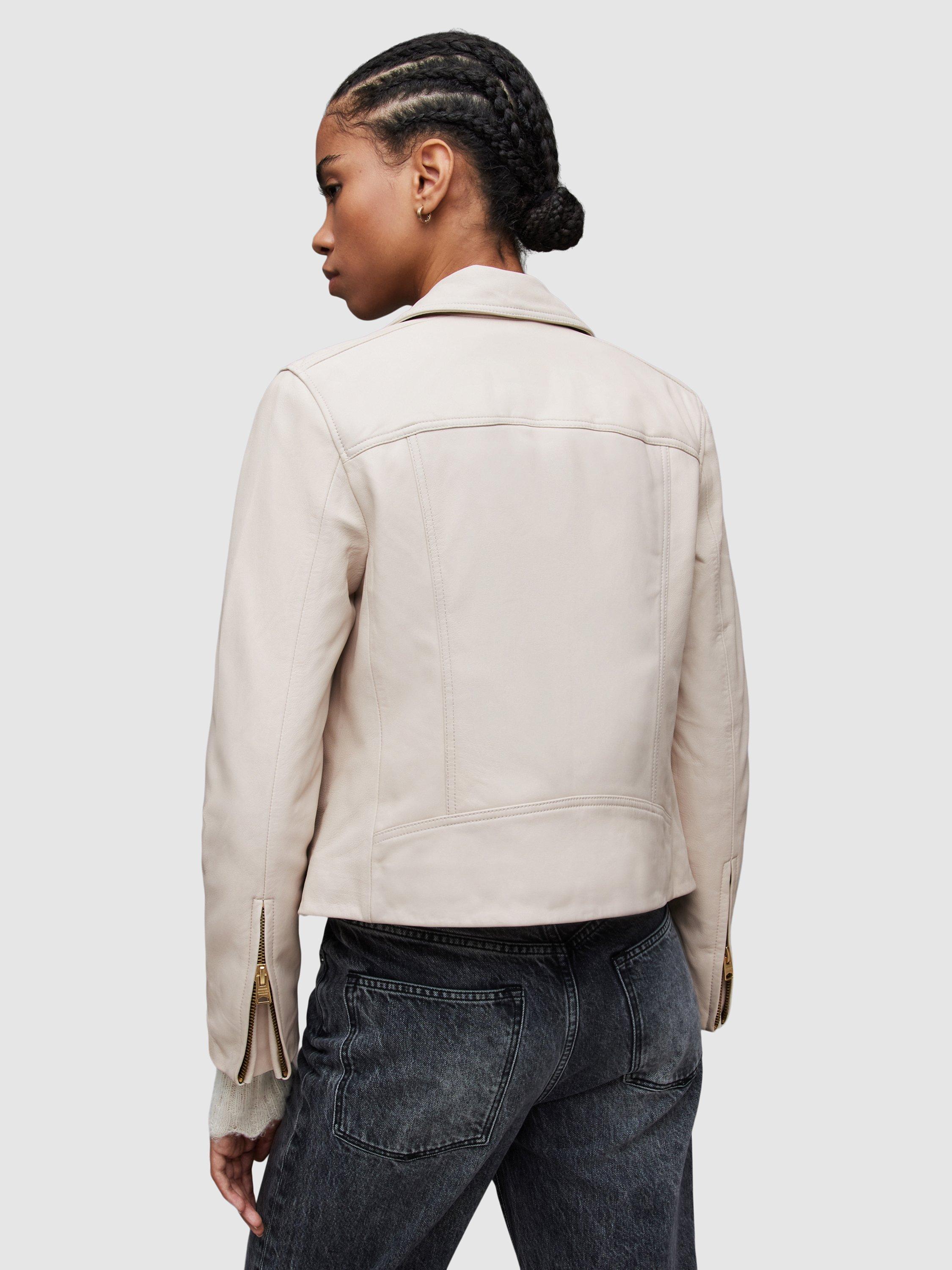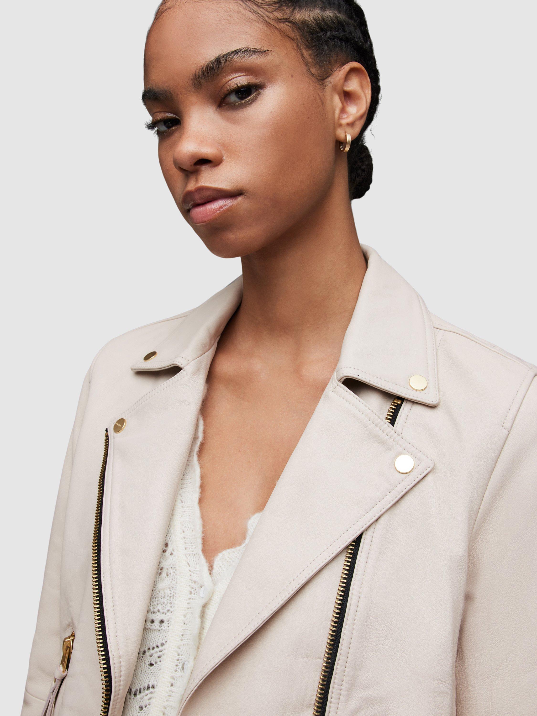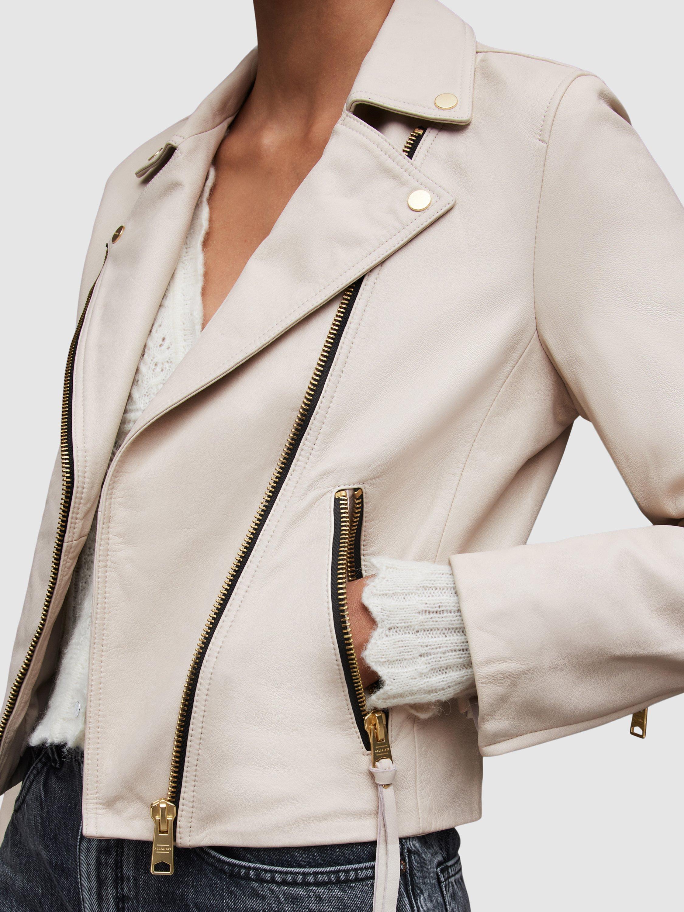 In a perennially sleek biker design, the Dalby jacket from AllSaints is crafted from pure leather and boasts full lining for optimum comfort. With a feminine, slim-fitting shape, it features a notched collar, zipped cuffs and tassel detailing on the zipped pockets. Layer over a fit and flare dress and team with ankle boots for an edgy daytime ensemble.