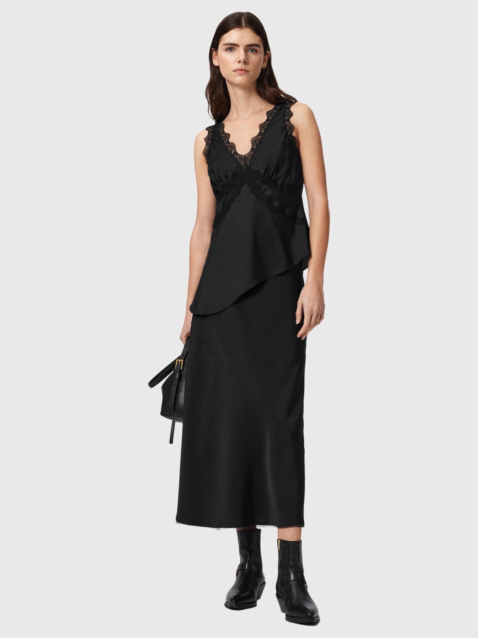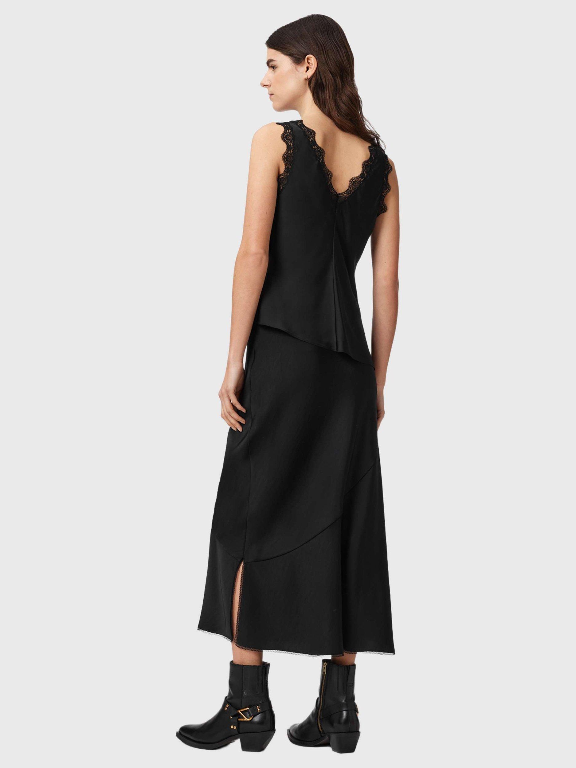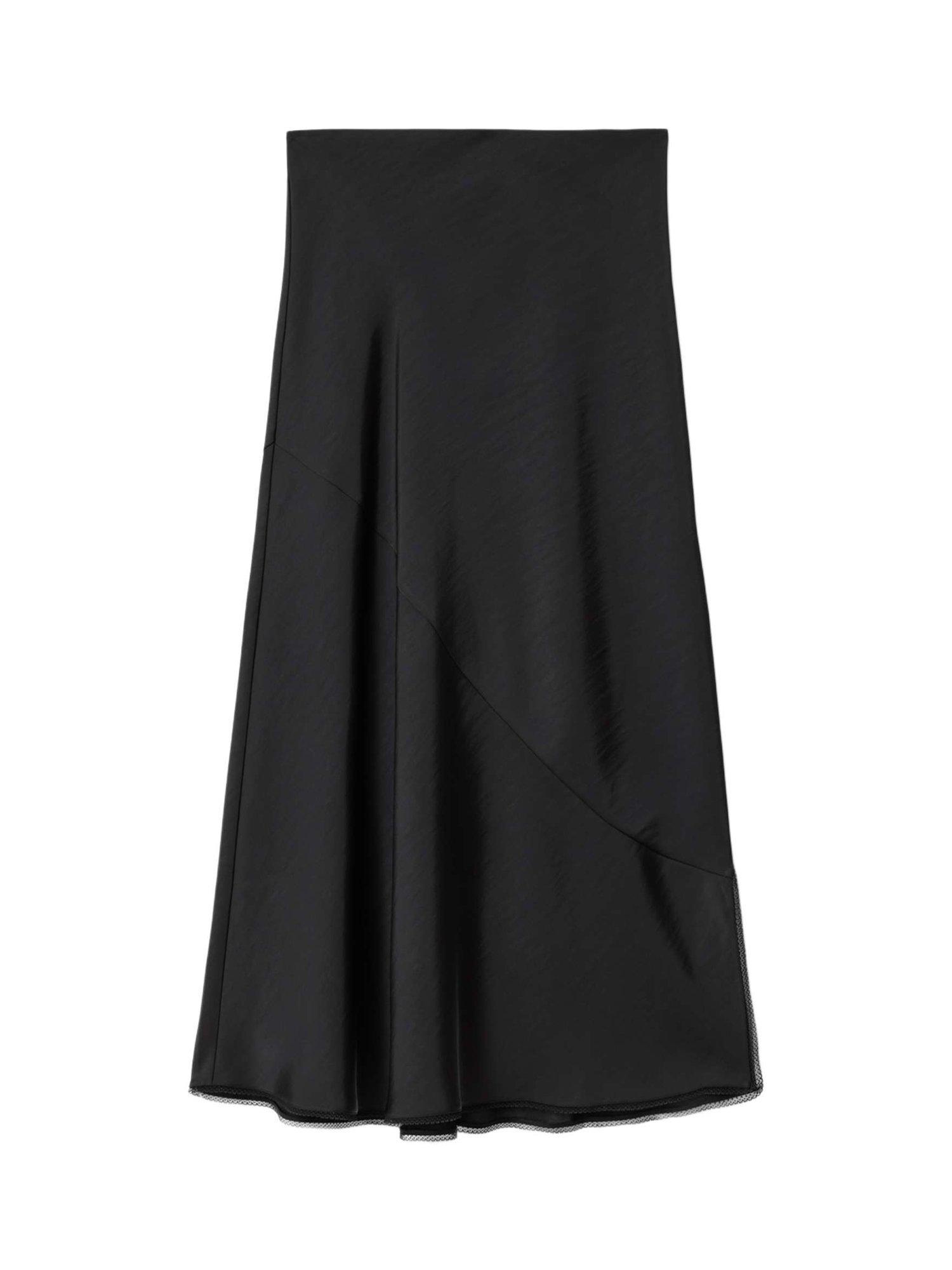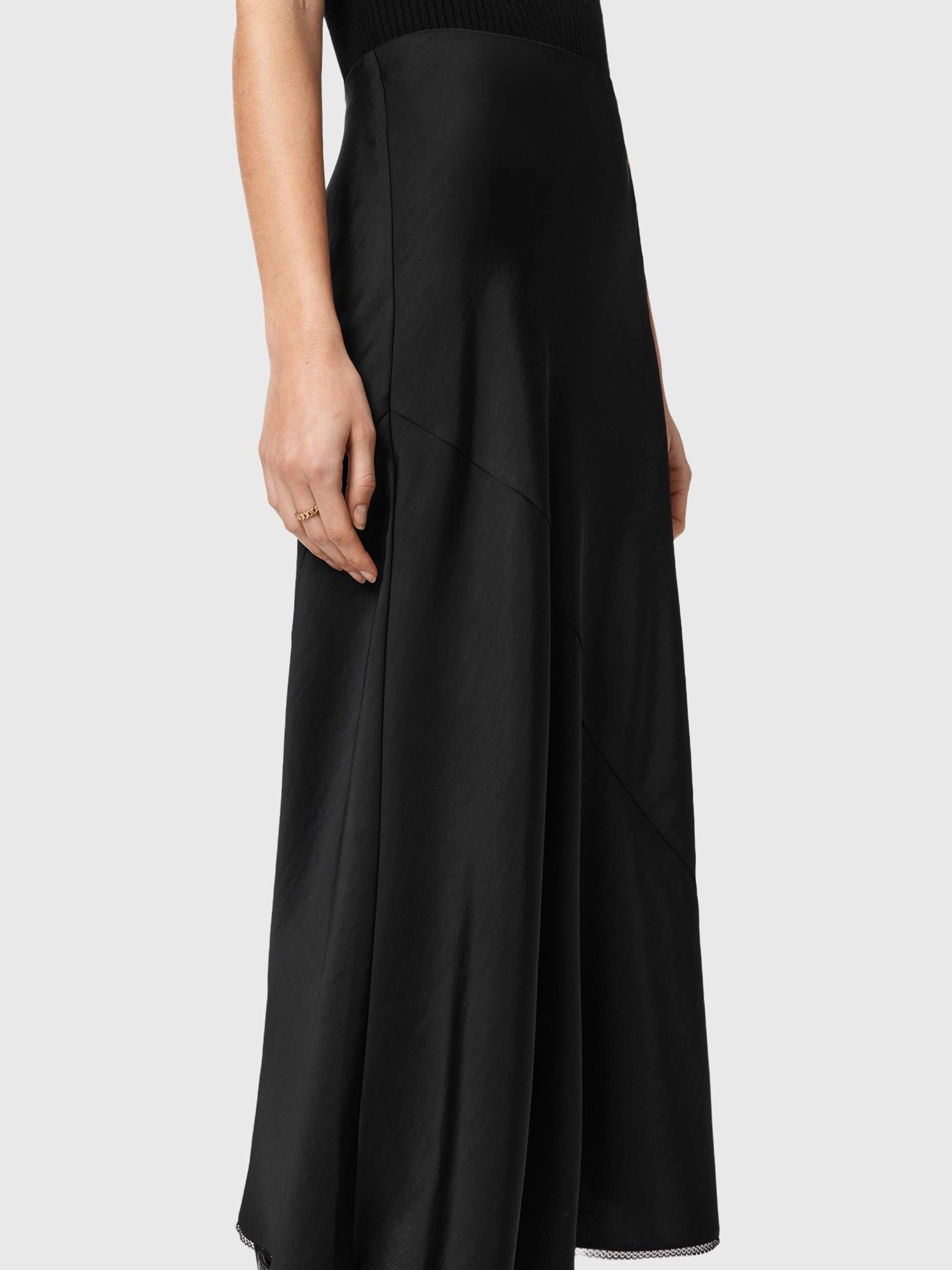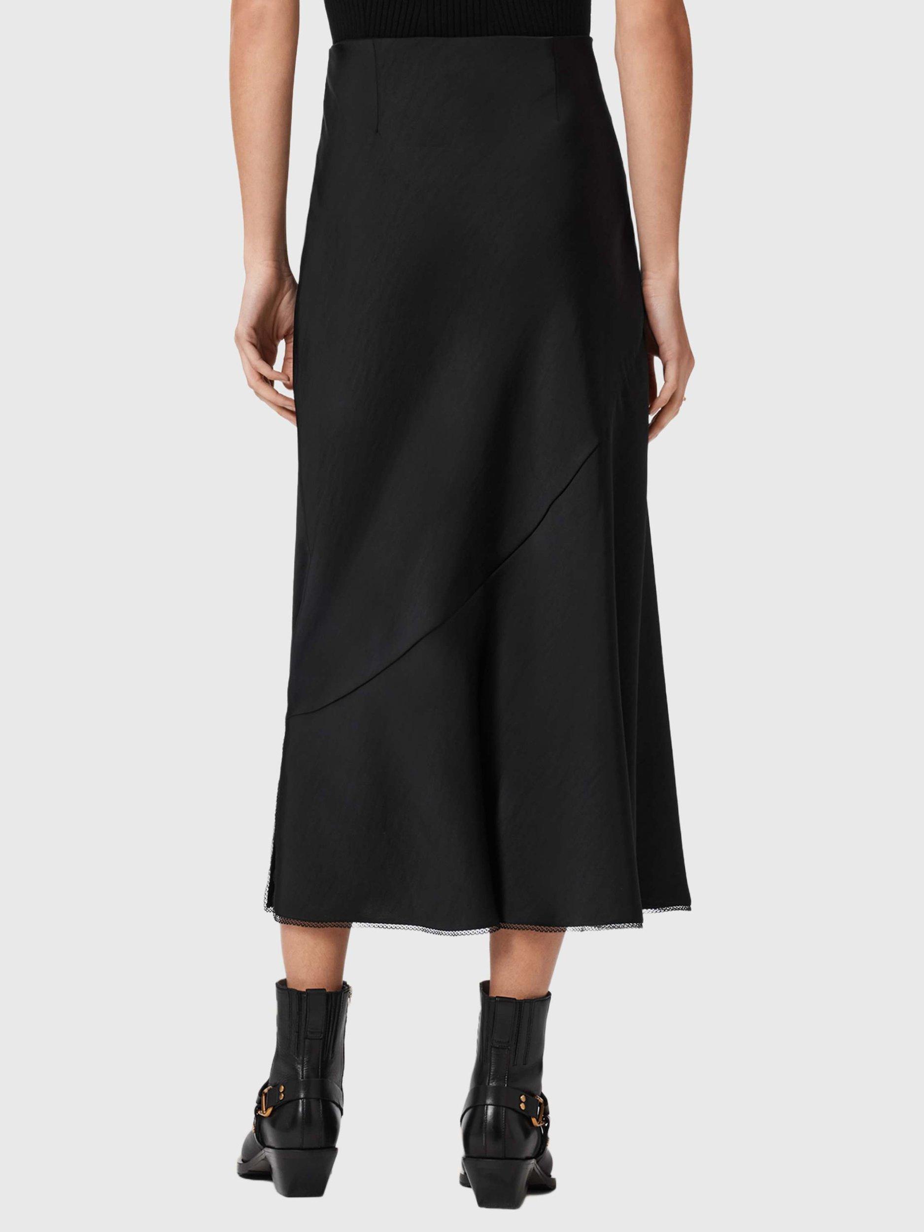A satin A-line skirt by AllSaints. Its clean lines and clever fit let you style your day your way, falling to a versatile midi length with split hems.