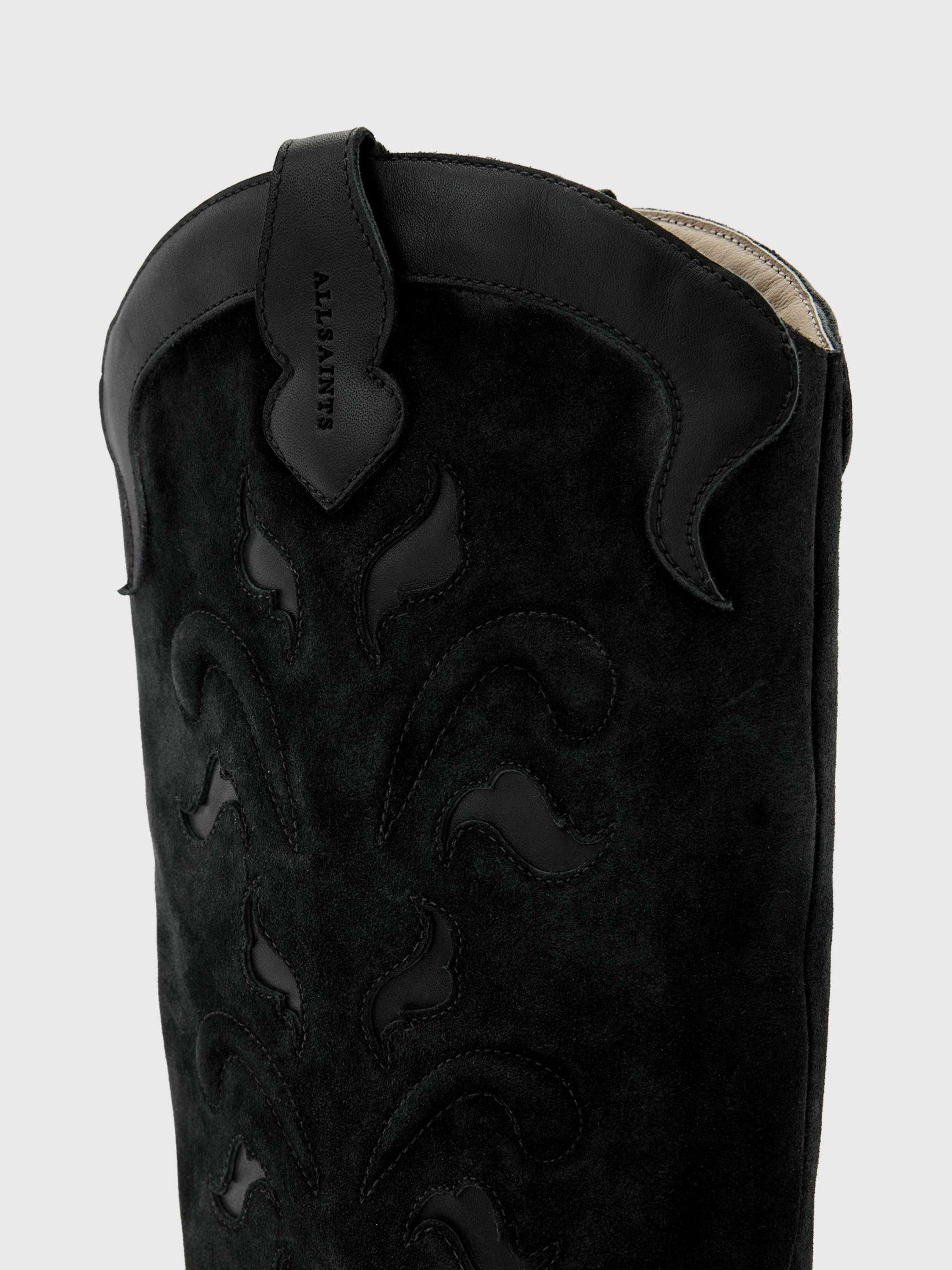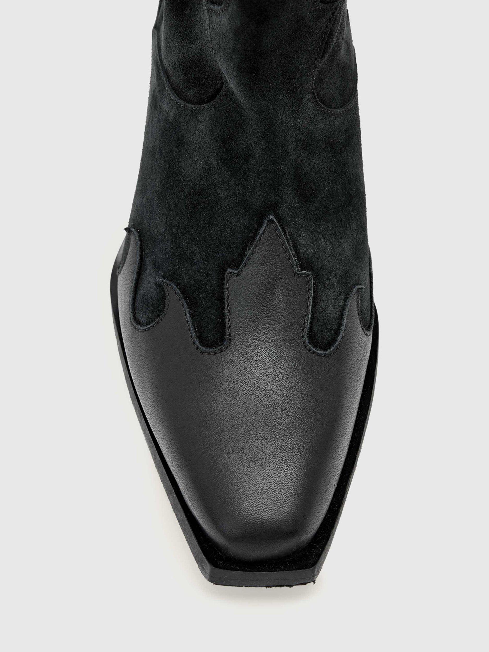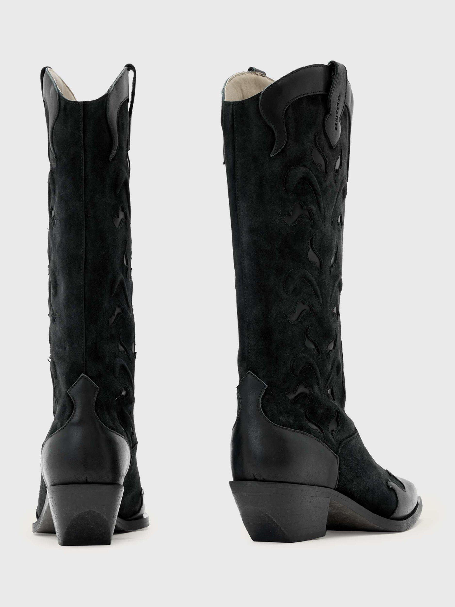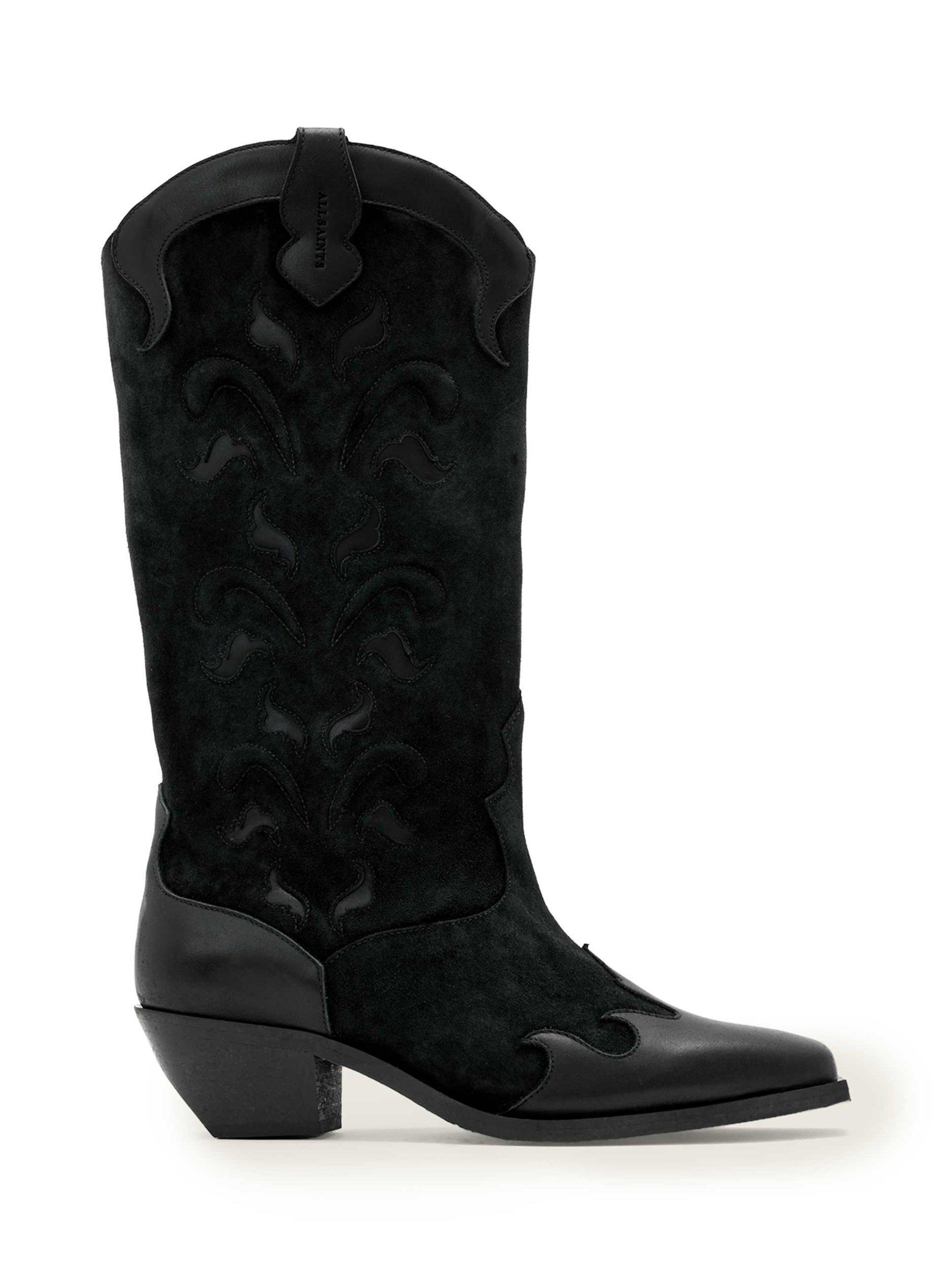 A pair of mid-heel cowboy boots, crafted from leather with a soft leather lining and a squared-off pointed closed toe. Finished with a confidence-boosting Cuban heel.