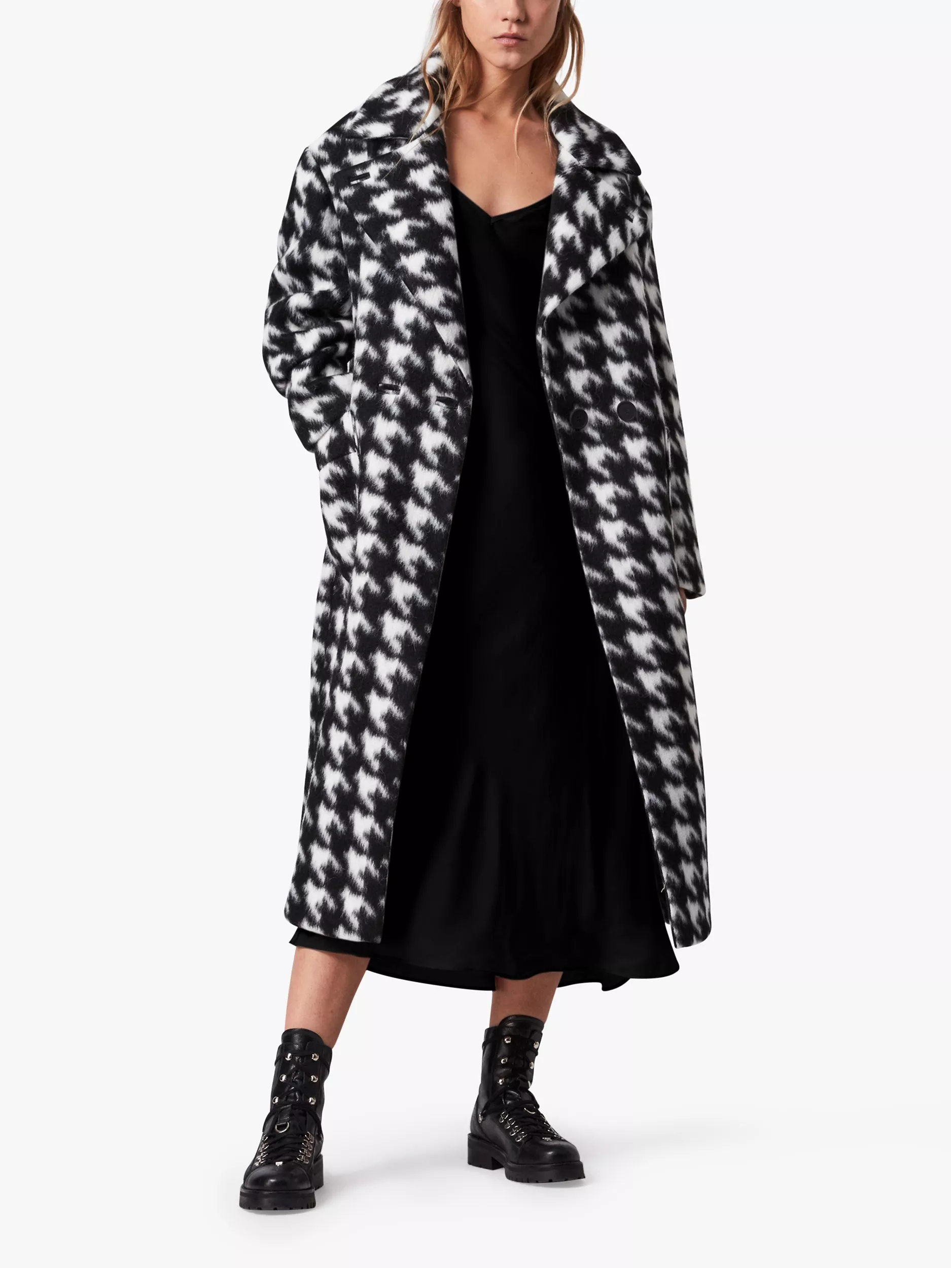 Tap into the relaxed fit trend with this cosy coat from AllSaints. Featuring an eye-catching monochrome houndstooth design, oversized for a modern feel, it wraps over at the front with double front buttons with a roomy collar for extra warmth. Great over denim and cosy knits.