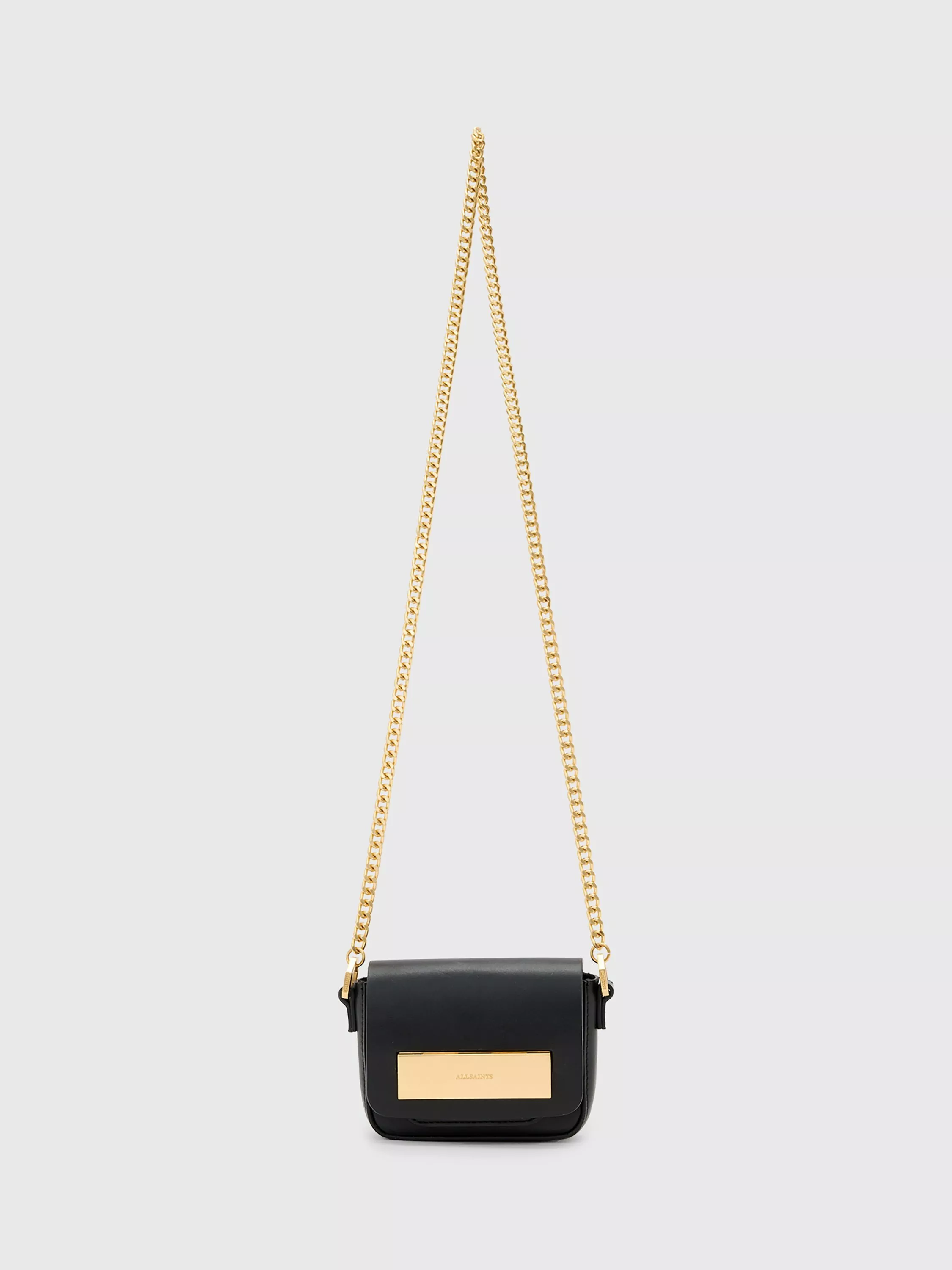 This leather crossbody from AllSaints is designed to suspend from the shoulder or fit neatly in your hand, combining distinct style with everyday practicality. Finished with a detachable long chain and a branded hinge lock closure.