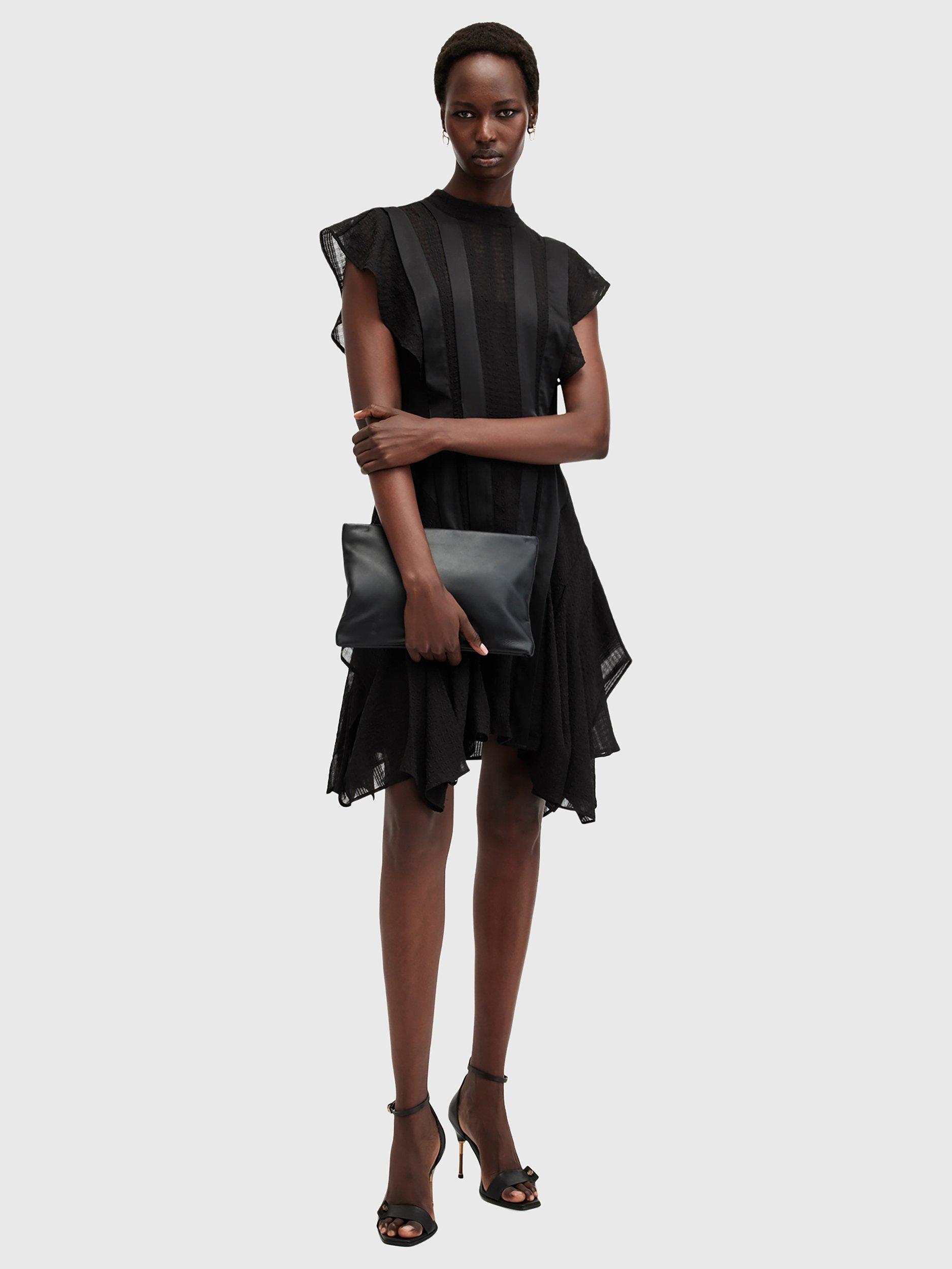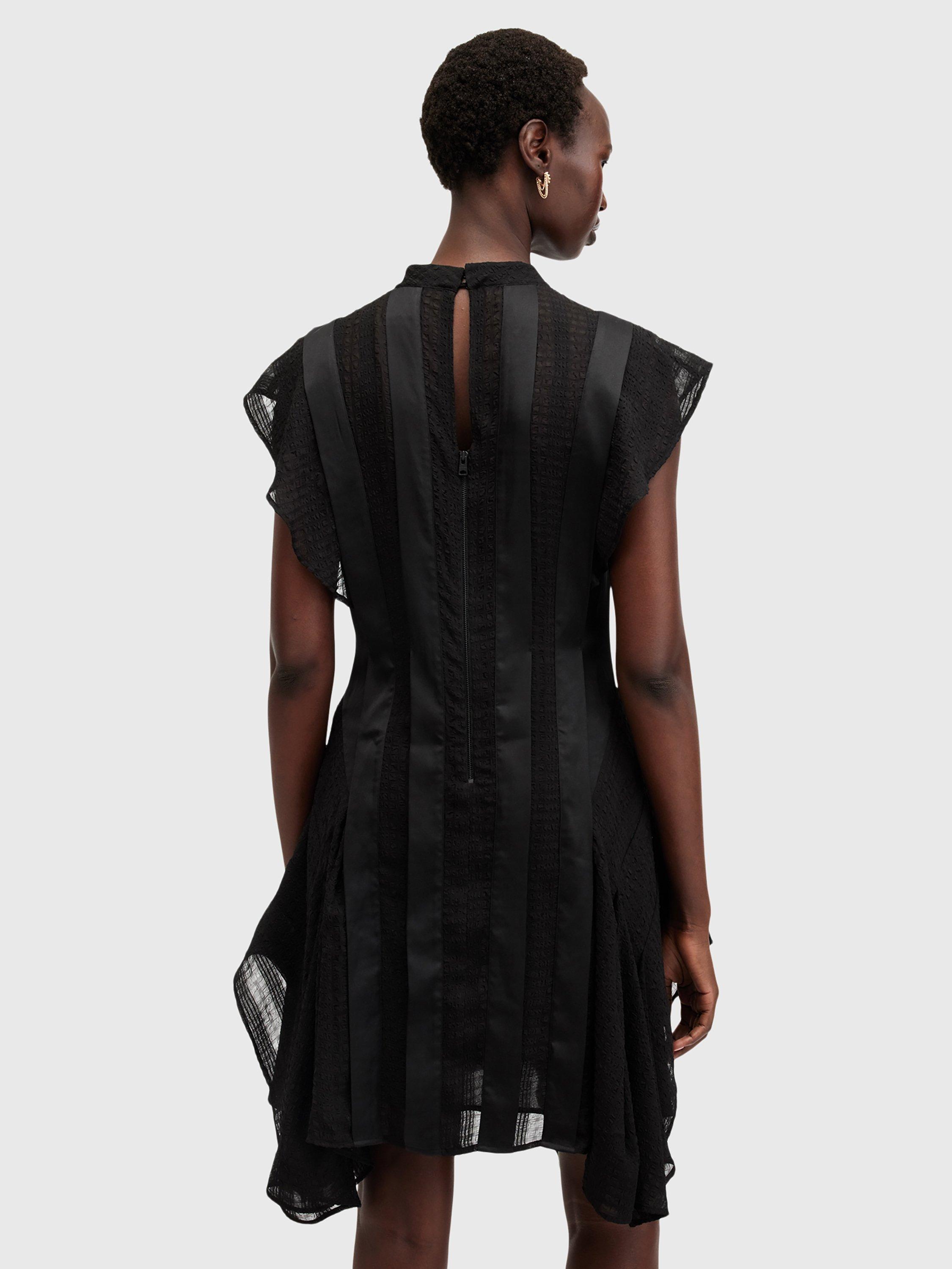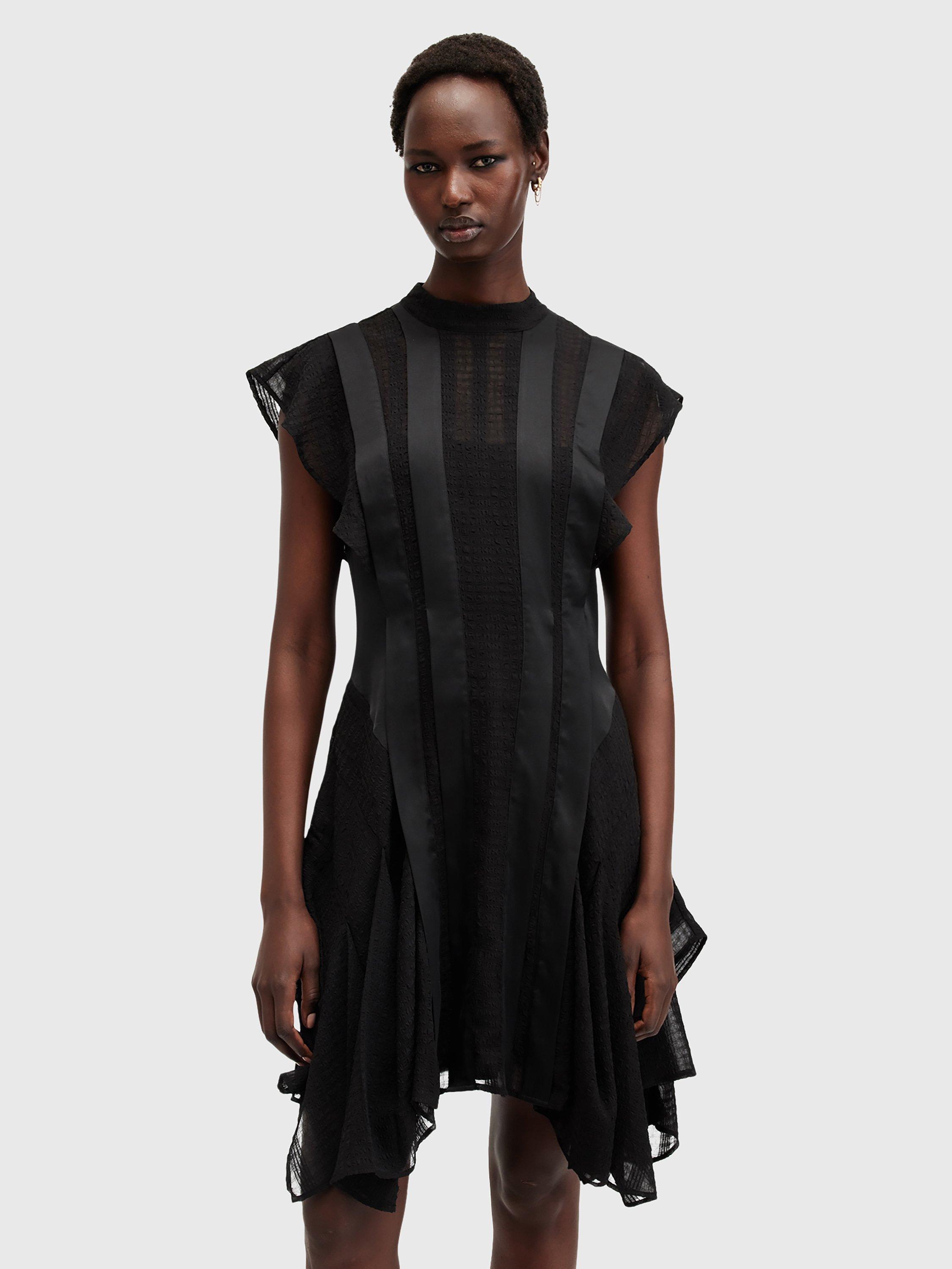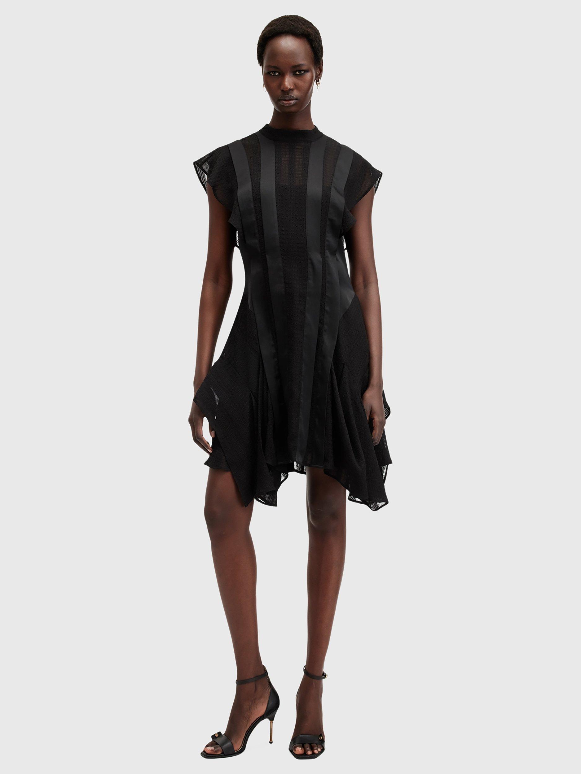 With stripe satin and semi sheer panels through the front, this dress from AllSaints falls to an asymmetric flippy mini length. Carved with a round neck and cap sleeves, it may be simple in form but its ruffled skirt creates plenty of movement and texture.