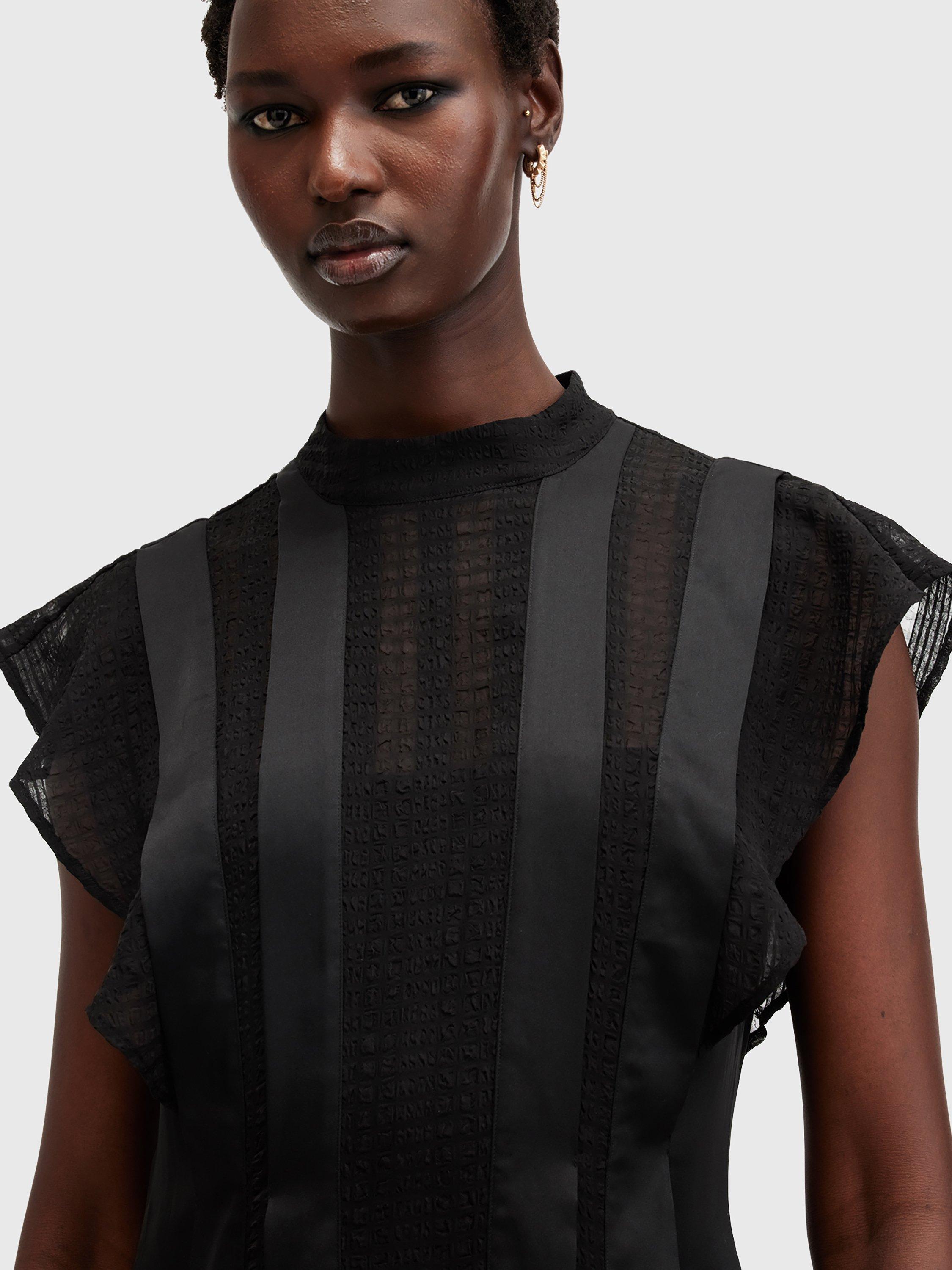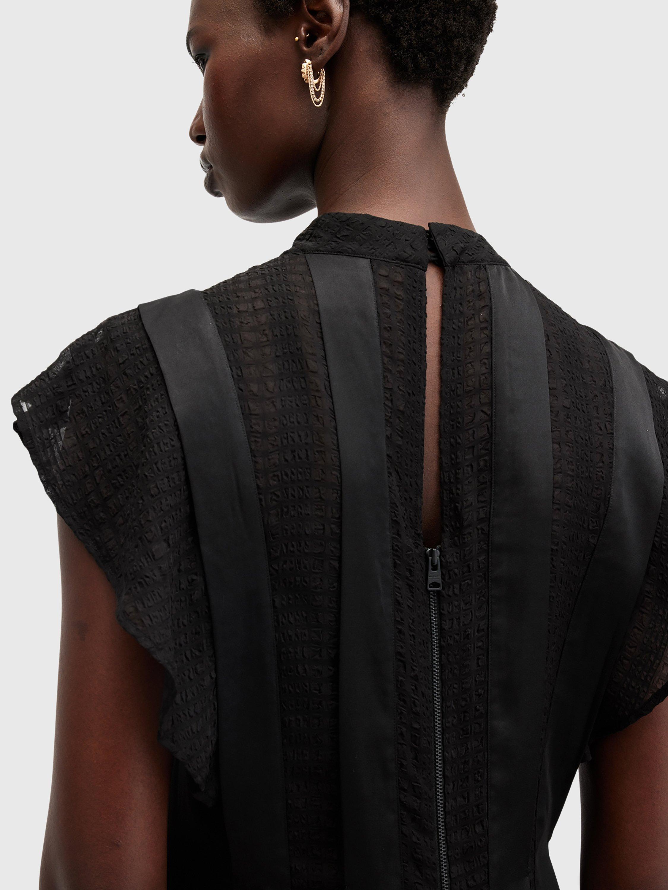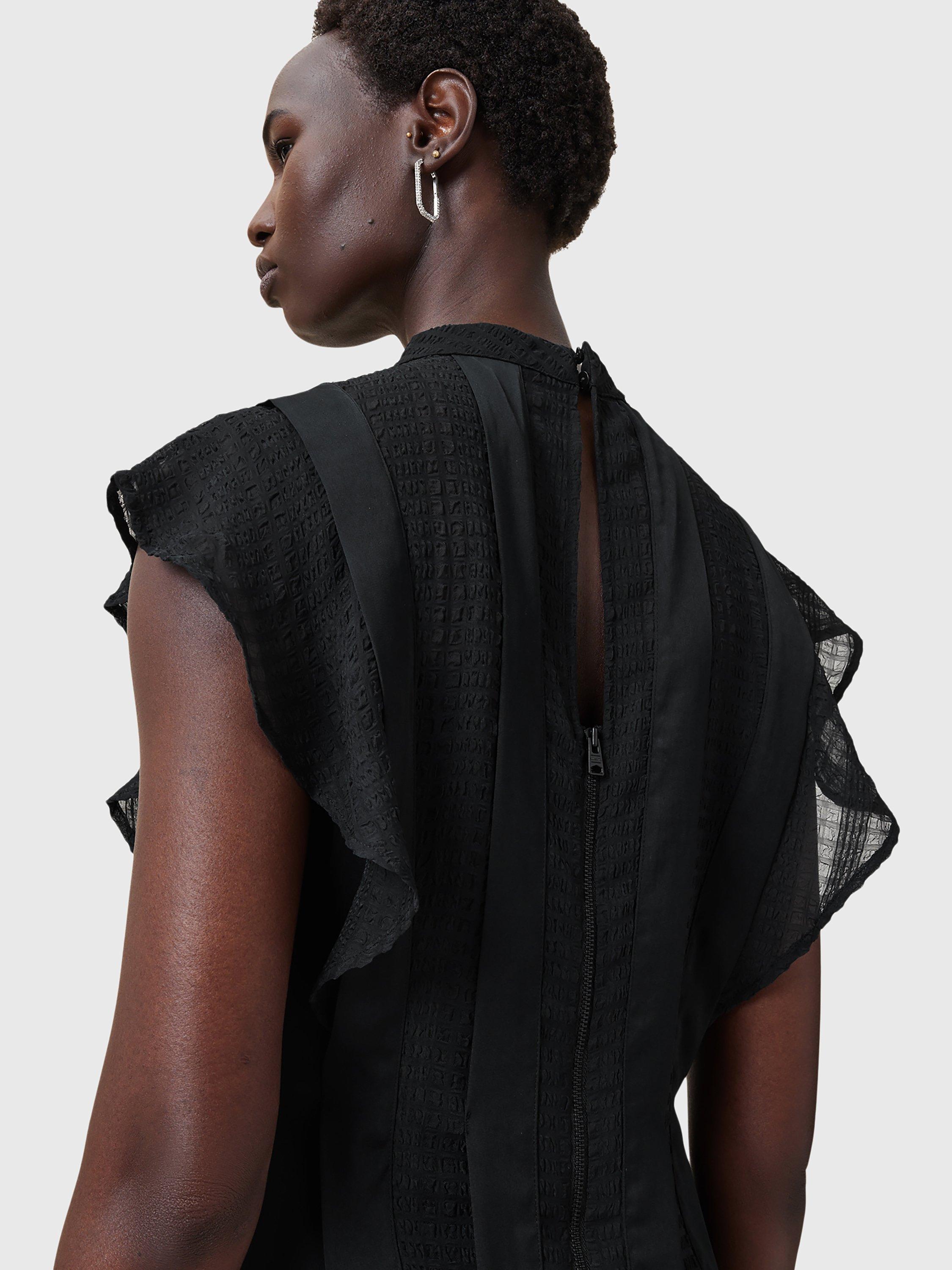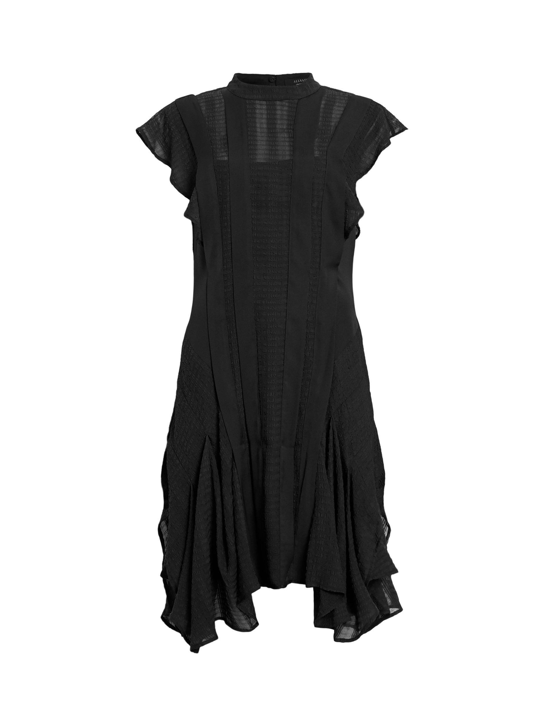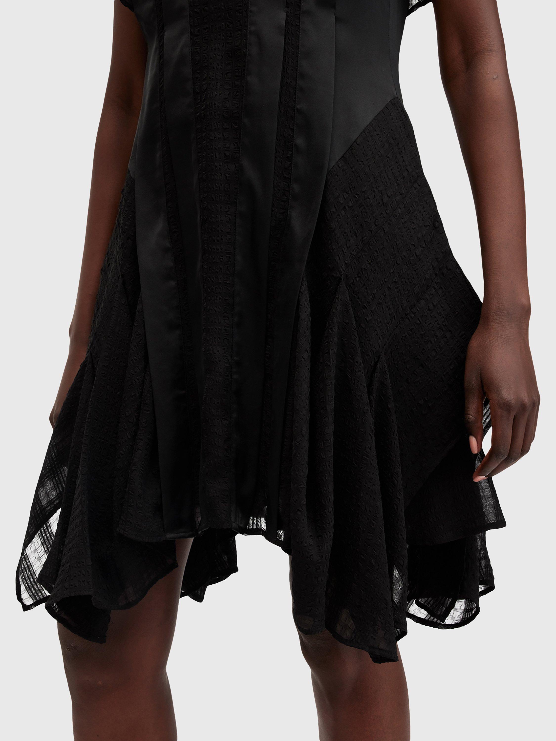 With stripe satin and semi sheer panels through the front, this dress from AllSaints falls to an asymmetric flippy mini length. Carved with a round neck and cap sleeves, it may be simple in form but its ruffled skirt creates plenty of movement and texture.