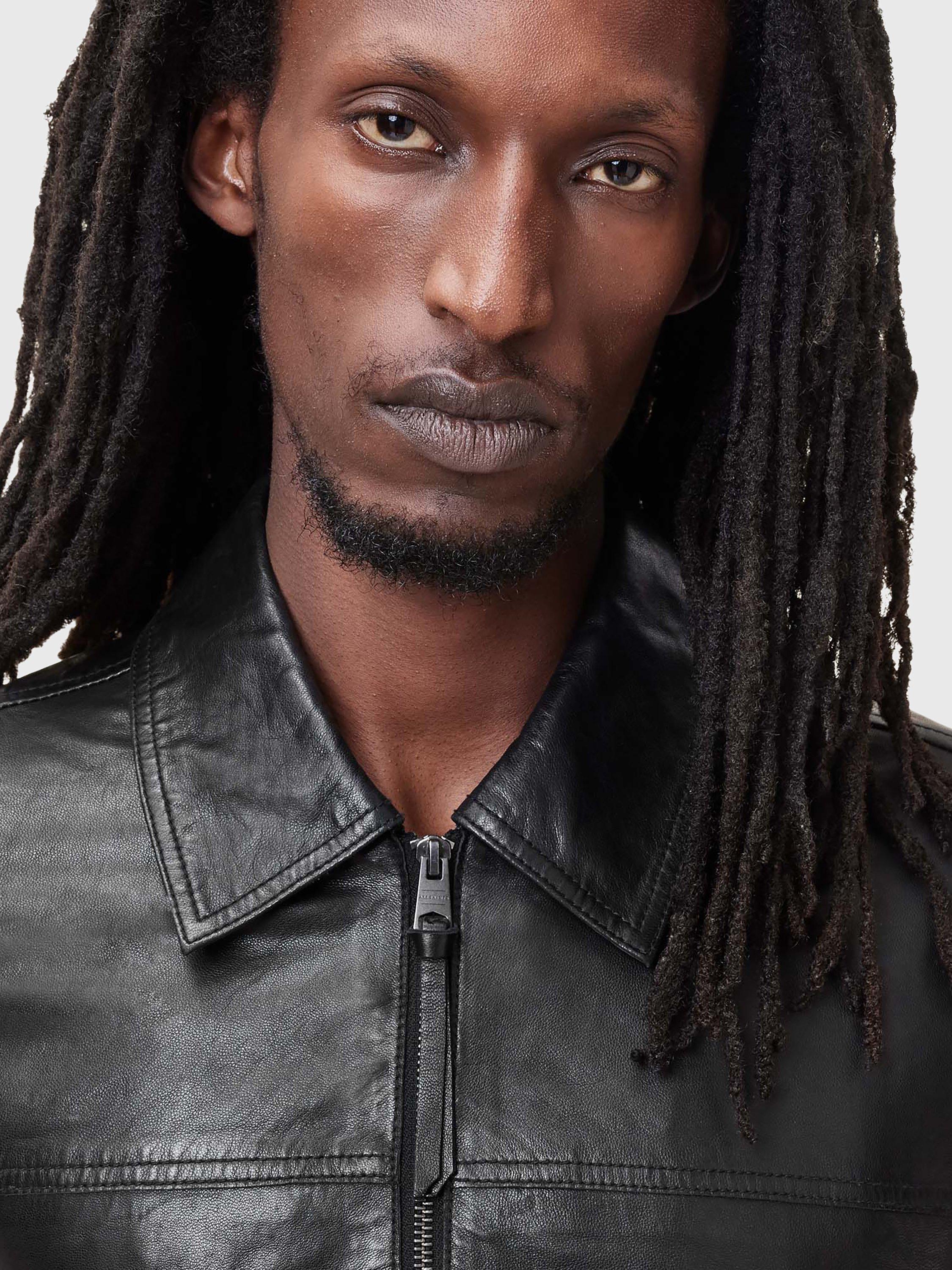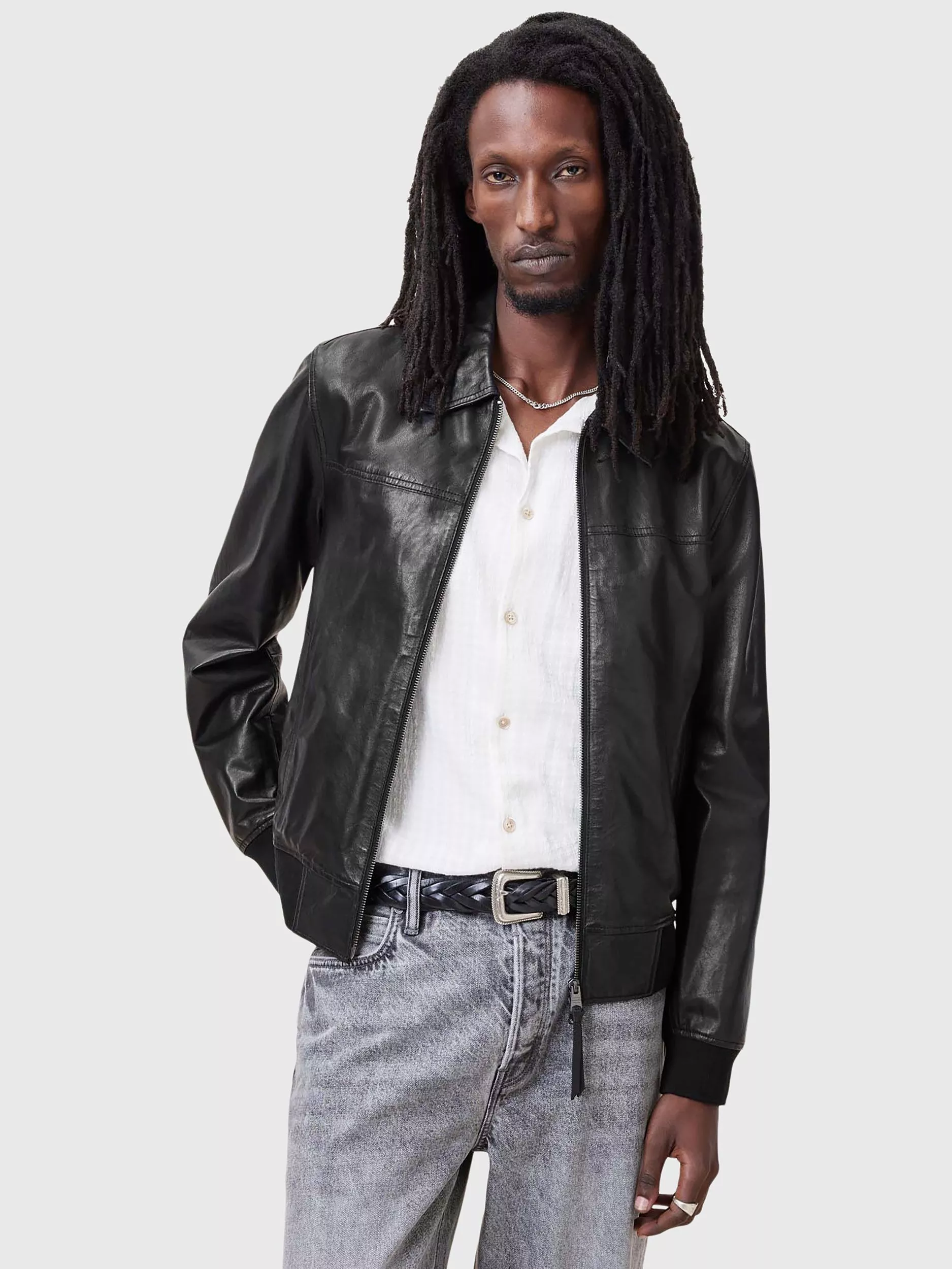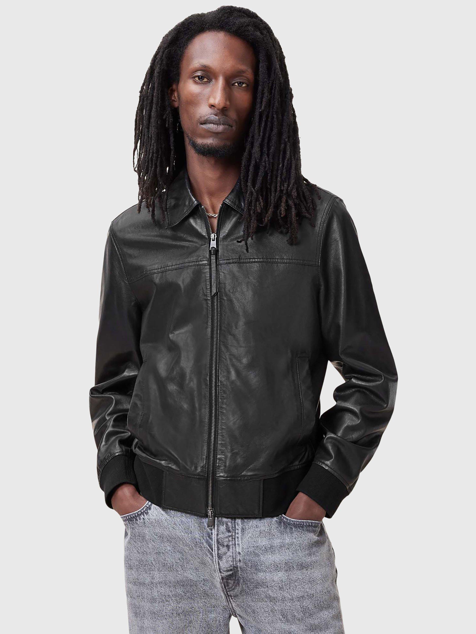 Bring depth to your outerwear collection with urban styles like this leather jacket from AllSaints. Cut to a slim-fitting silhouette from premium lamb leather, it features a collar neck, zip front and a full lining with a stretchy ribbed cuffs and hem.