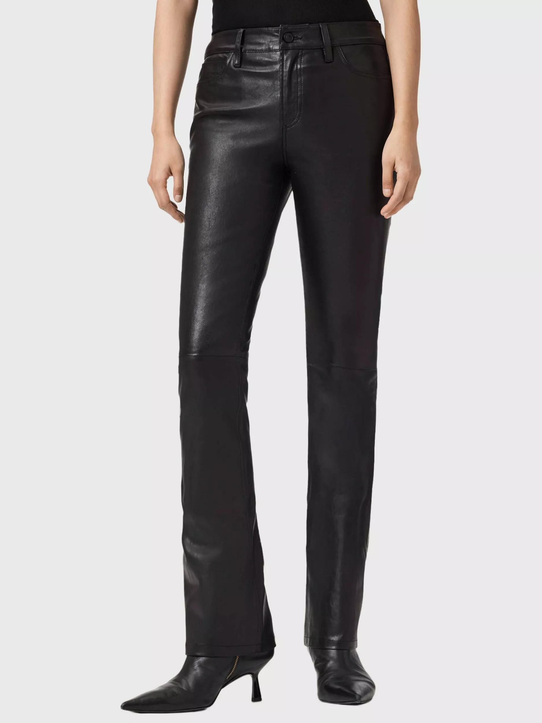 Structure meets flow in these bootcut trousers by AllSaints, made in pure leather. They sit mid rise with a zip fly and hems that are fall past the ankle.