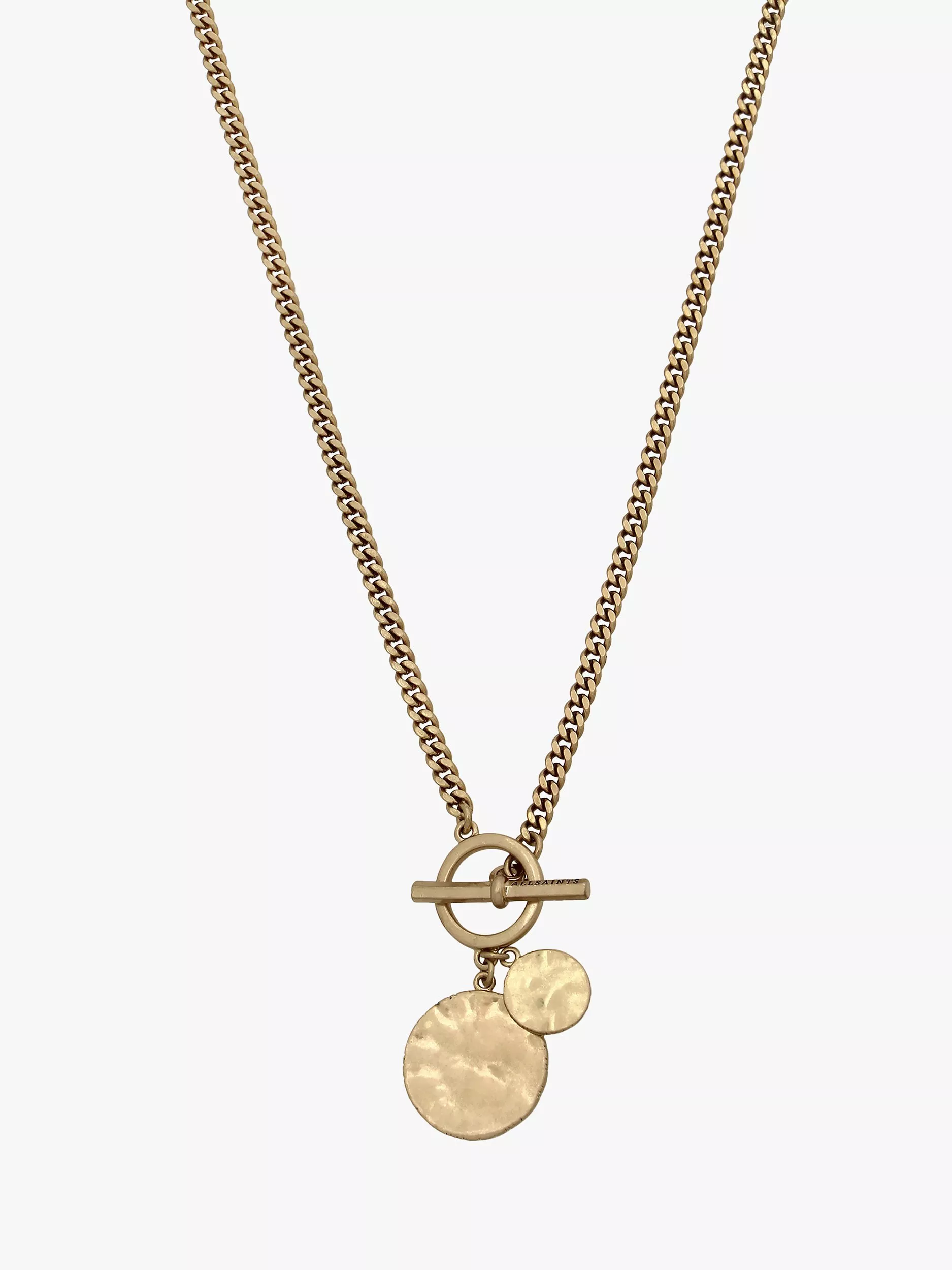 With hammered disc pendants, it also benefits from a front toggle clasp for a secure fit.