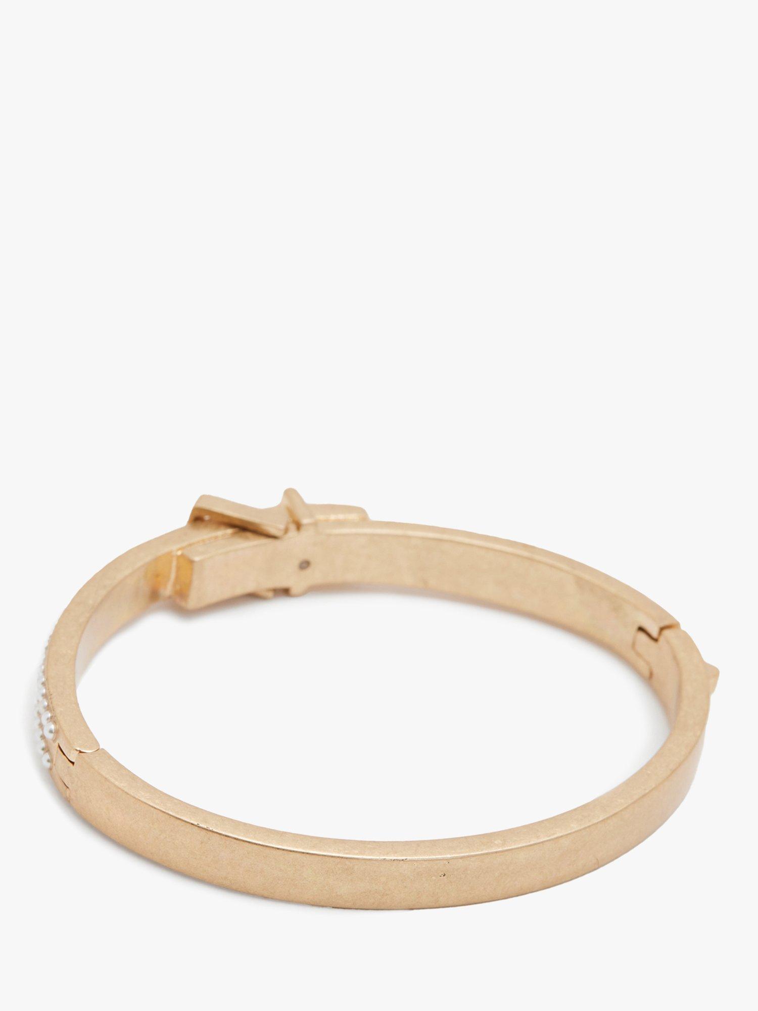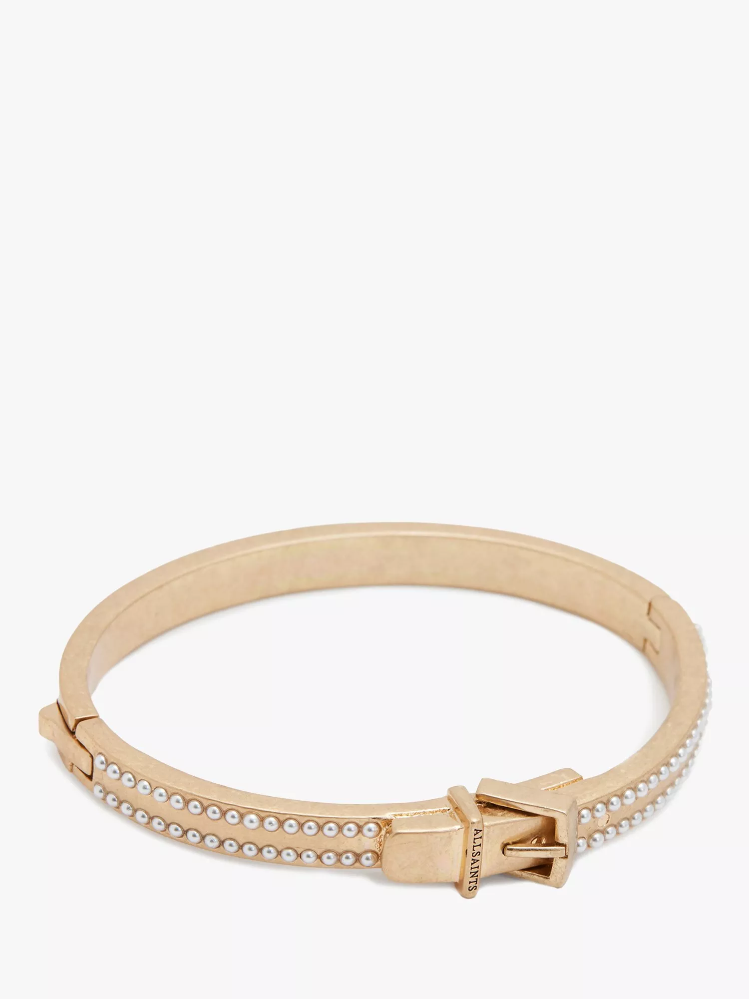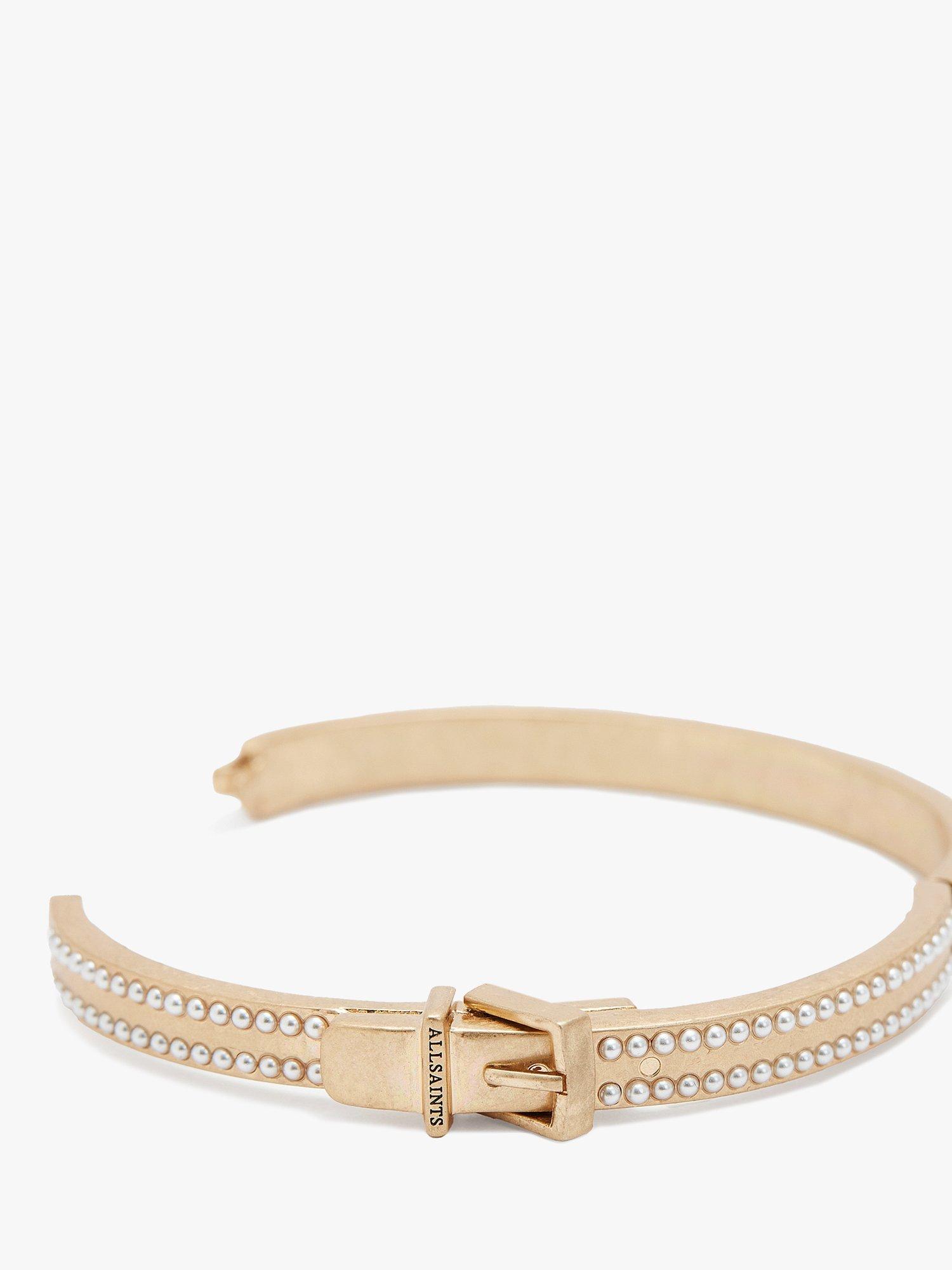 A striking hinged bangle bracelet from AllSaints adorned with double row mini pearls and buckle hardware at the front. Fastening with a safe hinge, it'll provide a secure fit.
