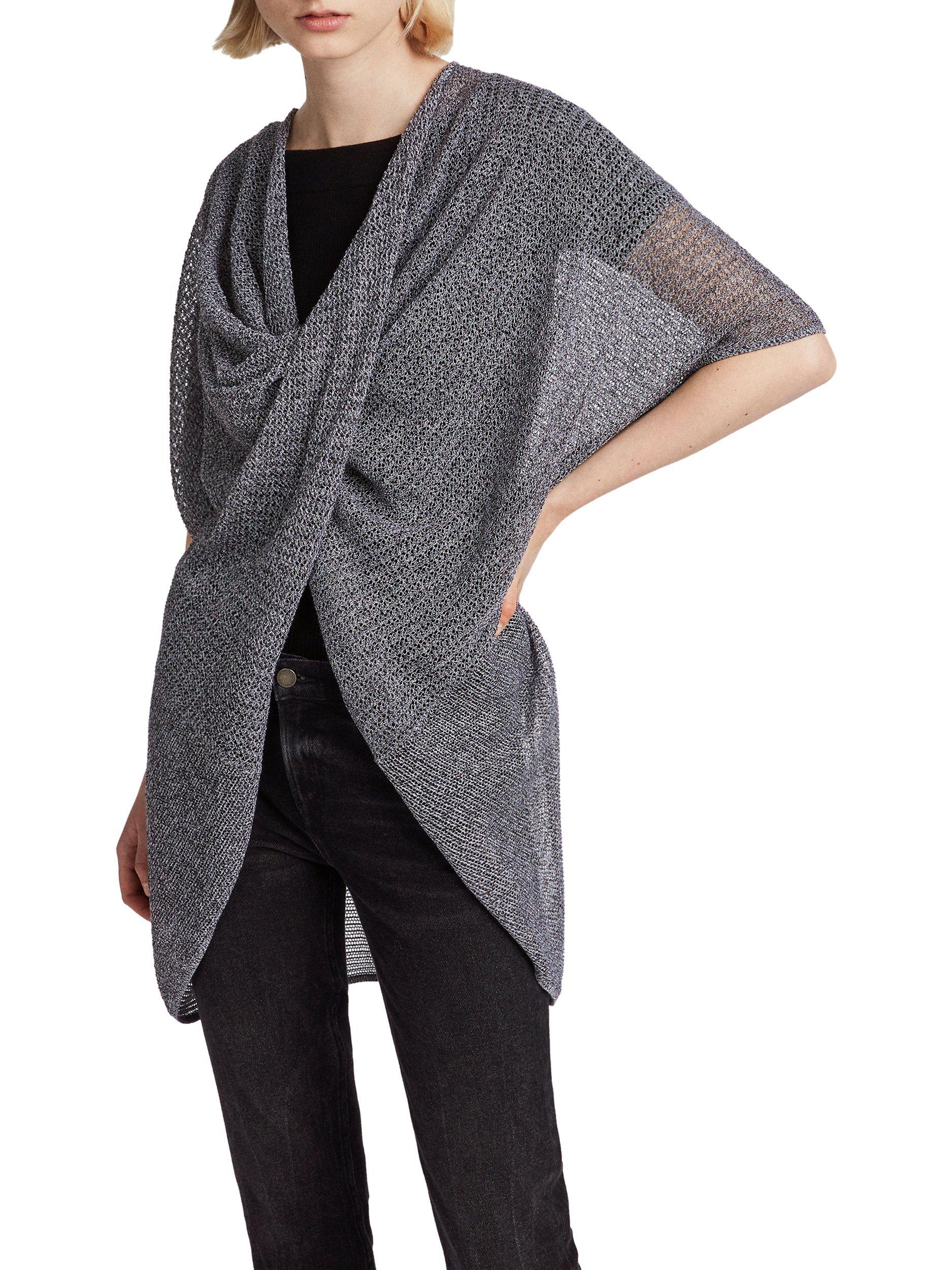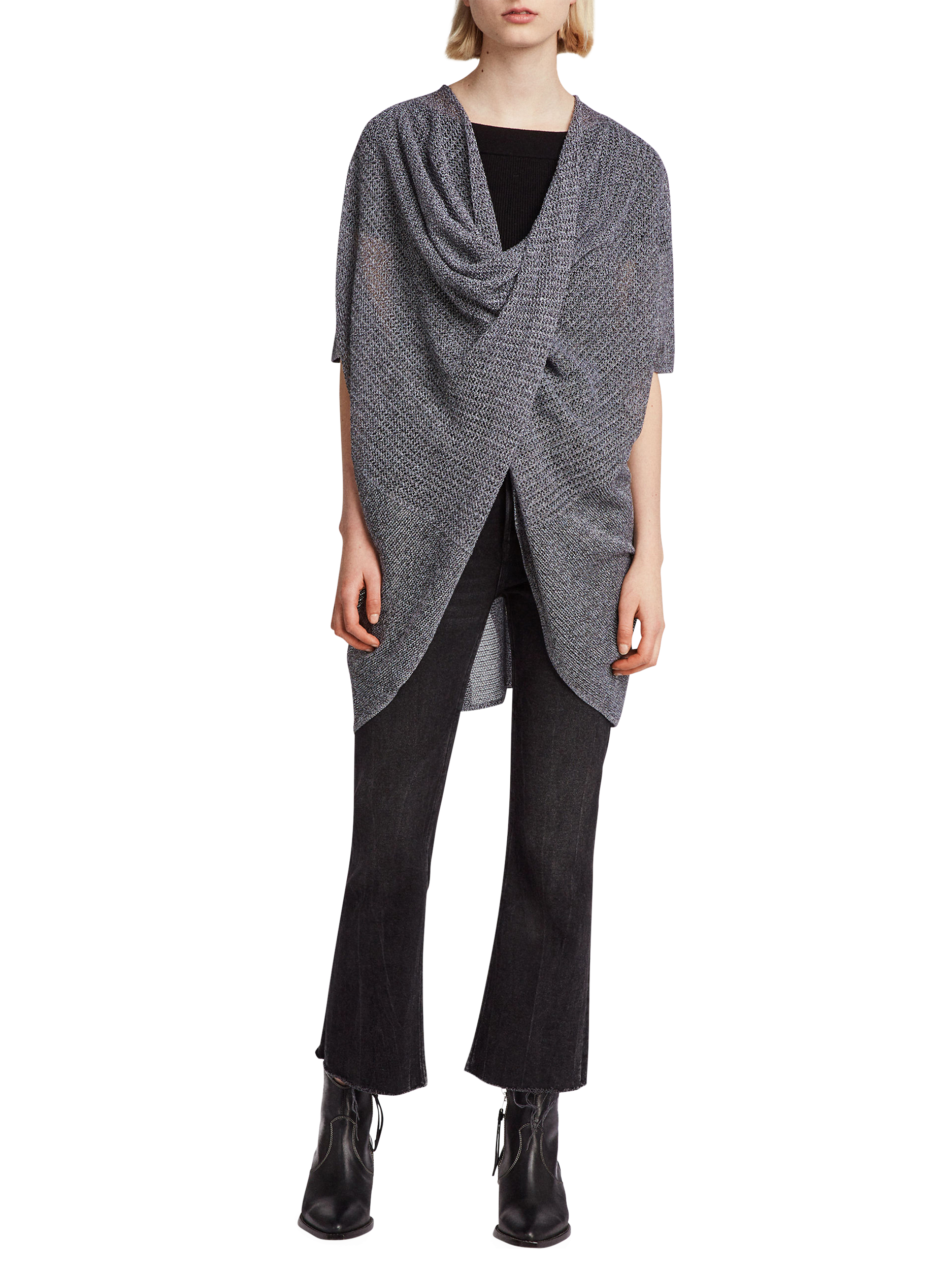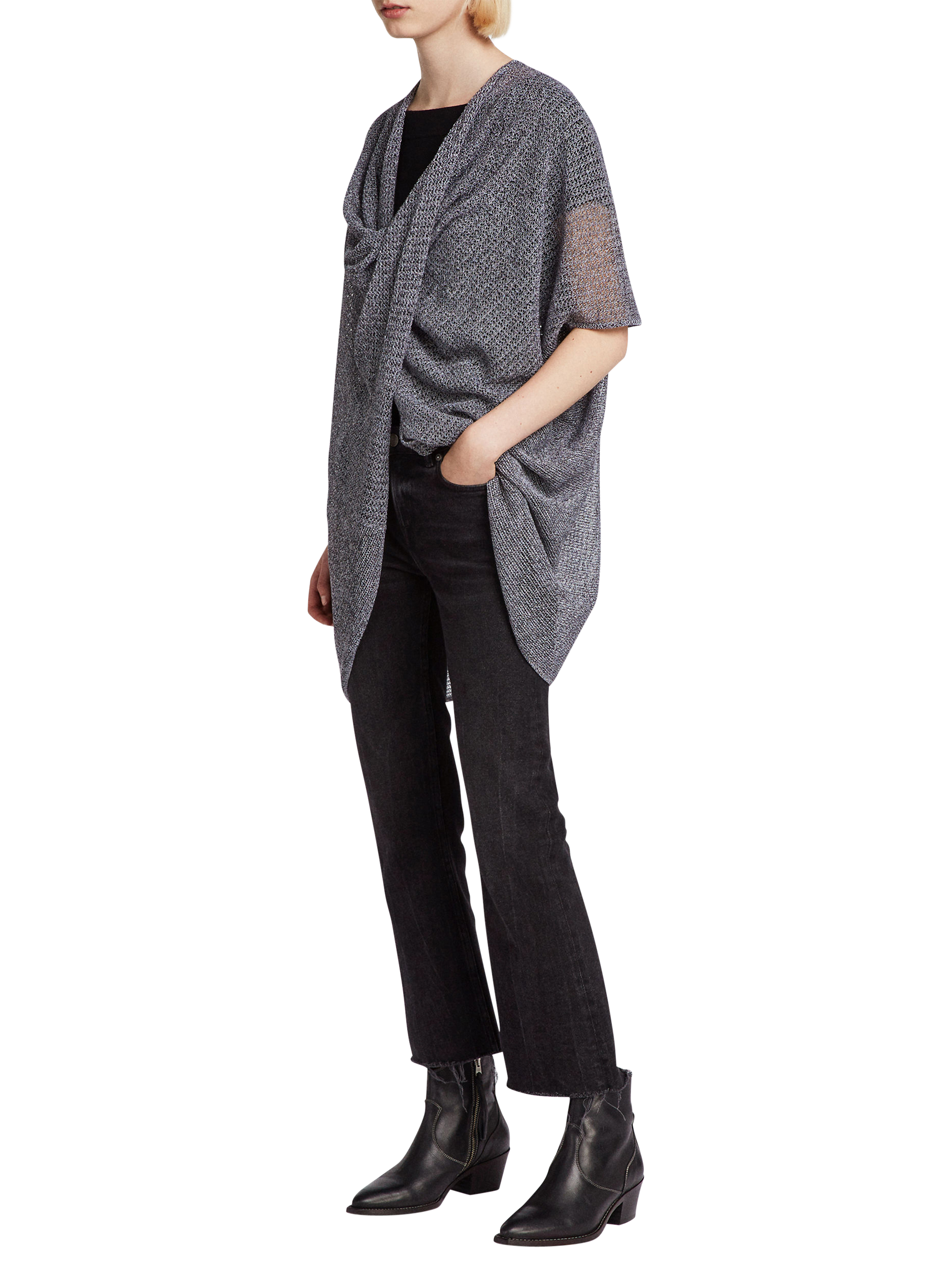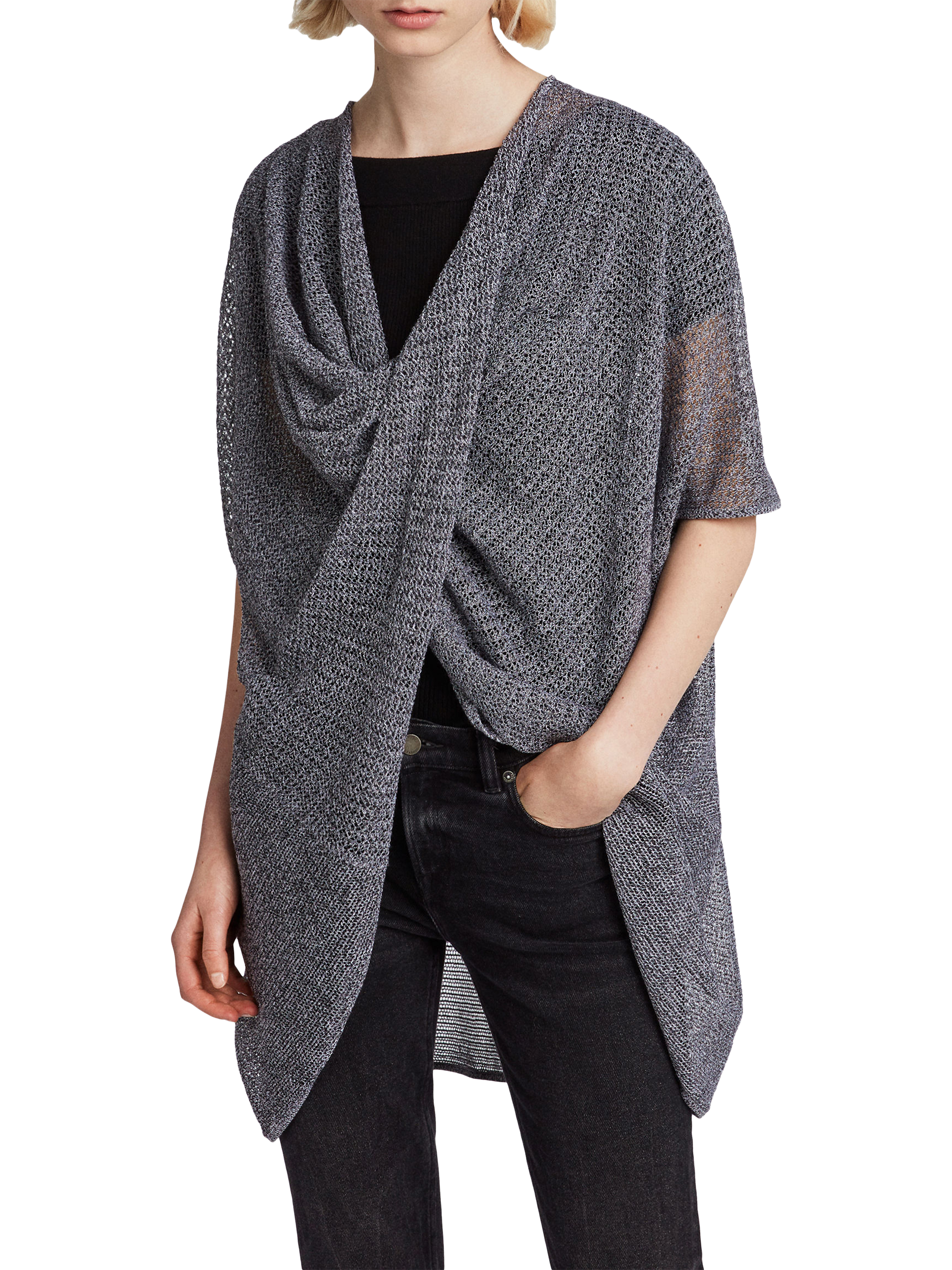 This adaptable design is crafted from a lightweight blend, in a find open knit. Effortlessly transforming from a top with a twisted front, to an open cardigan.